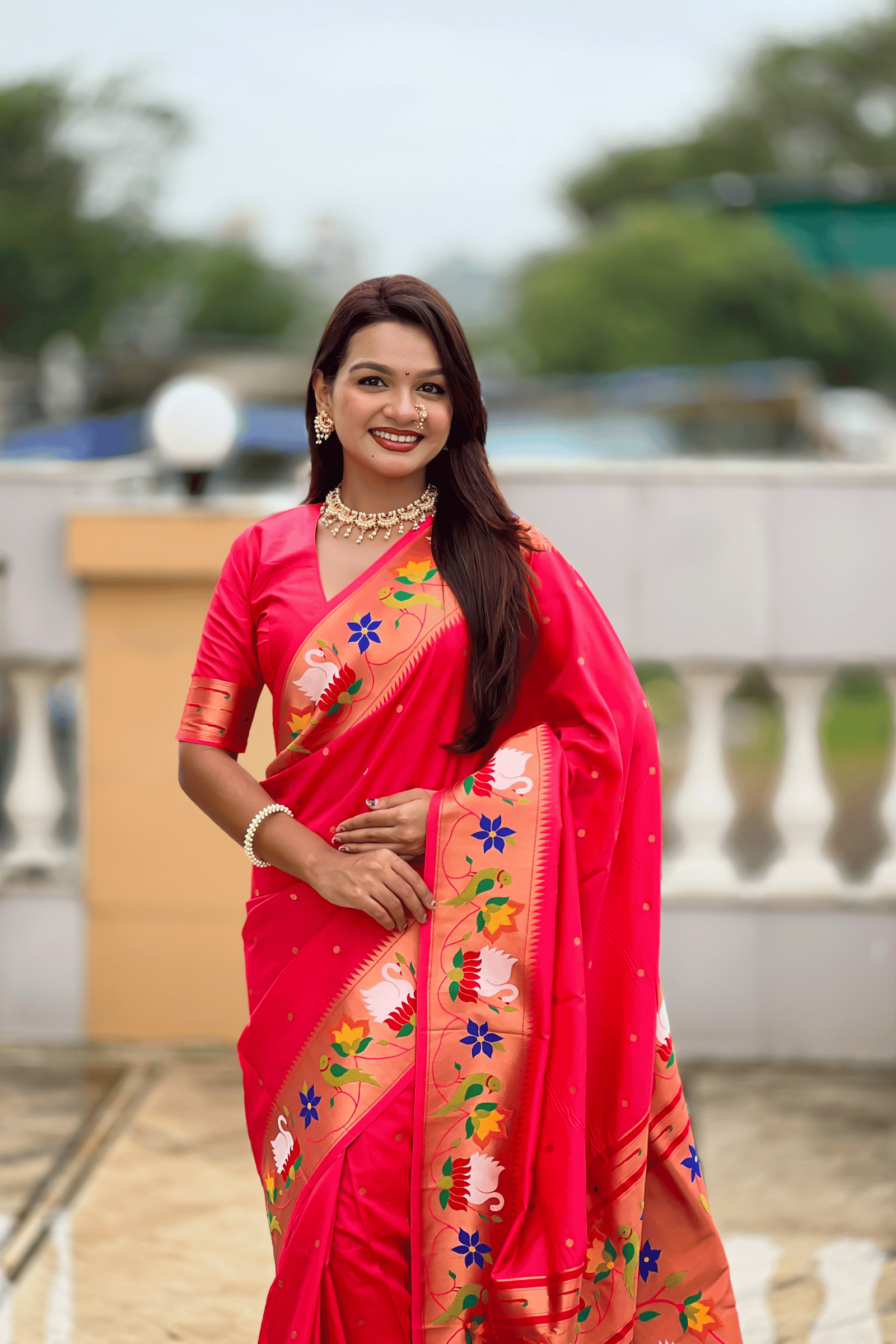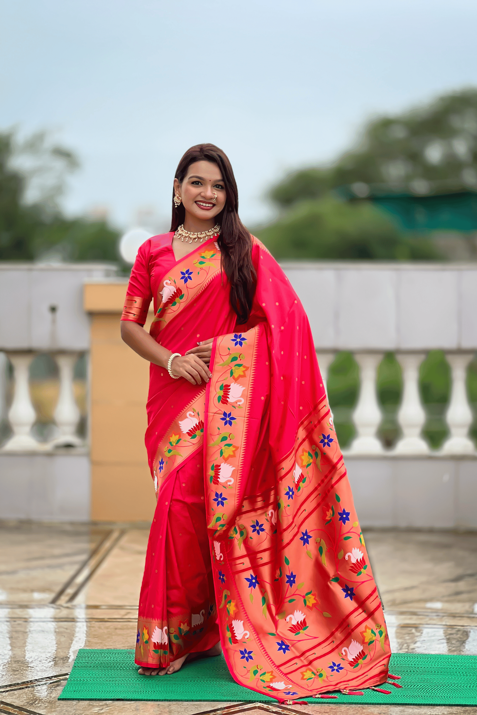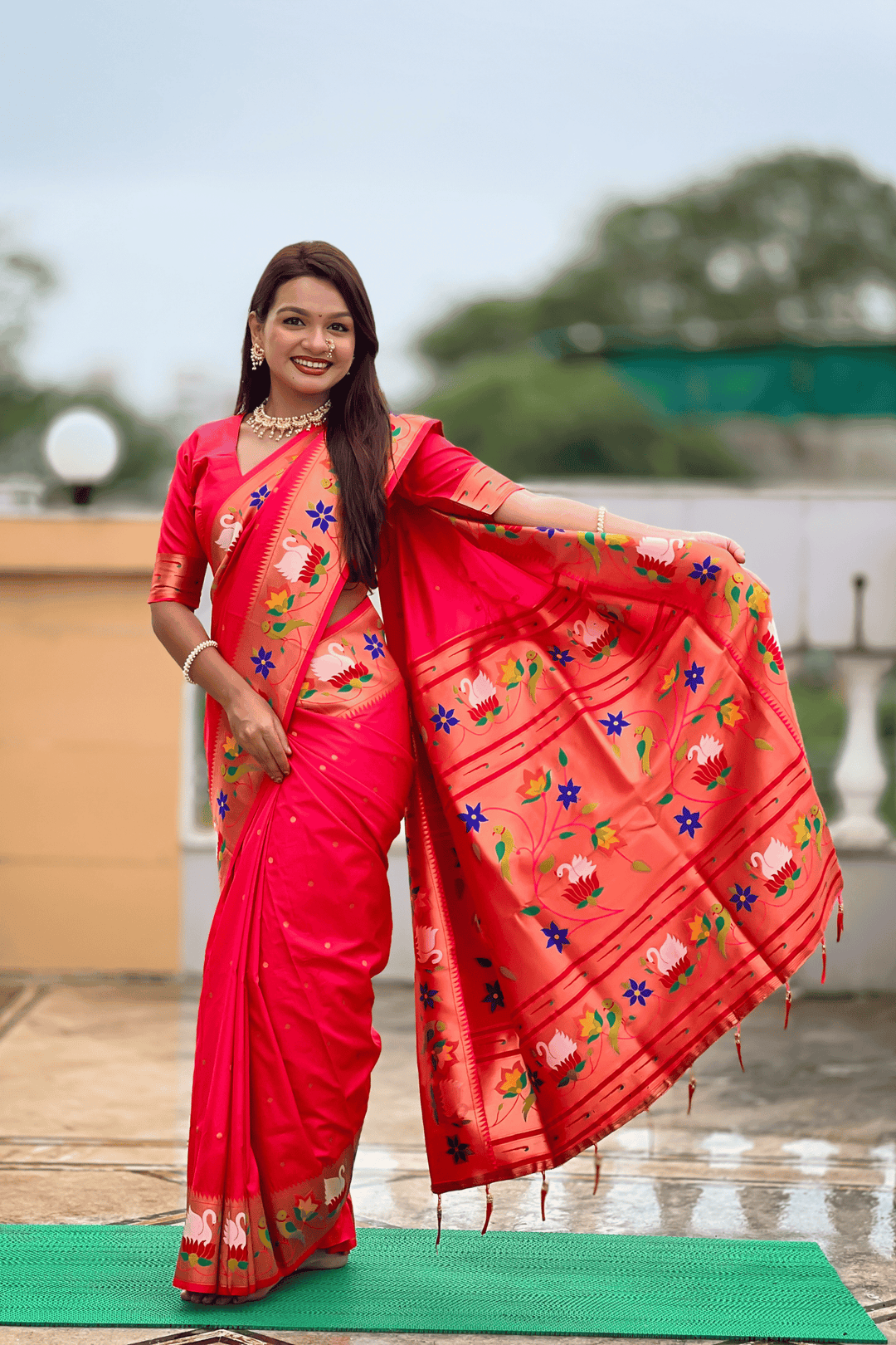 Experience the grandeur of Maharashtra’s royal weave with Shahi Paithani – Ready to Wear Paithani Silk Saree. Crafted in lustrous silk and adorned with intricate zari work, this saree features a majestic pallu woven with graceful parrot and swan motifs, symbolizing beauty, purity, and prosperity.