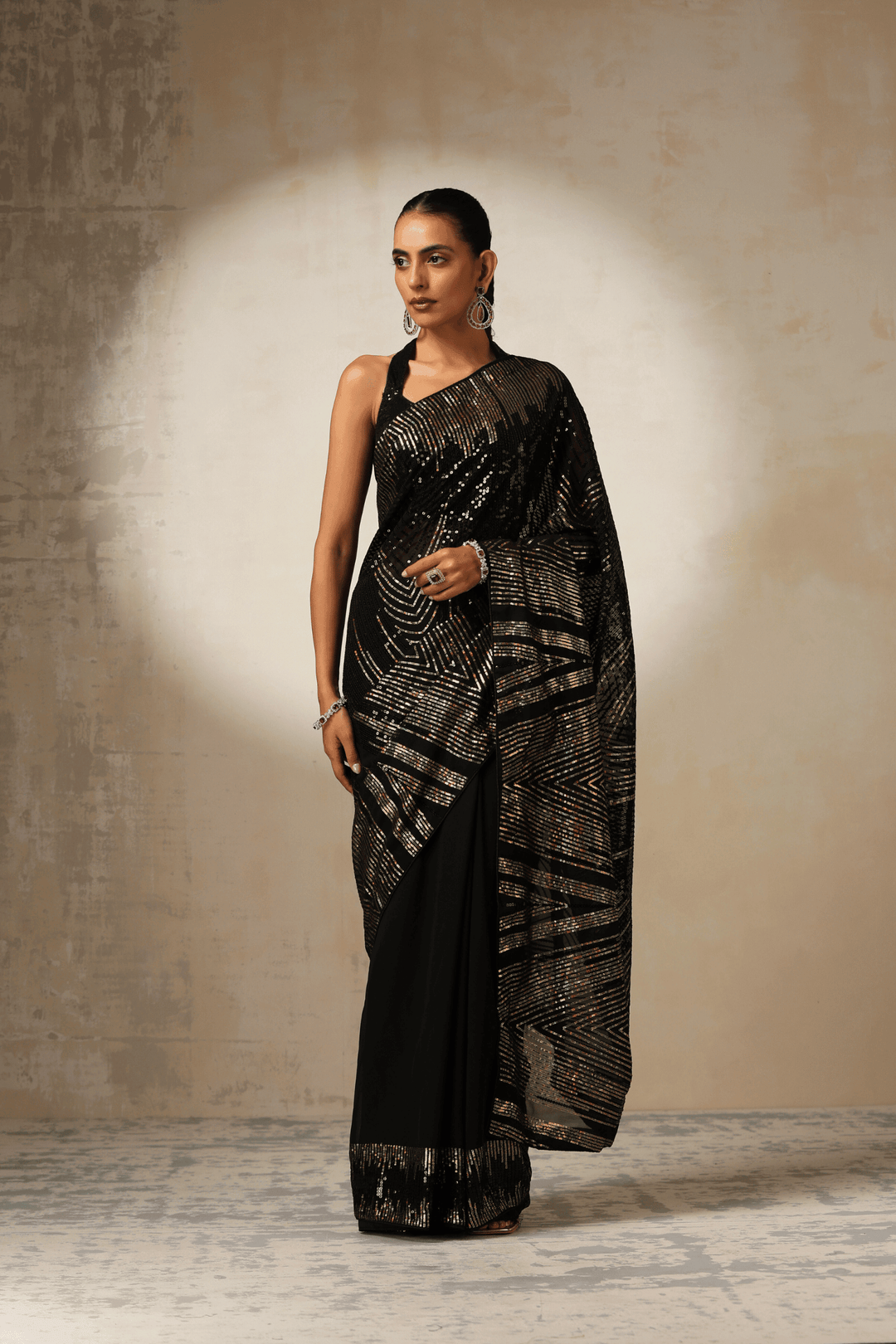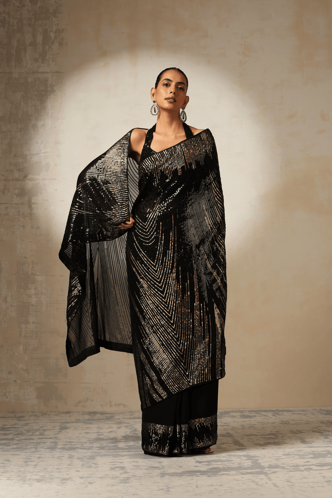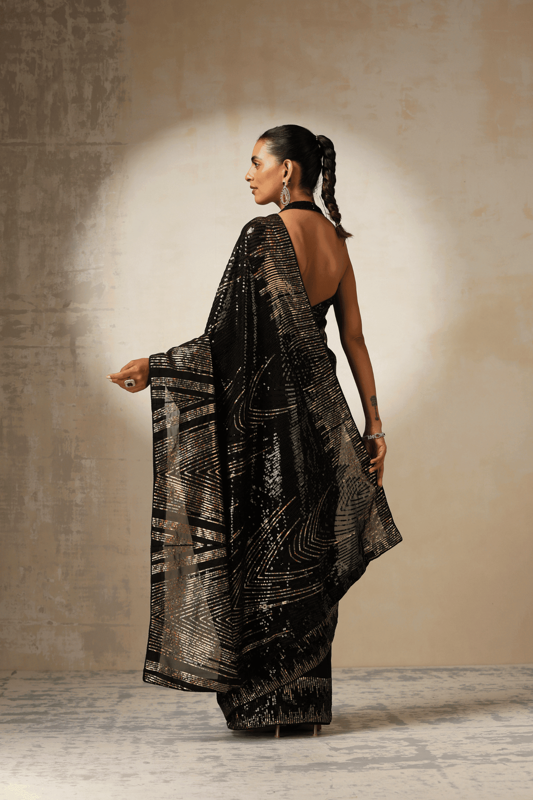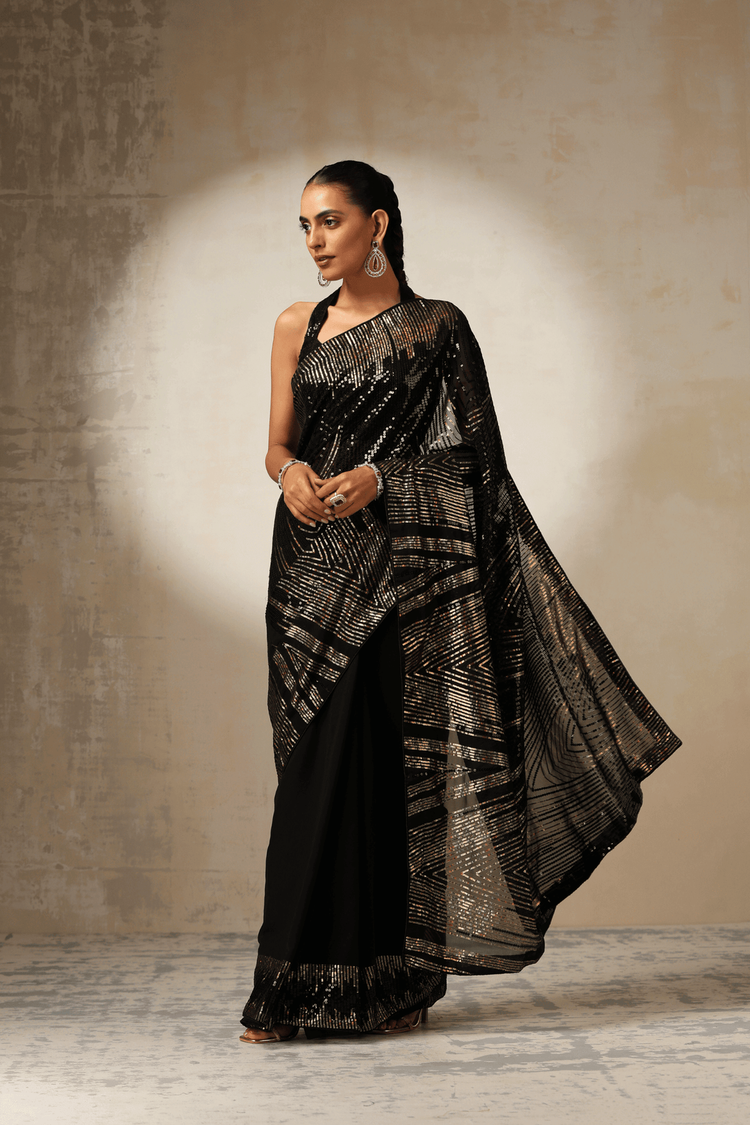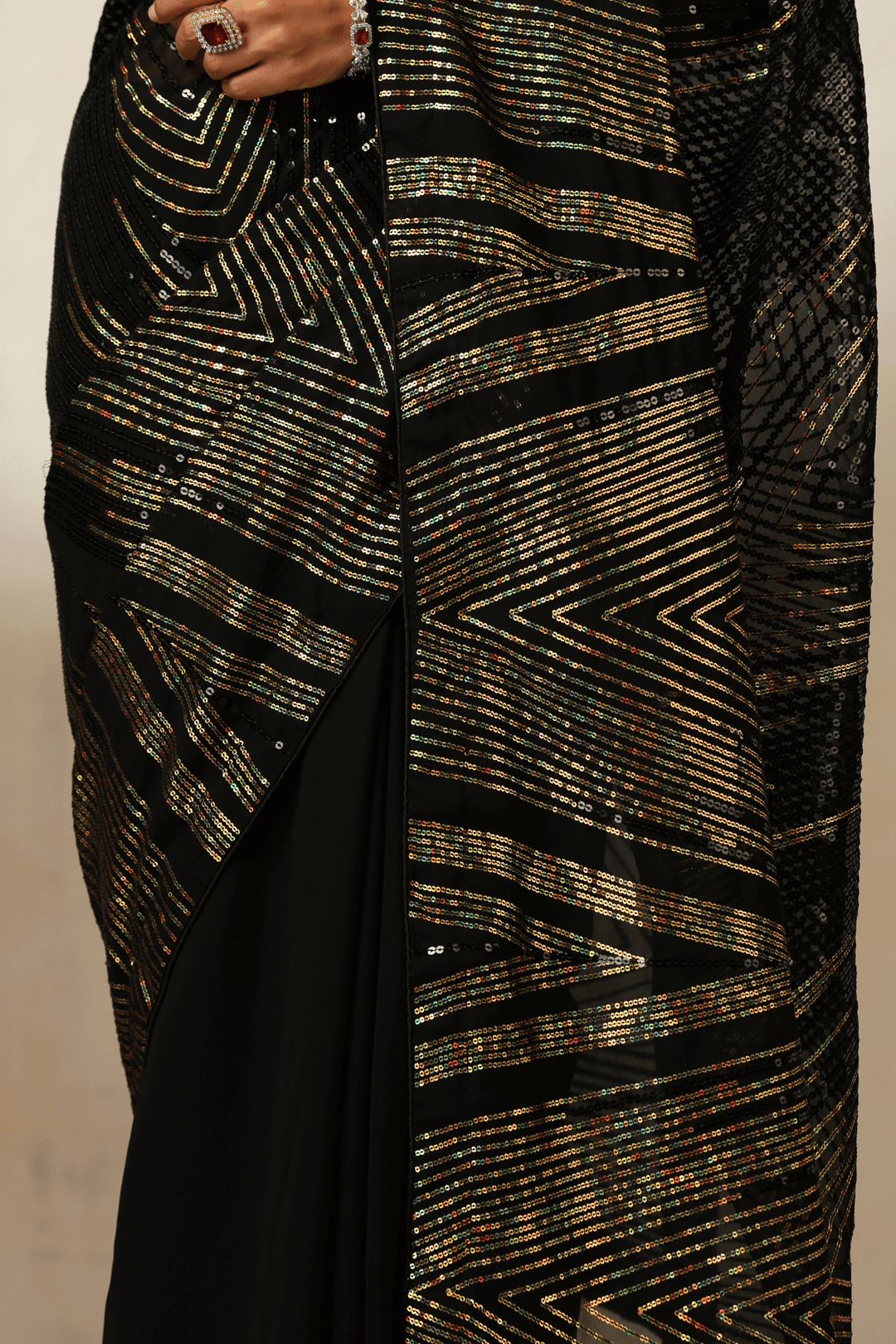 Indulge in the ethereal beauty of the Black Baddass ready-to-wear Black Sequins Georgette saree, a perfect saree for Diwali or wedding season. The black sequins saree is embellished with multicolored sequins. This ready-to-wear saree come along with unstitched blouse 1 mtr blouse.