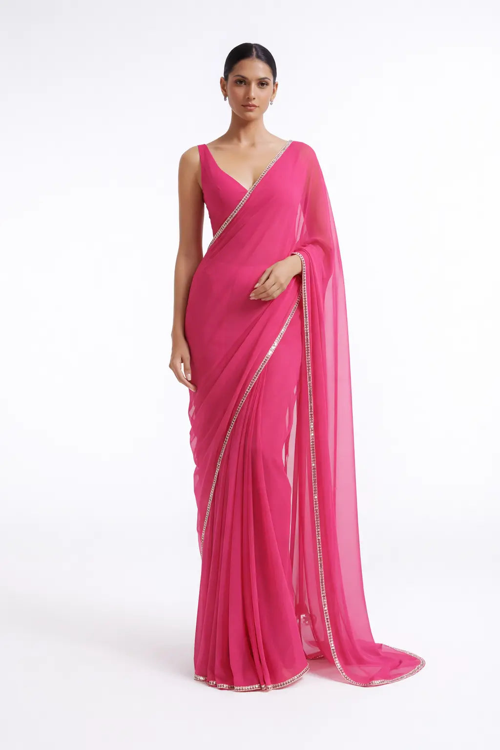 A soft pink chiffon saree that blends femininity with understated glamour. Finished with a delicate shimmer border, this saree drapes effortlessly and adds a graceful glow—ideal for cocktail evenings, festive celebrations, and elegant daytime occasions.