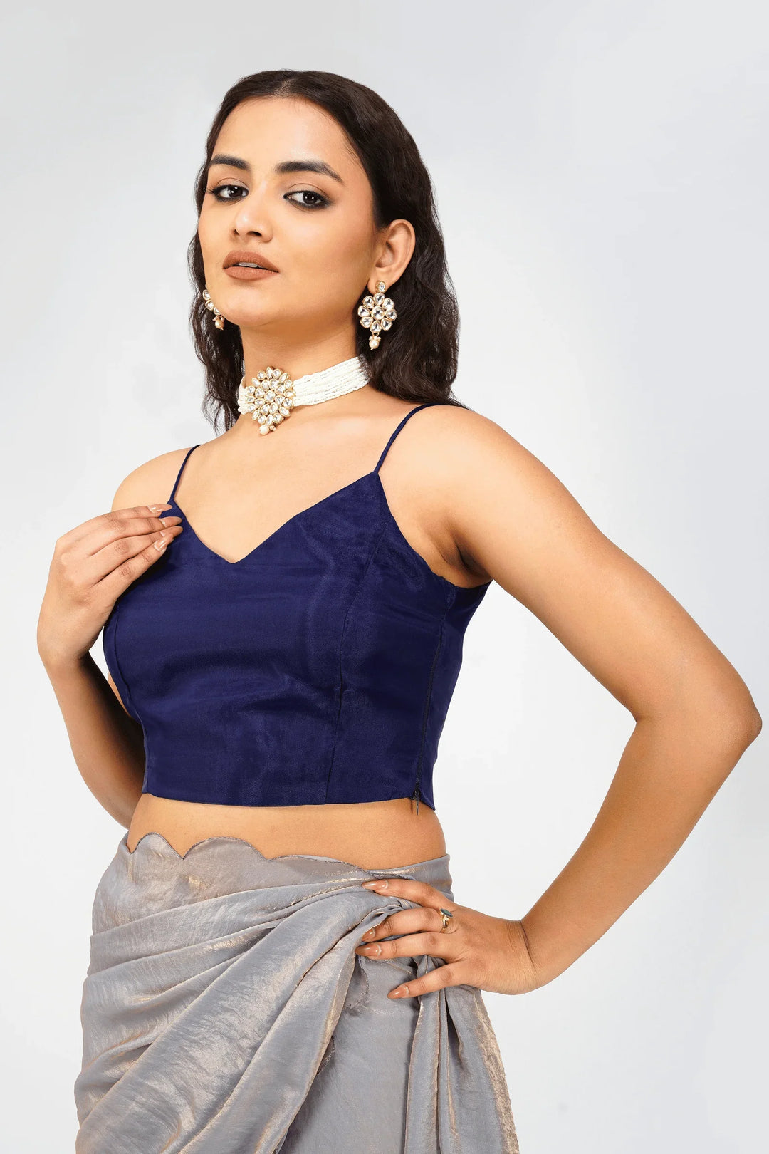 Description:- A Plain Organza solid sleeveless blouse in V neck with noodle straps. The blouse is padded and ideal for daily wear!