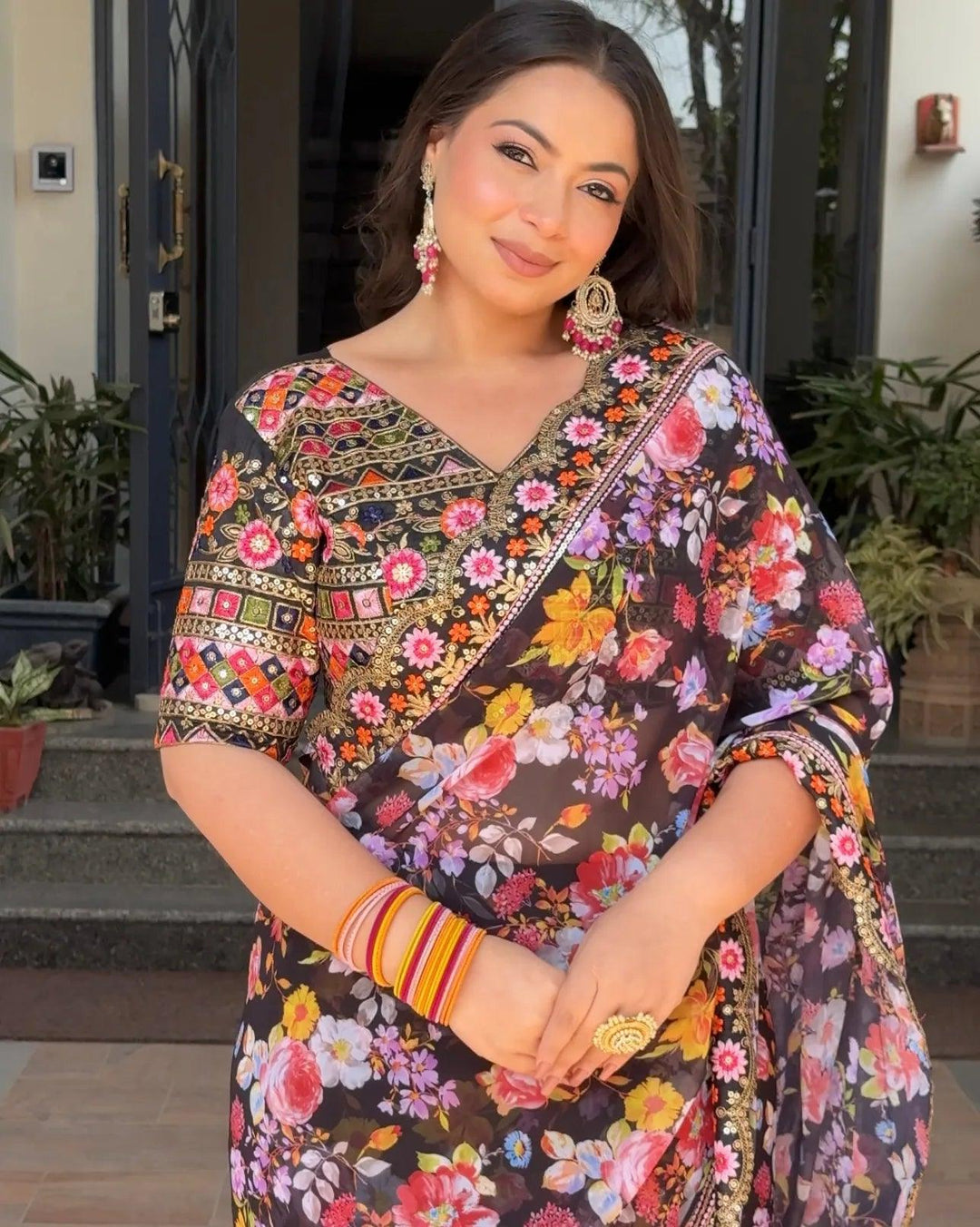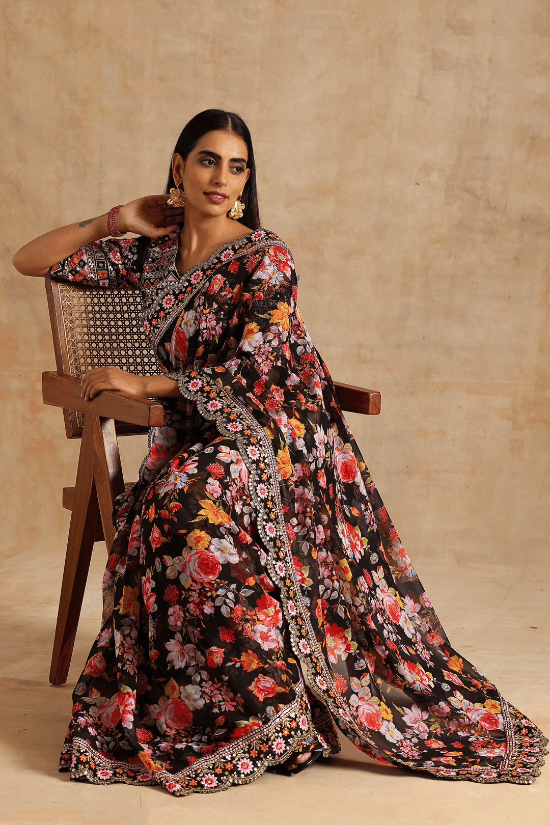 Black Bloom Saree | Pre-Stitched Floral Printed Black Saree