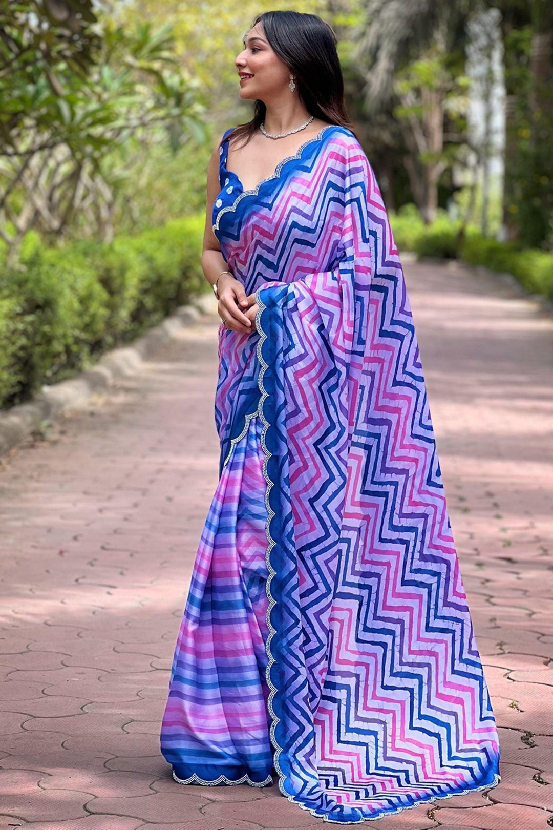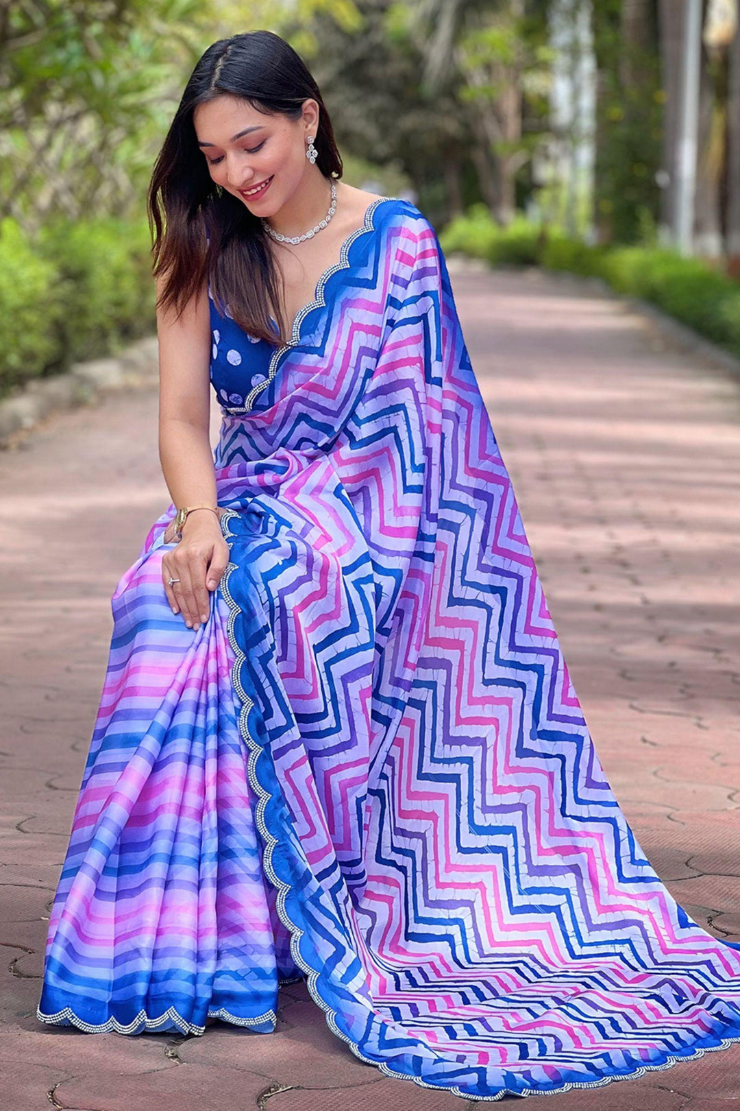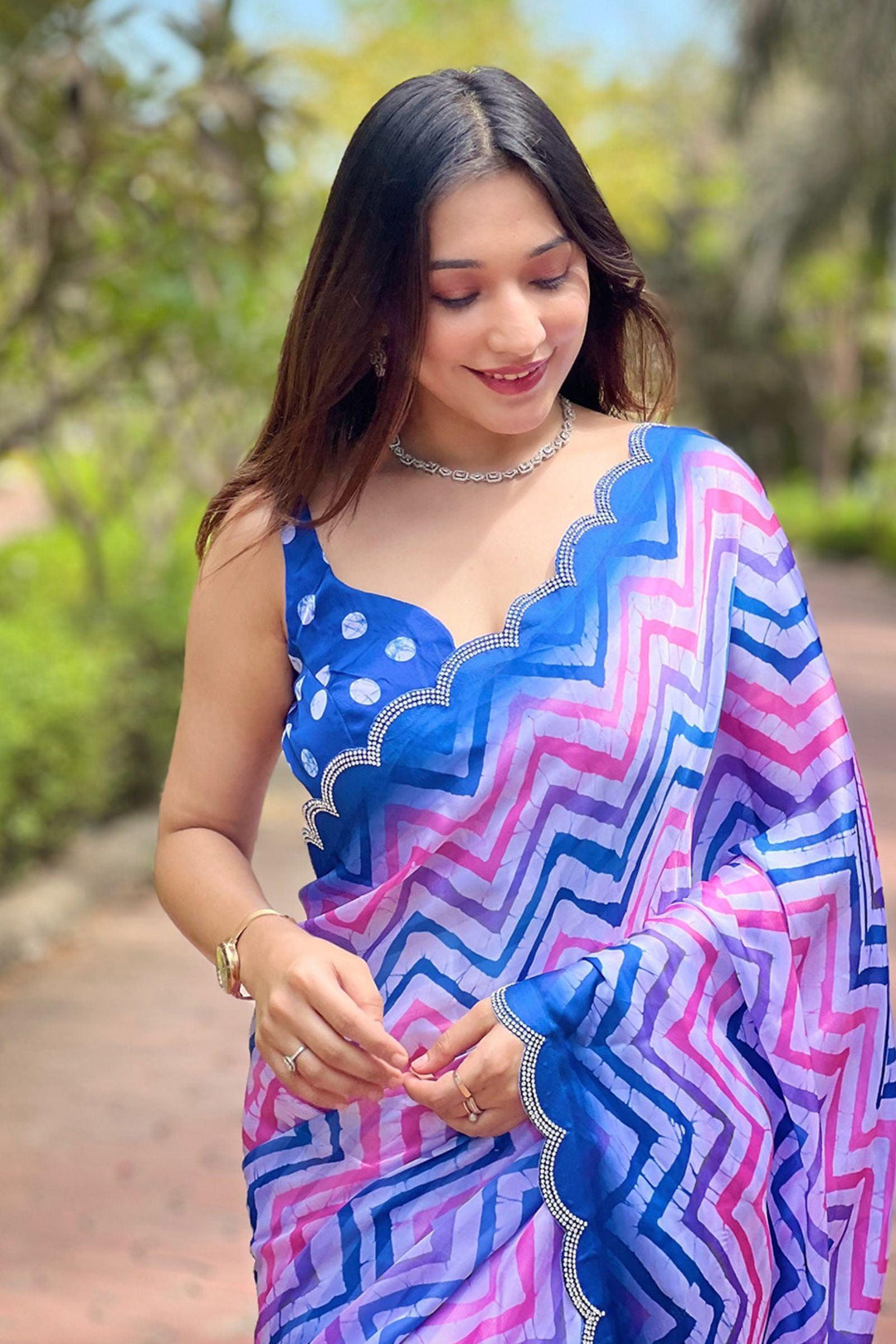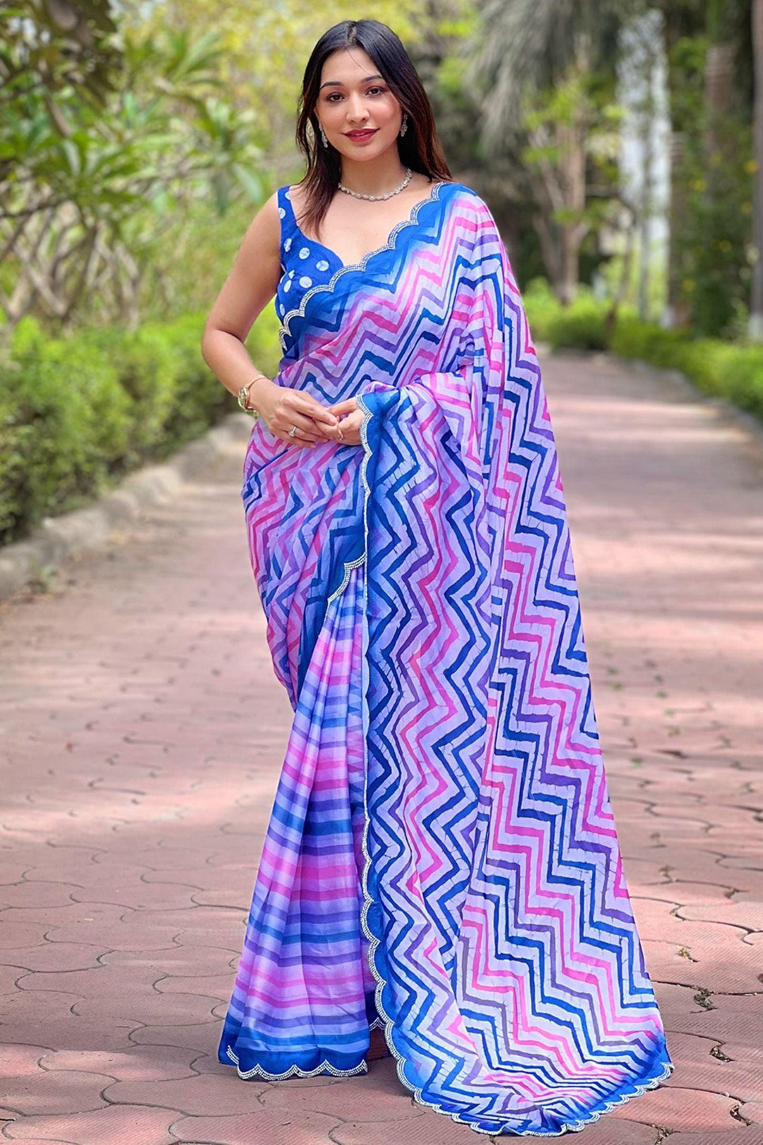 Make a bold statement with the Glamwiz Ready to Wear Electric Blue Leheriya Saree, featuring a striking Leheriya striped print and intricate cut work. The vibrant blue hue is sure to turn heads, while the satin georgette fabric ensures a comfortable and luxurious wear. Perfect for a night out or a special occasion!