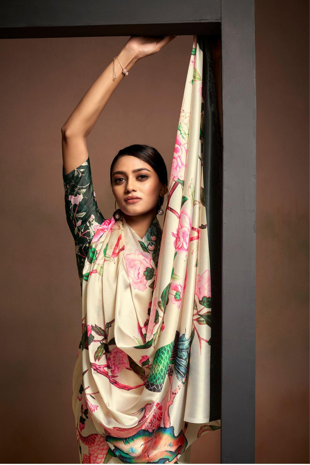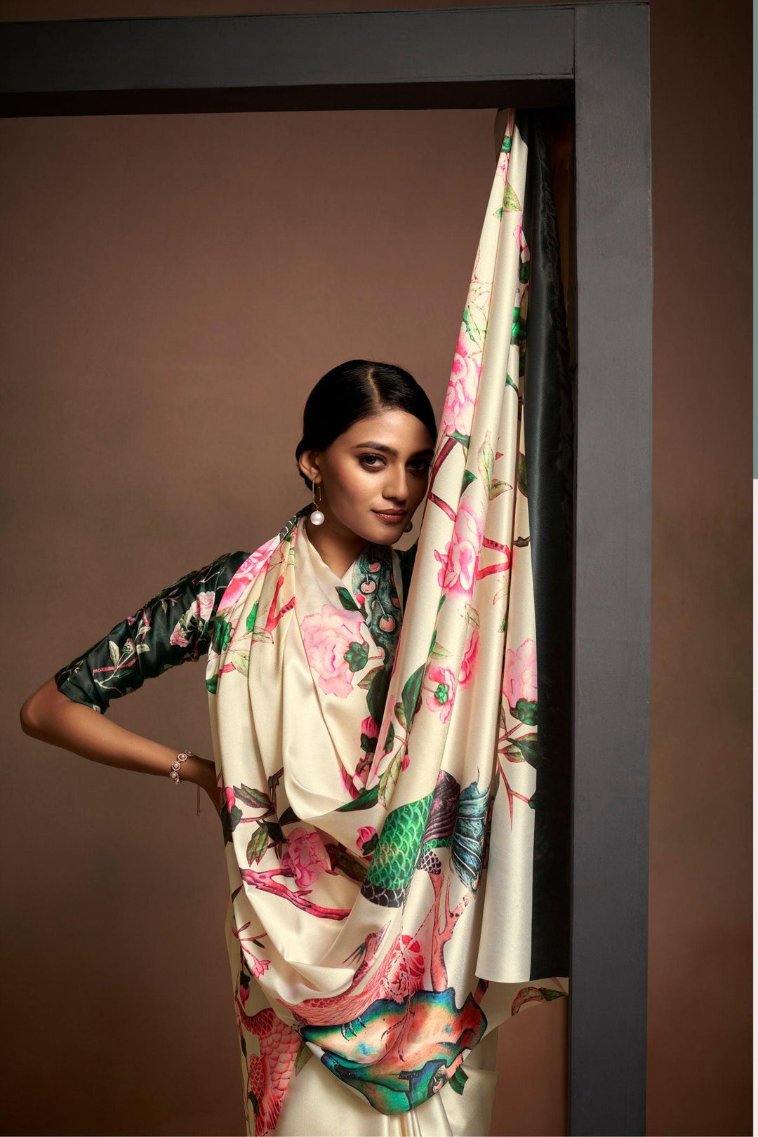 Elevate your wardrobe with the Glamwiz Off White Floral Printed Saree, a perfect blend of elegance and style. Crafted from high-quality satin crepe fabric, this saree drapes beautifully, accentuating your curves with its luxurious texture.