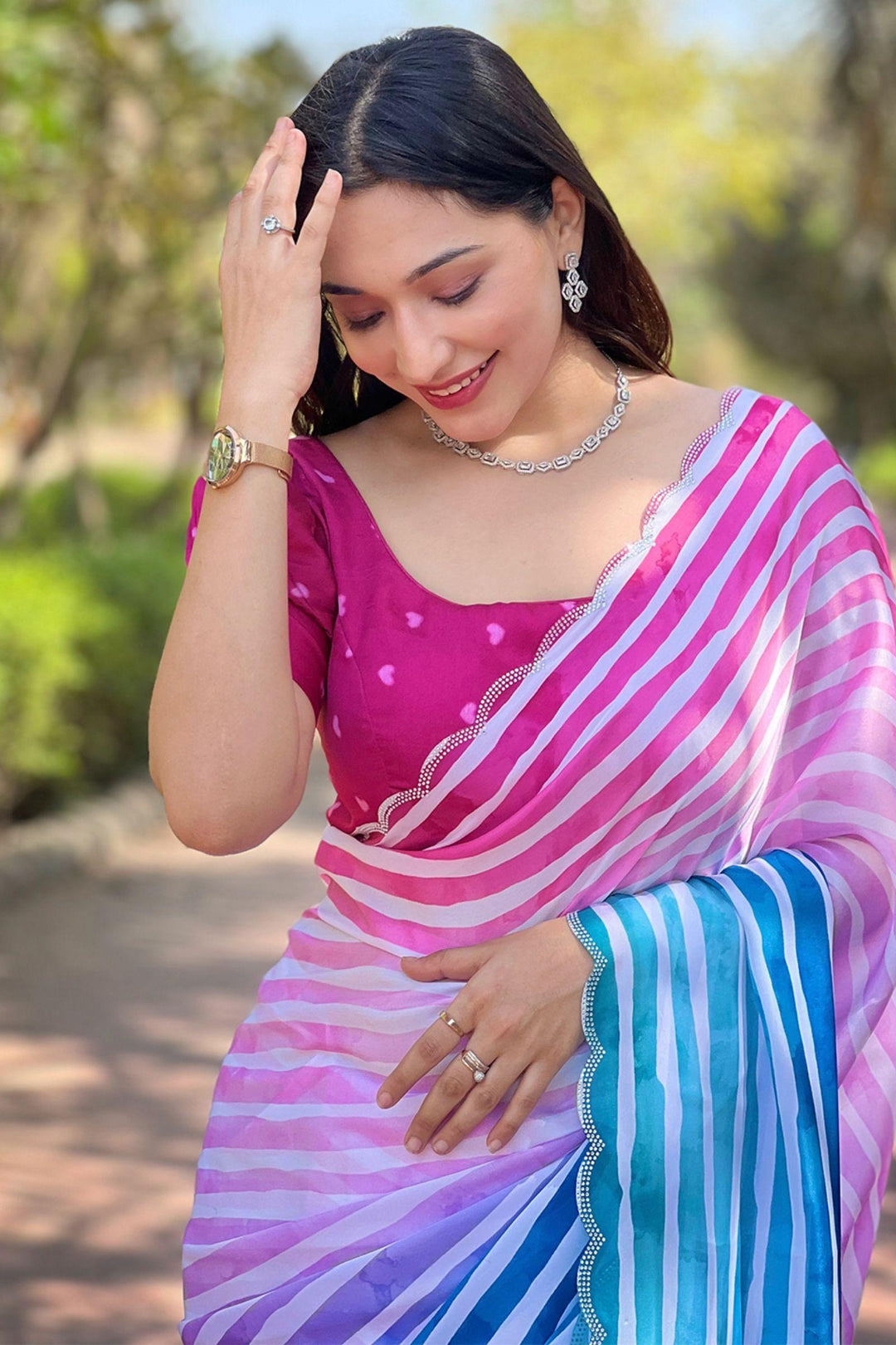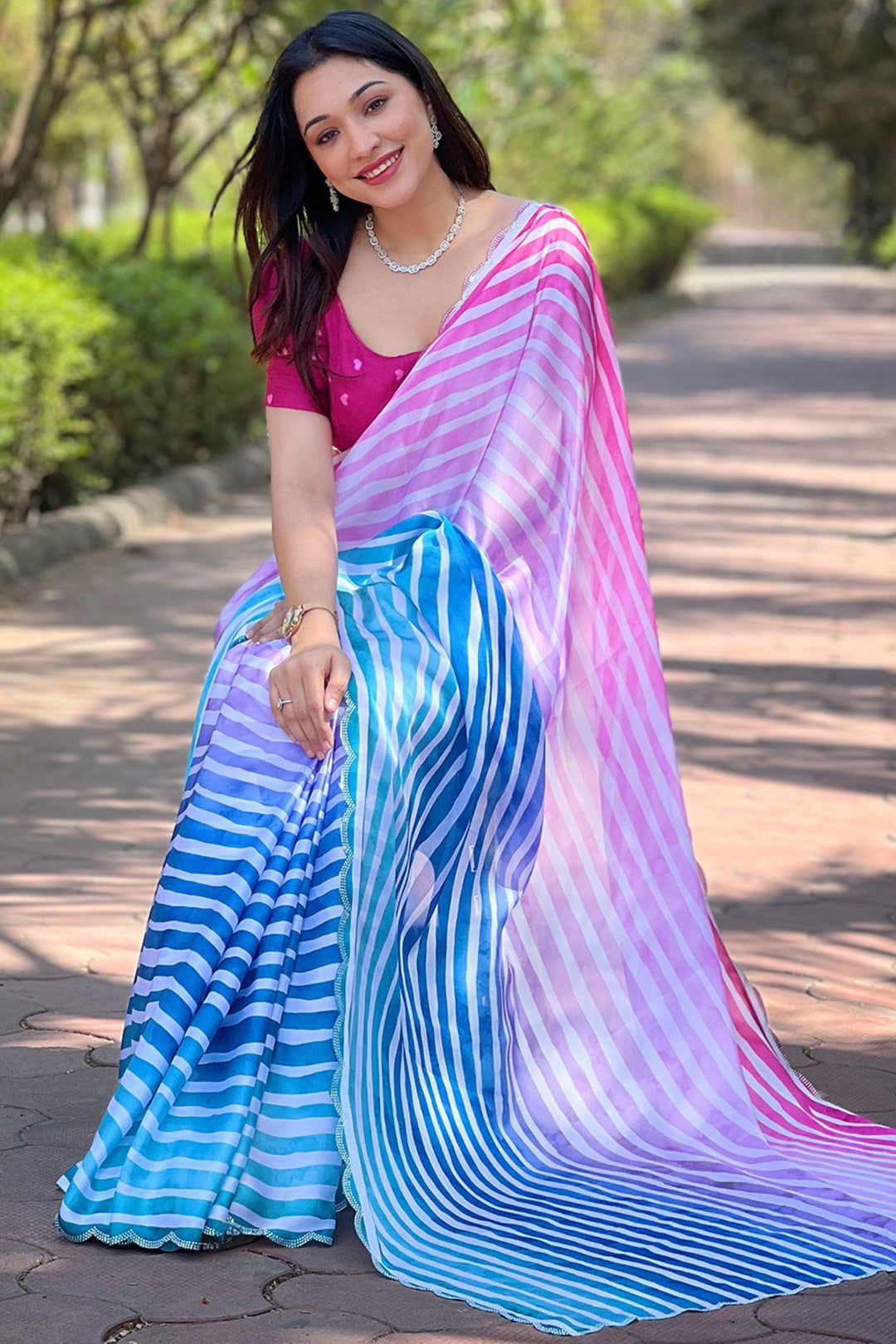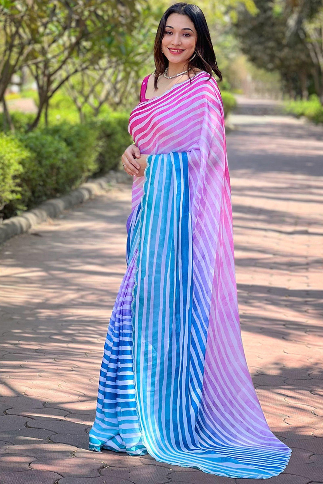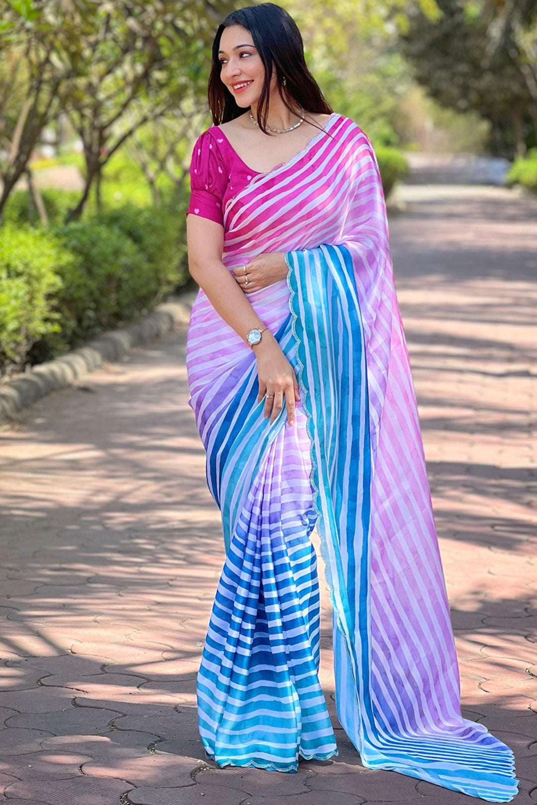 Elevate your festive wardrobe with our Ombre Stripes Satin Georgette Saree from Glamwiz. Adorned with intricate Striped Leheriya Work, this ready-to-wear saree seamlessly combines traditional artistry with contemporary flair. Crafted from luxurious satin georgette, it's the perfect statement piece for any celebratory occasion.