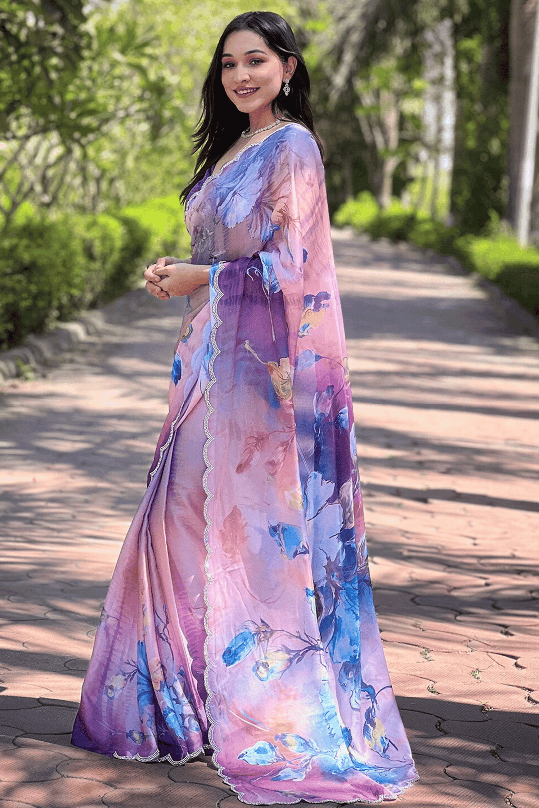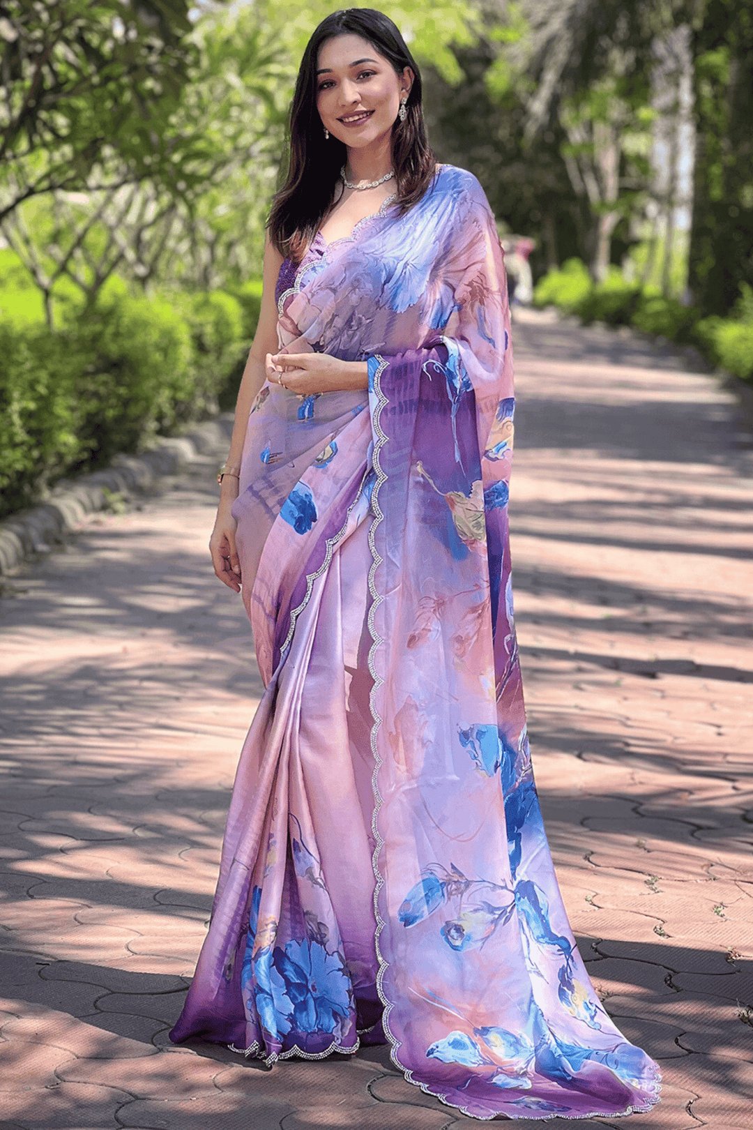Elevate your style effortlessly with Glamwiz's Ready To Wear Pale Purple Satin Georgette Saree. Crafted from pure satin georgette and adorned with a mesmerizing batik polka dots print, it seamlessly blends tradition and convenience.