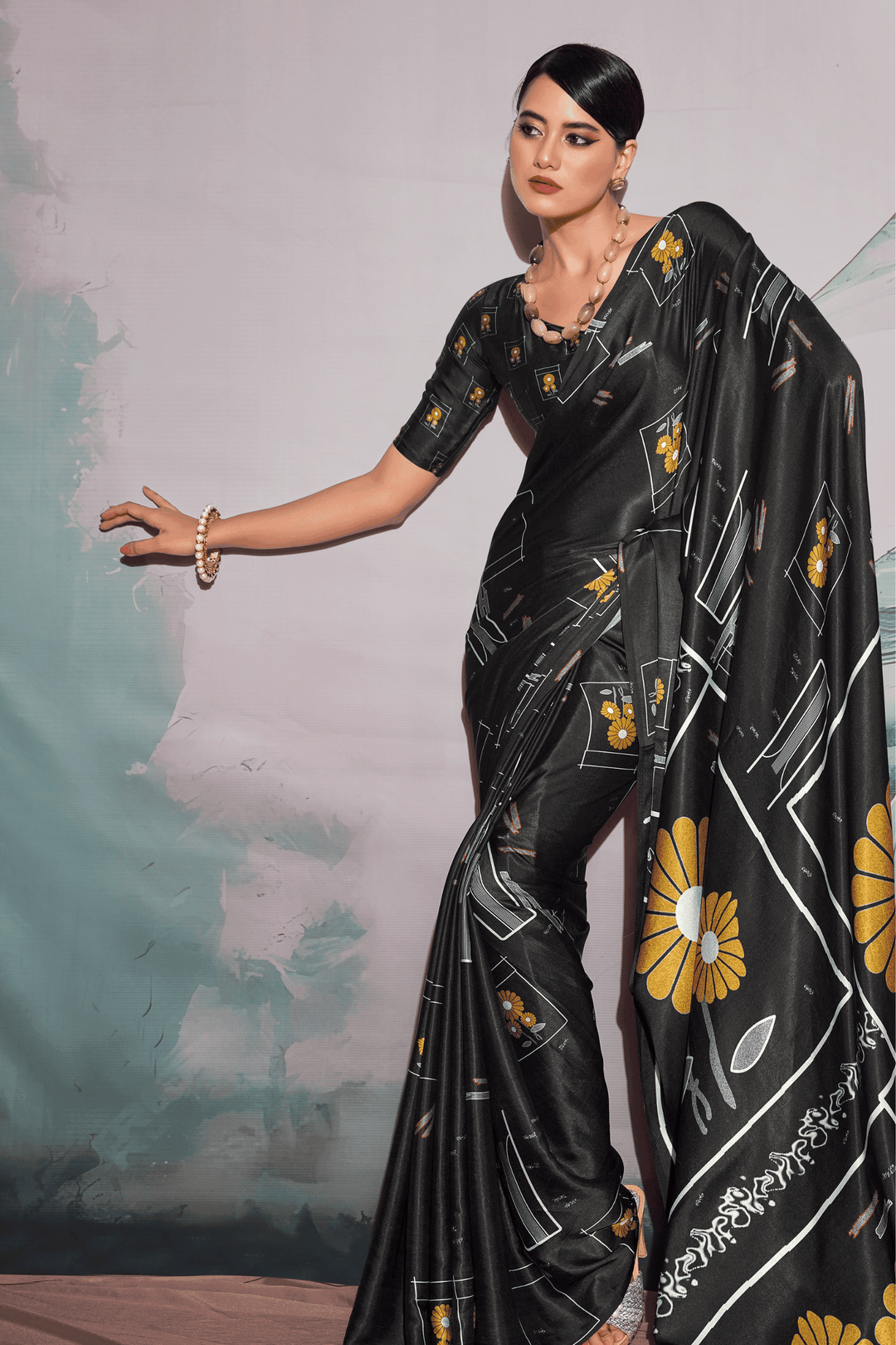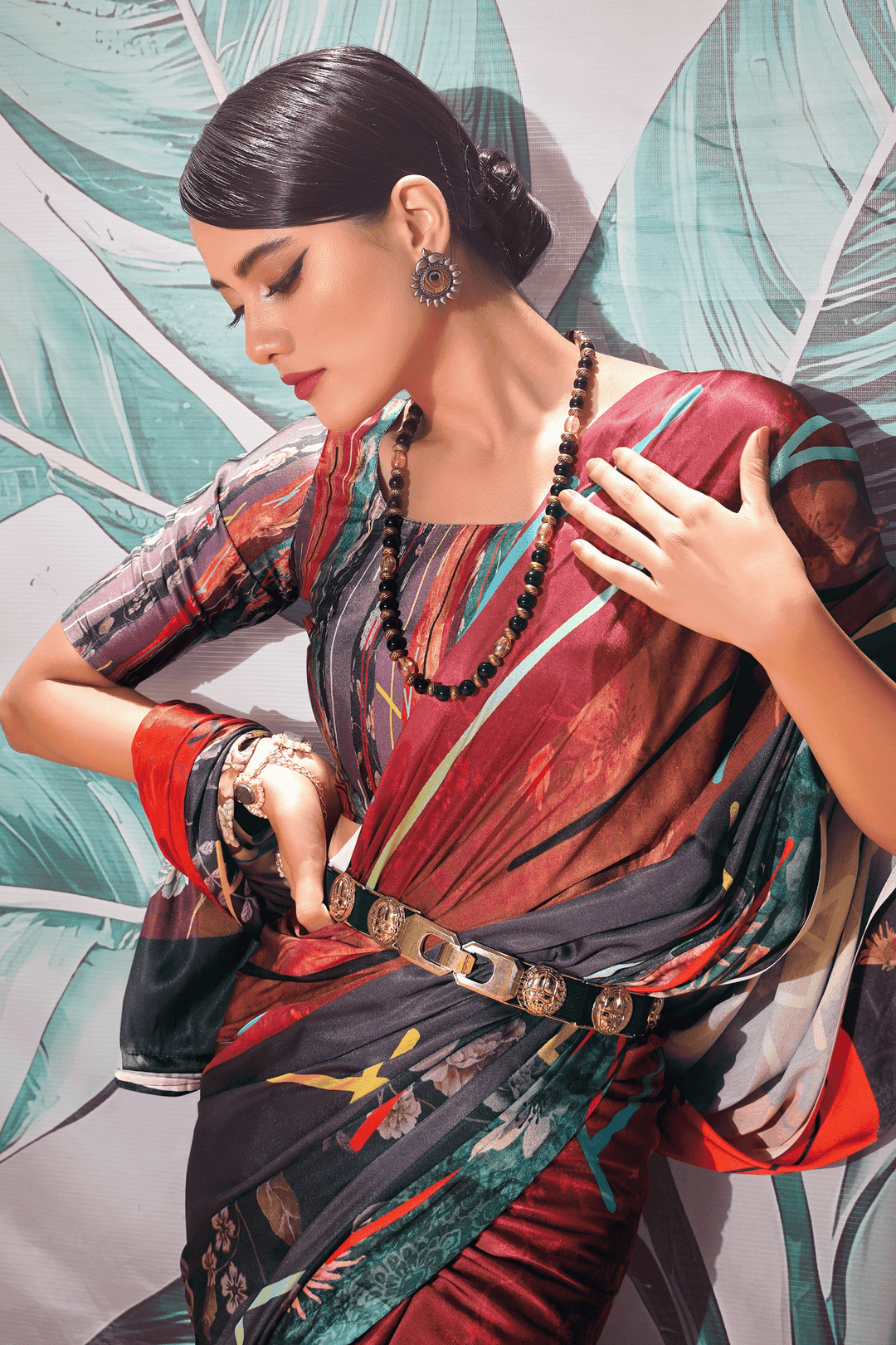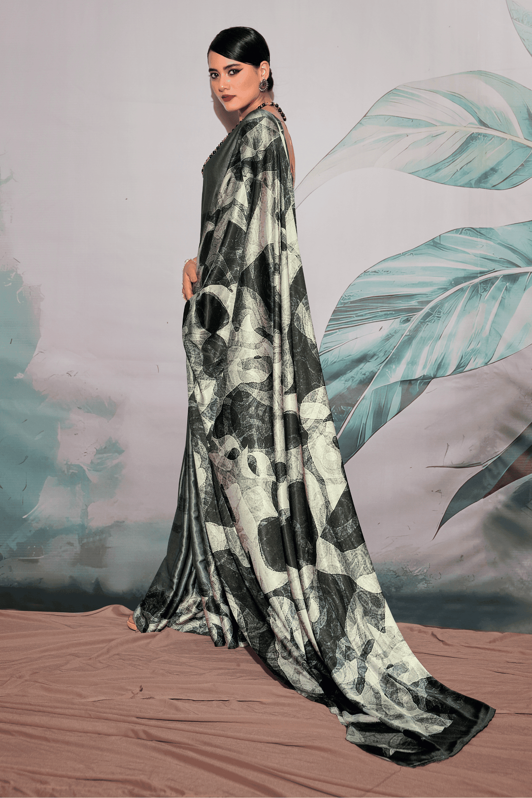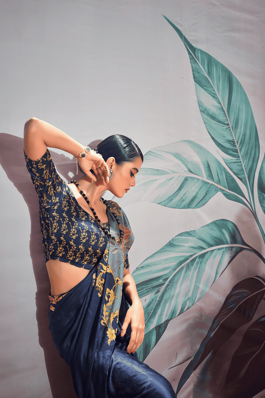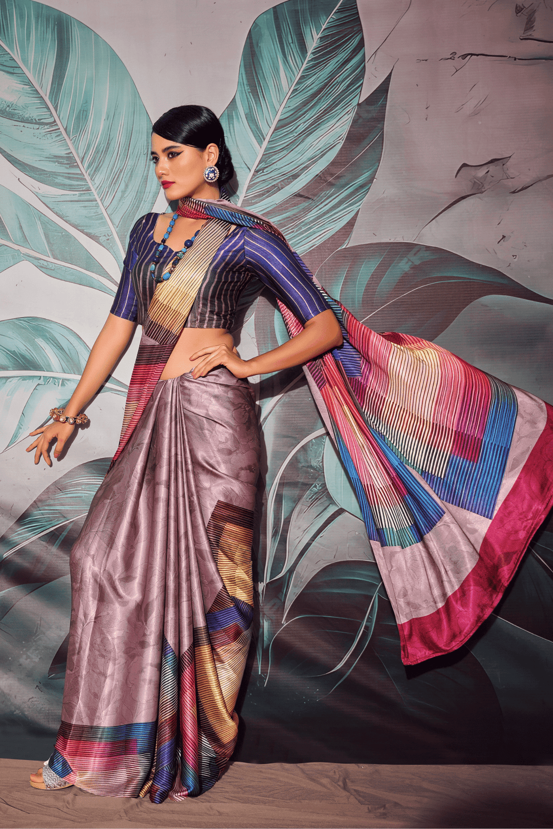 Introducing Glamwiz Ready to Wear Printed Satin Crepe Saree, a fusion of style and comfort. This exquisite saree is crafted from luxurious crepe fabric, known for its lightweight and breathable qualities.