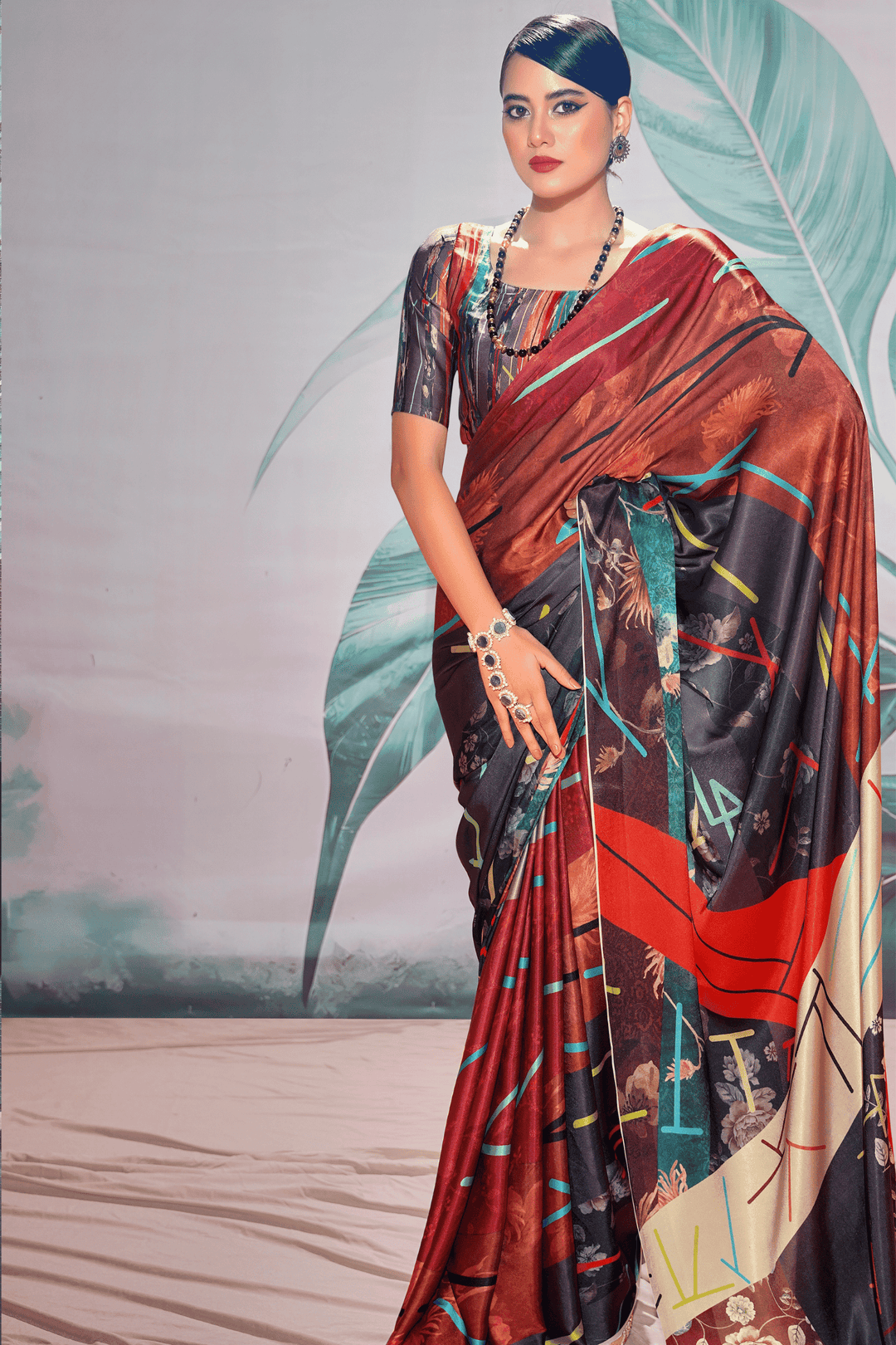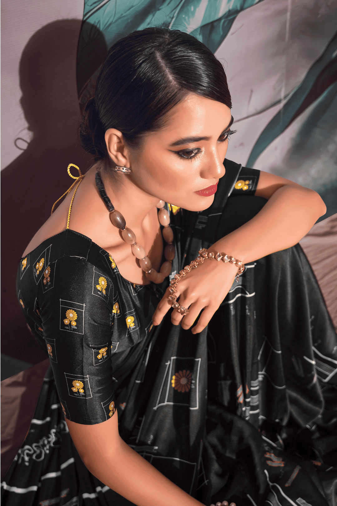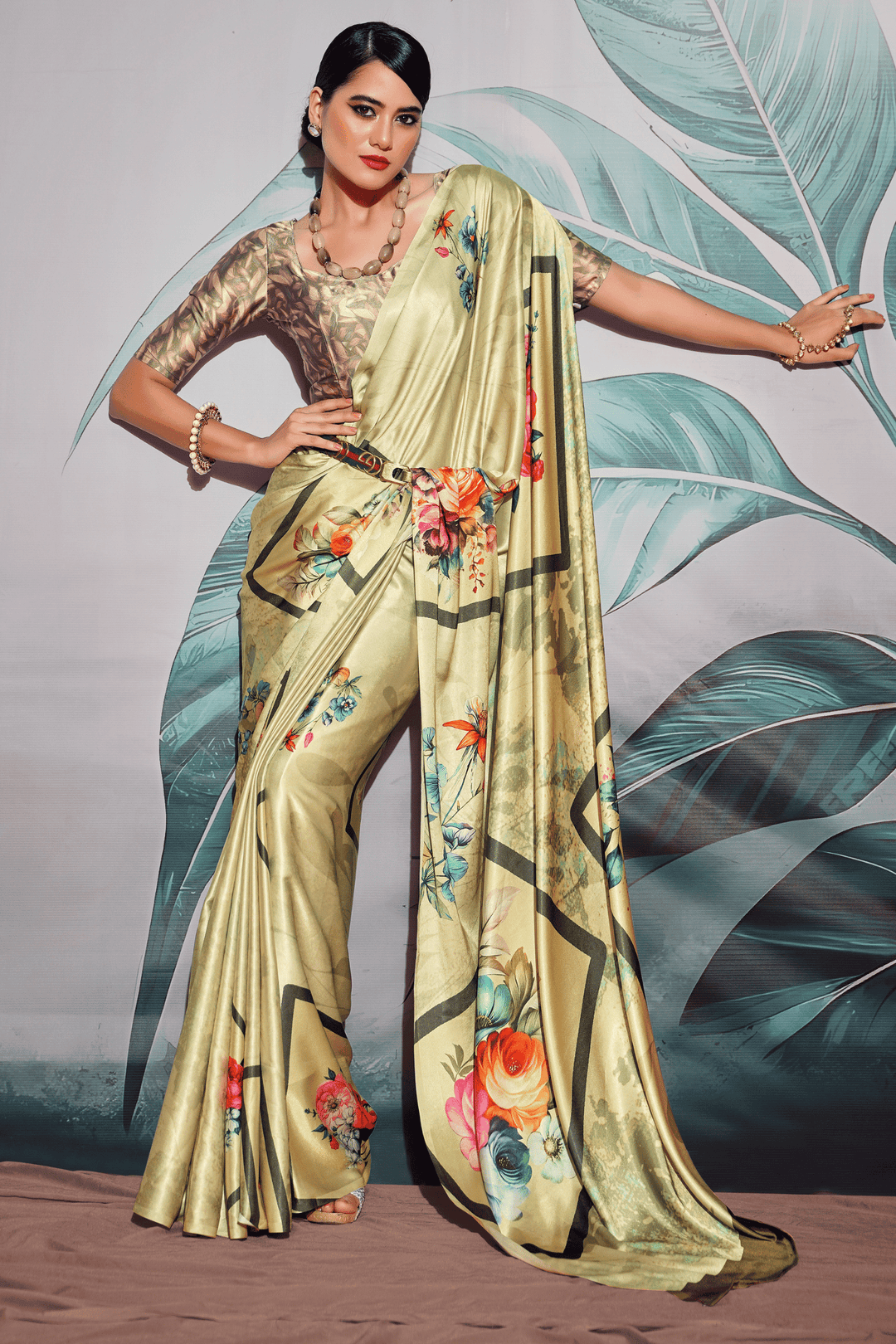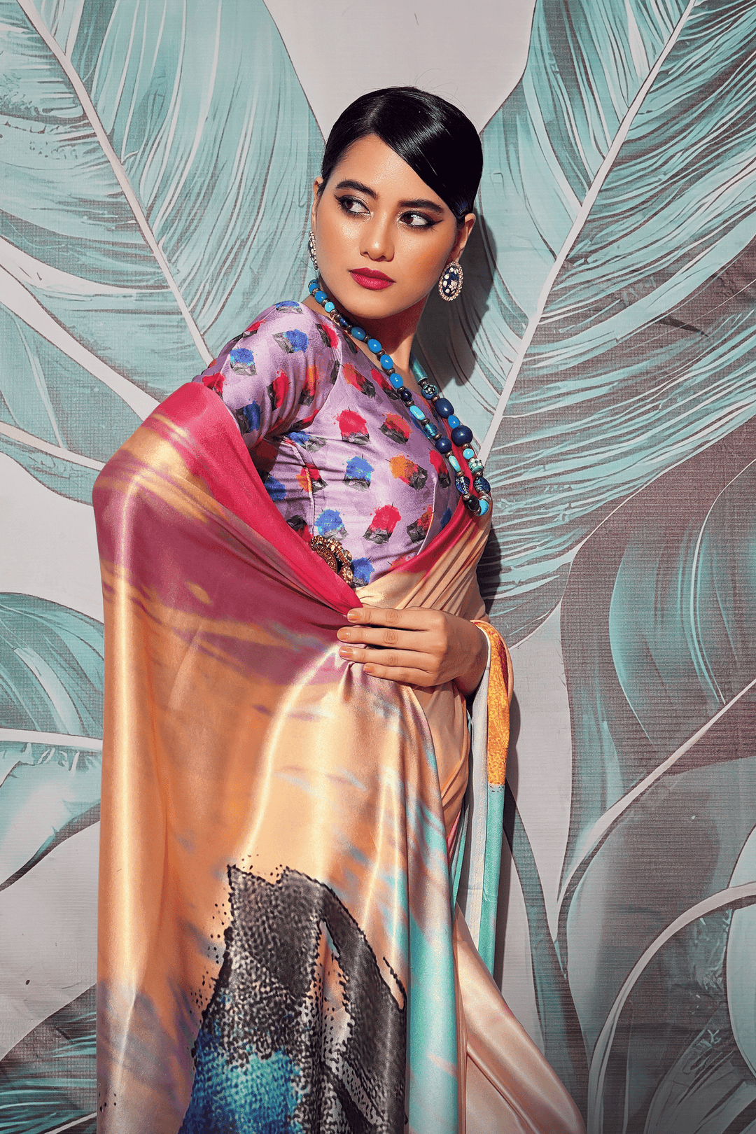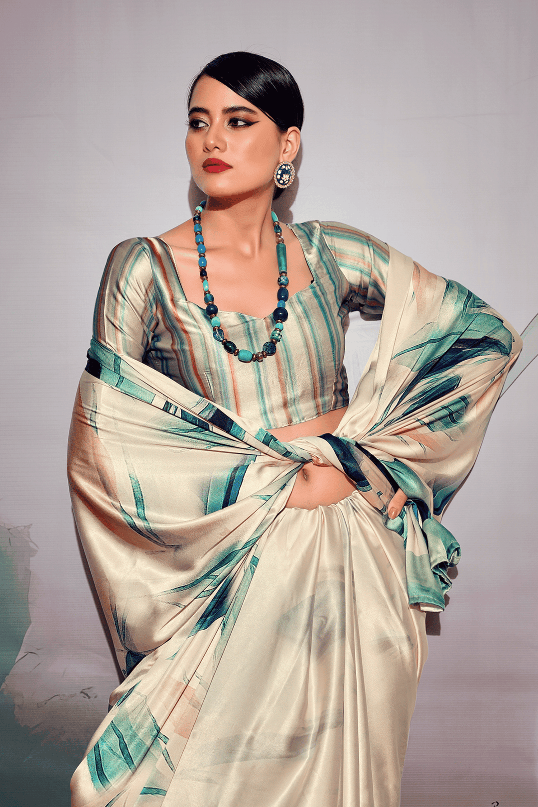 Introducing Glamwiz Ready to Wear Printed Satin Crepe Saree, a fusion of style and comfort. This exquisite saree is crafted from luxurious crepe fabric, known for its lightweight and breathable qualities.