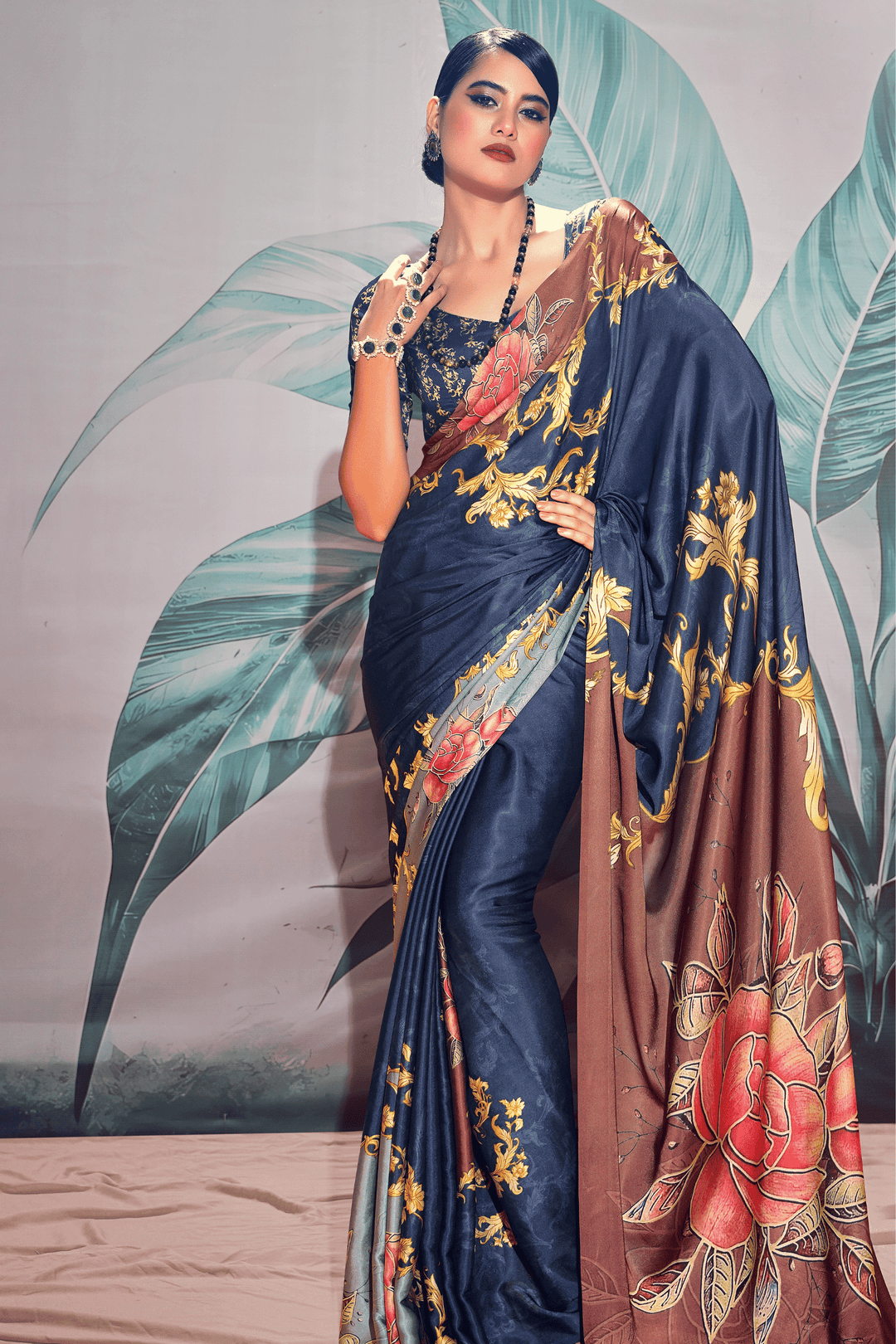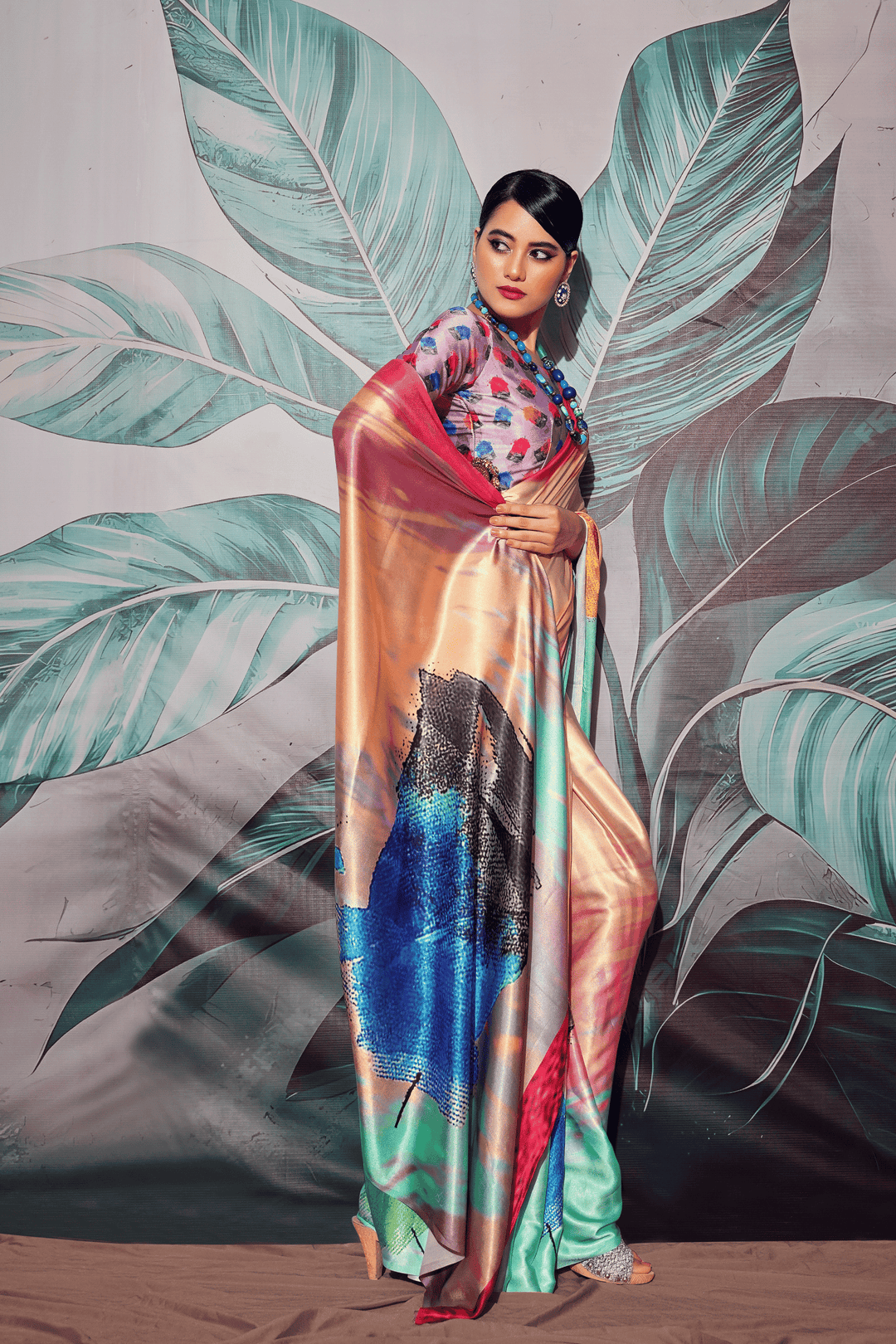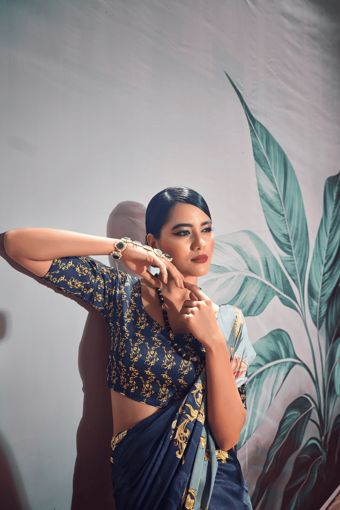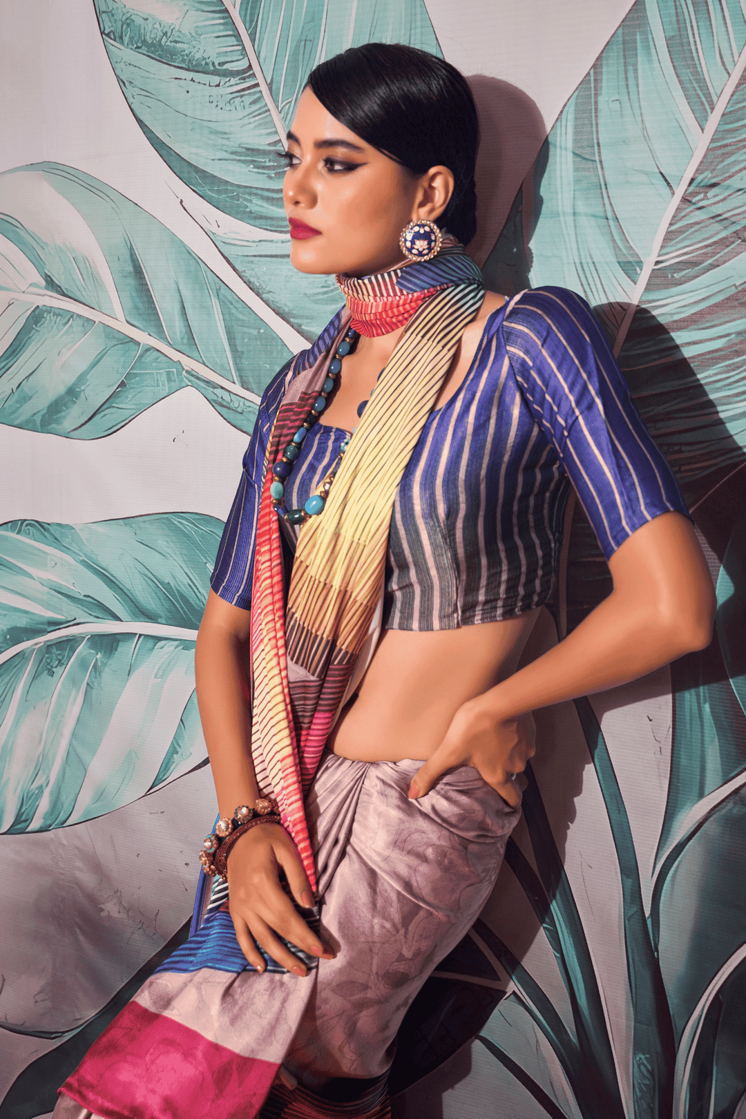 Introducing Glamwiz Ready to Wear Printed Satin Crepe Saree, a fusion of style and comfort. This exquisite saree is crafted from luxurious crepe fabric, known for its lightweight and breathable qualities.