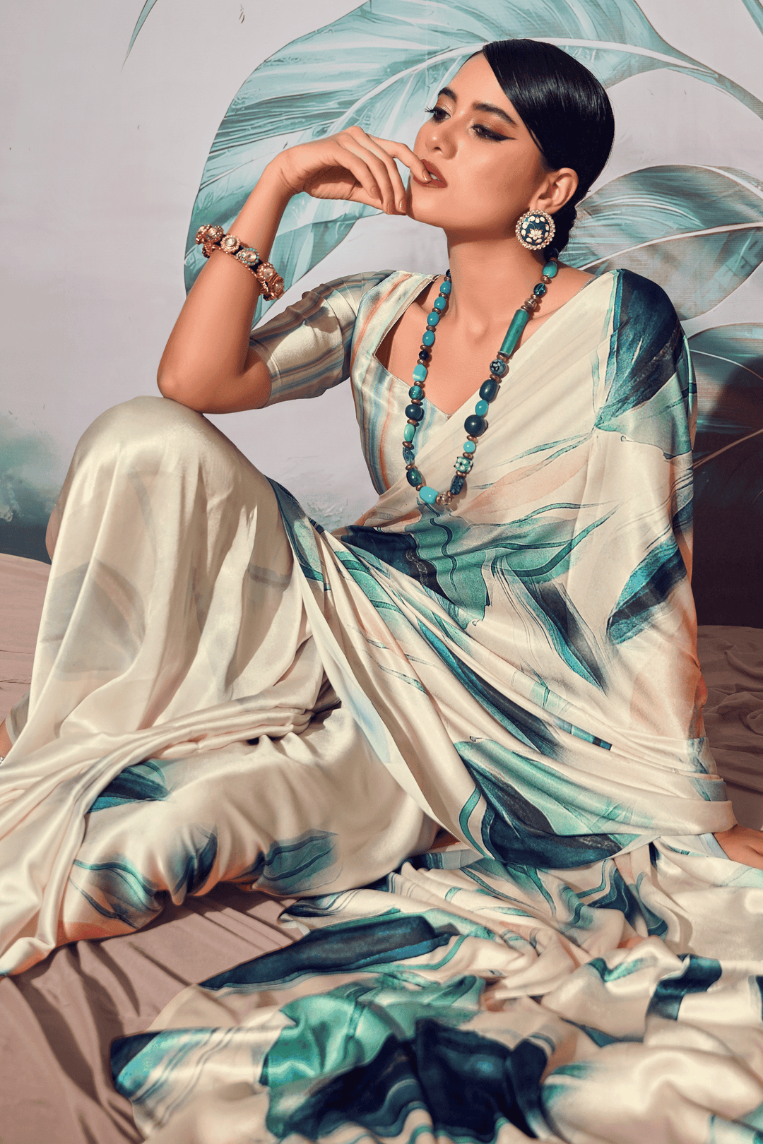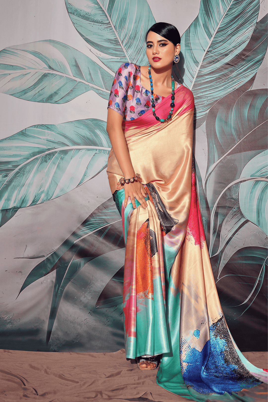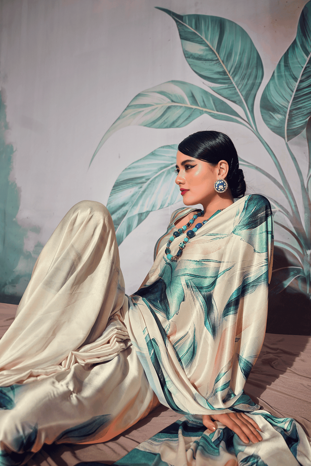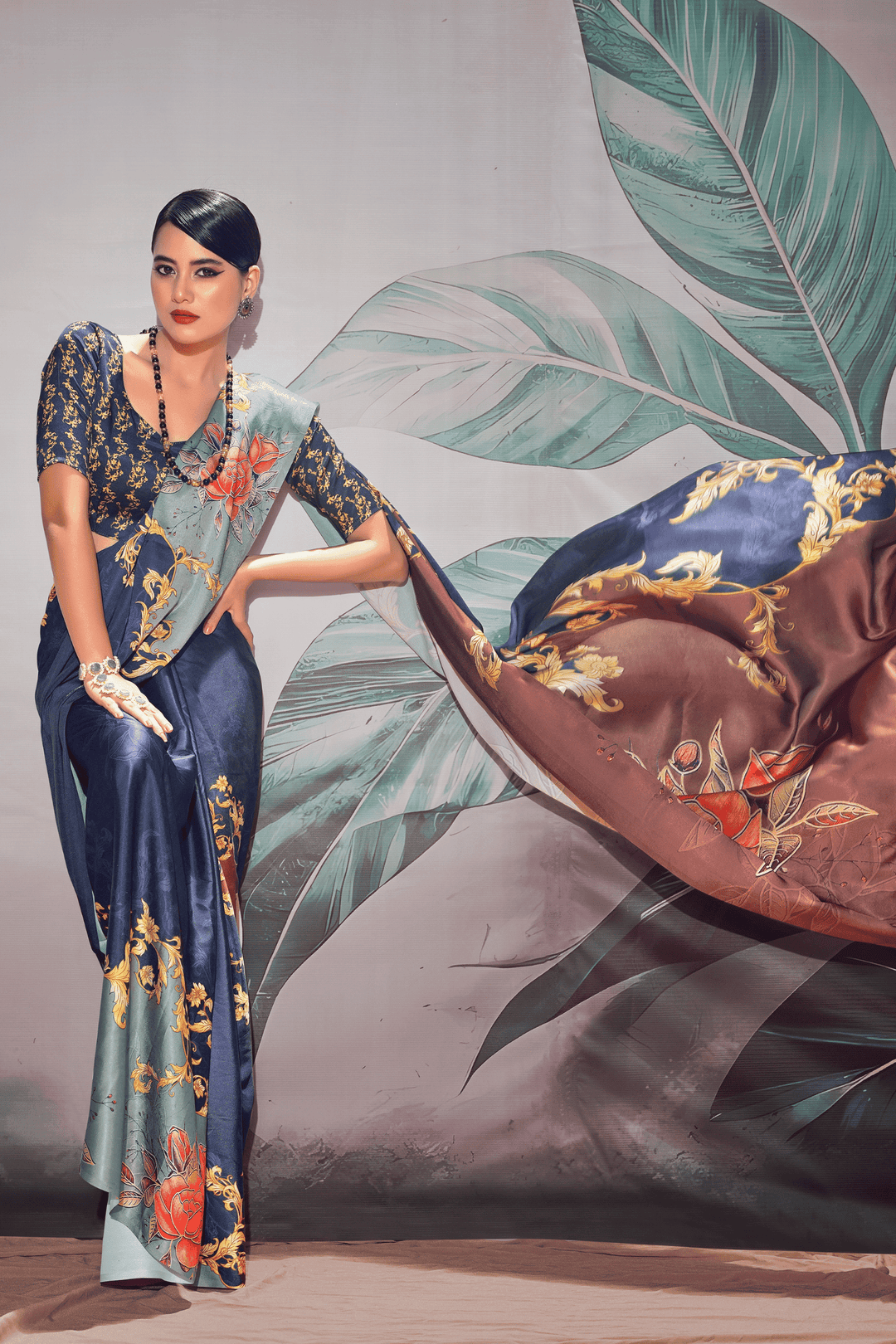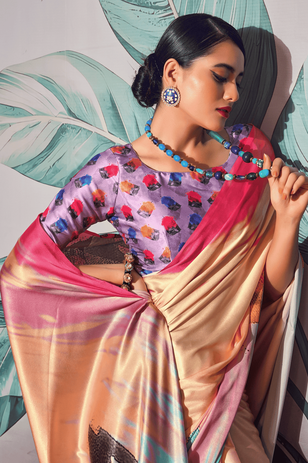 Introducing Glamwiz Ready to Wear Printed Satin Crepe Saree, a fusion of style and comfort. This exquisite saree is crafted from luxurious crepe fabric, known for its lightweight and breathable qualities.