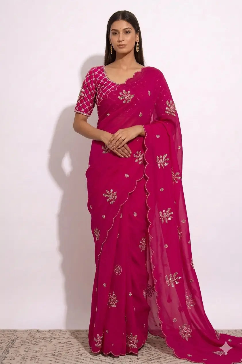 Fall in love with power dressing, a ready to wear saree that blends sultry elegance with bold femininity. Rich in color and adorned with delicate embellishments along the border, this saree is designed for the woman who commands attention with effortless grace. A trending color pre stitched saree with blouse