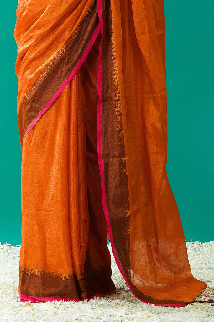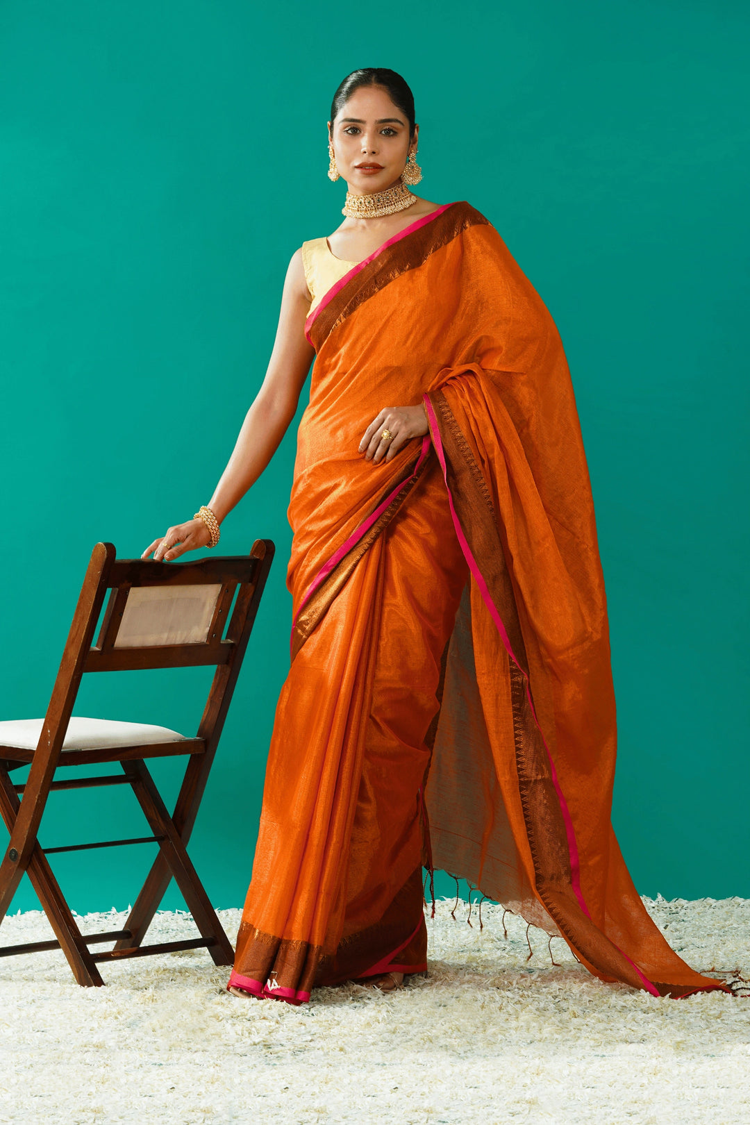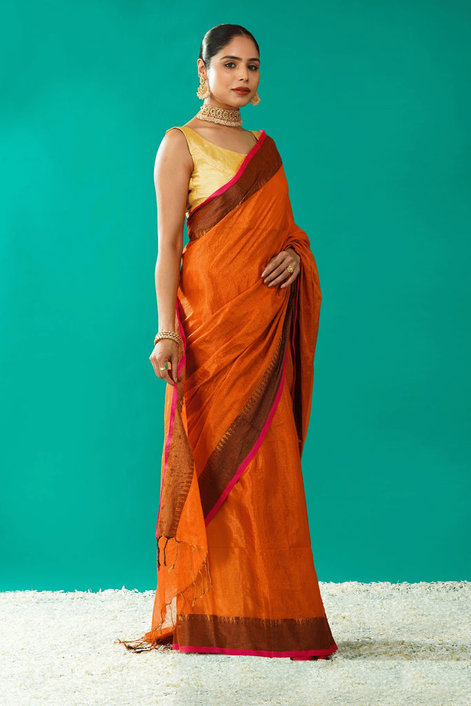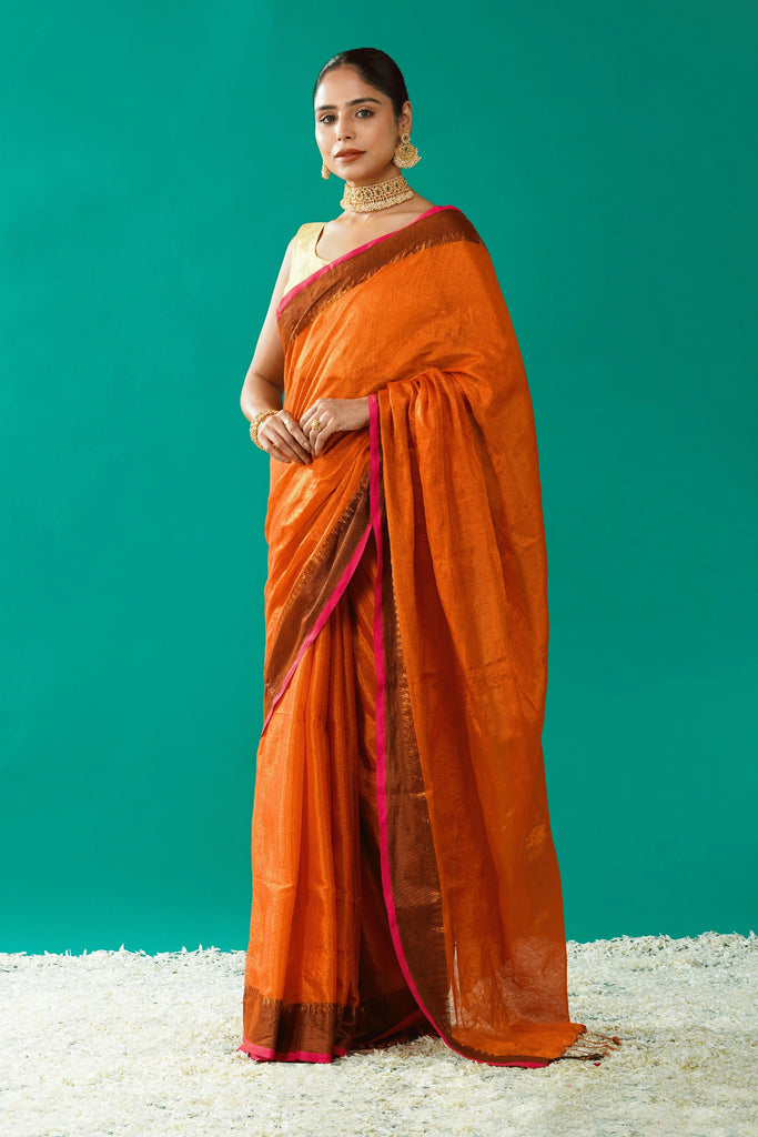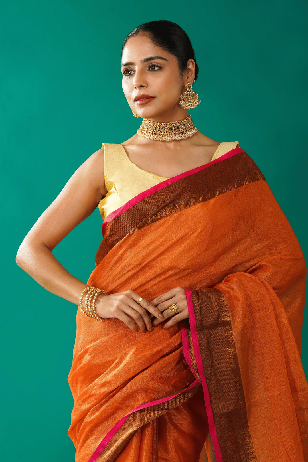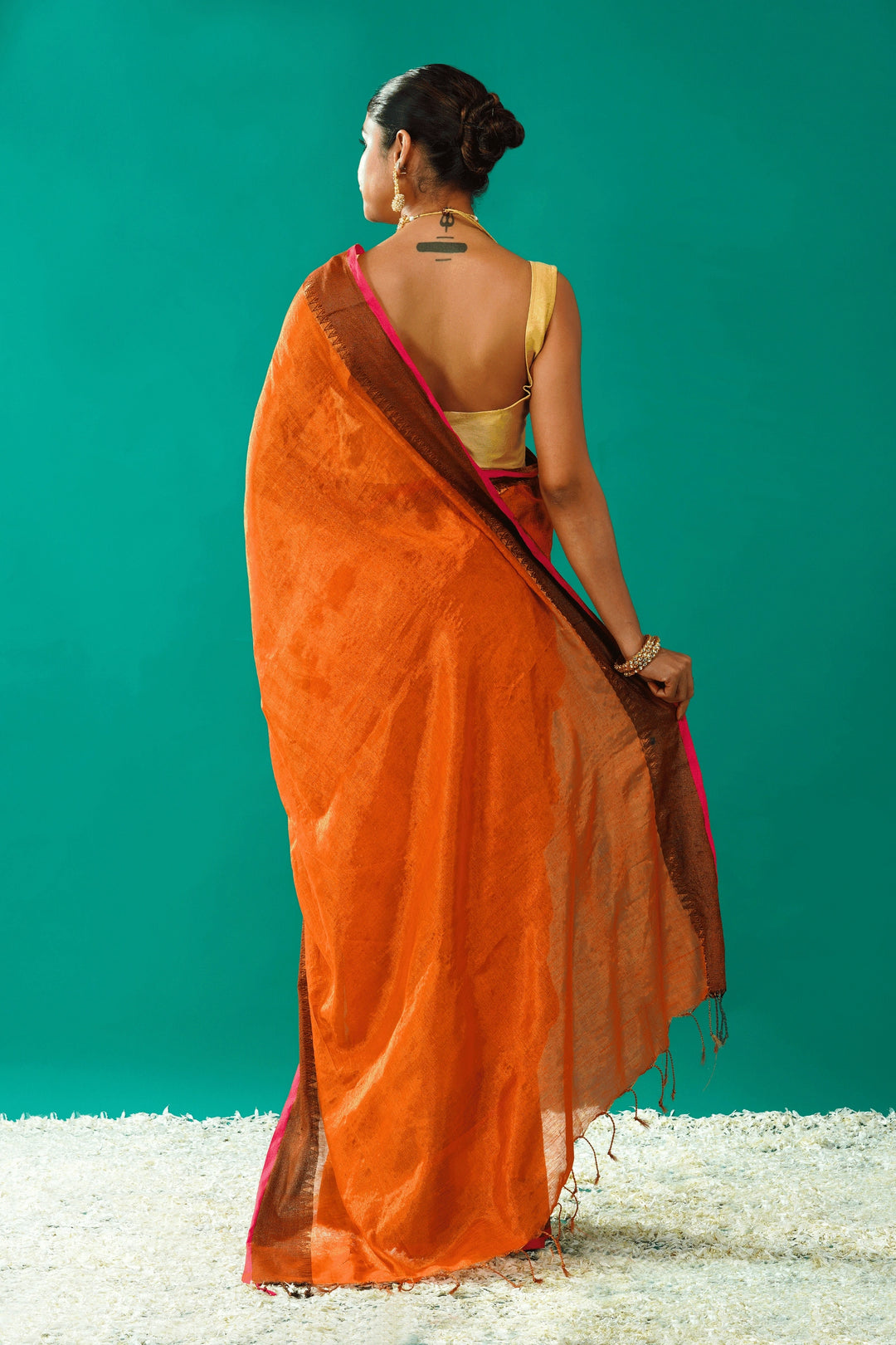 Indulge in the timeless allure of the Orange Zest Tissue Saree by Glamwiz, where heritage meets contemporary finesse. Crafted from luxurious silk, celebrated for its intricate weaving and rich texture, this saree is adorned with a mesmerizing pattern that spans across its entirety.