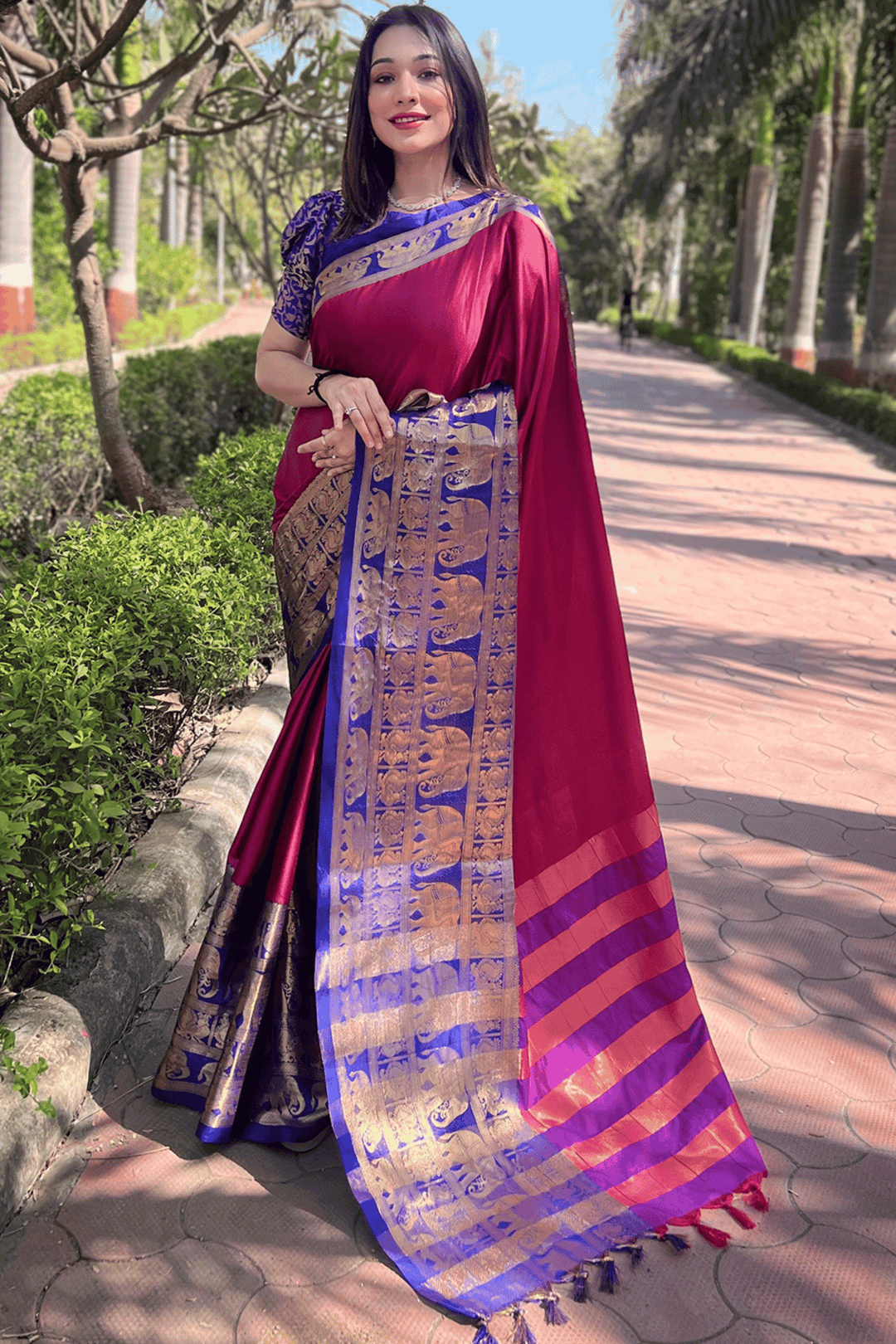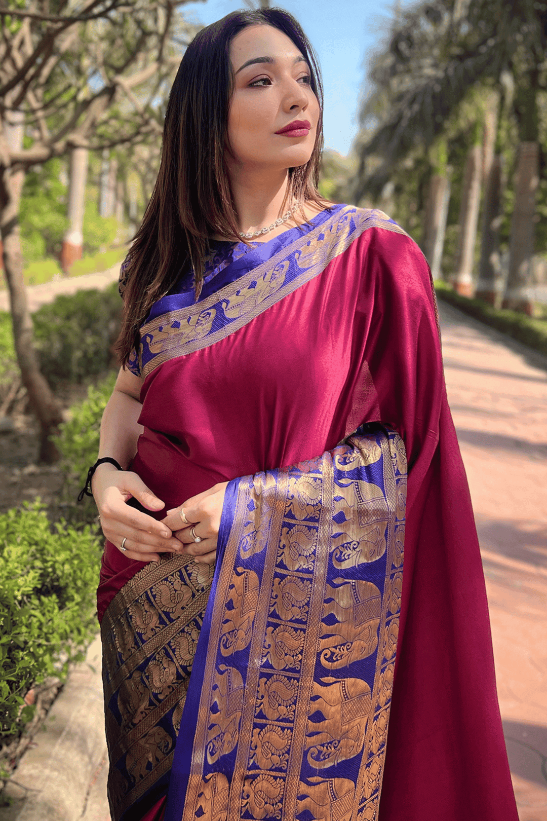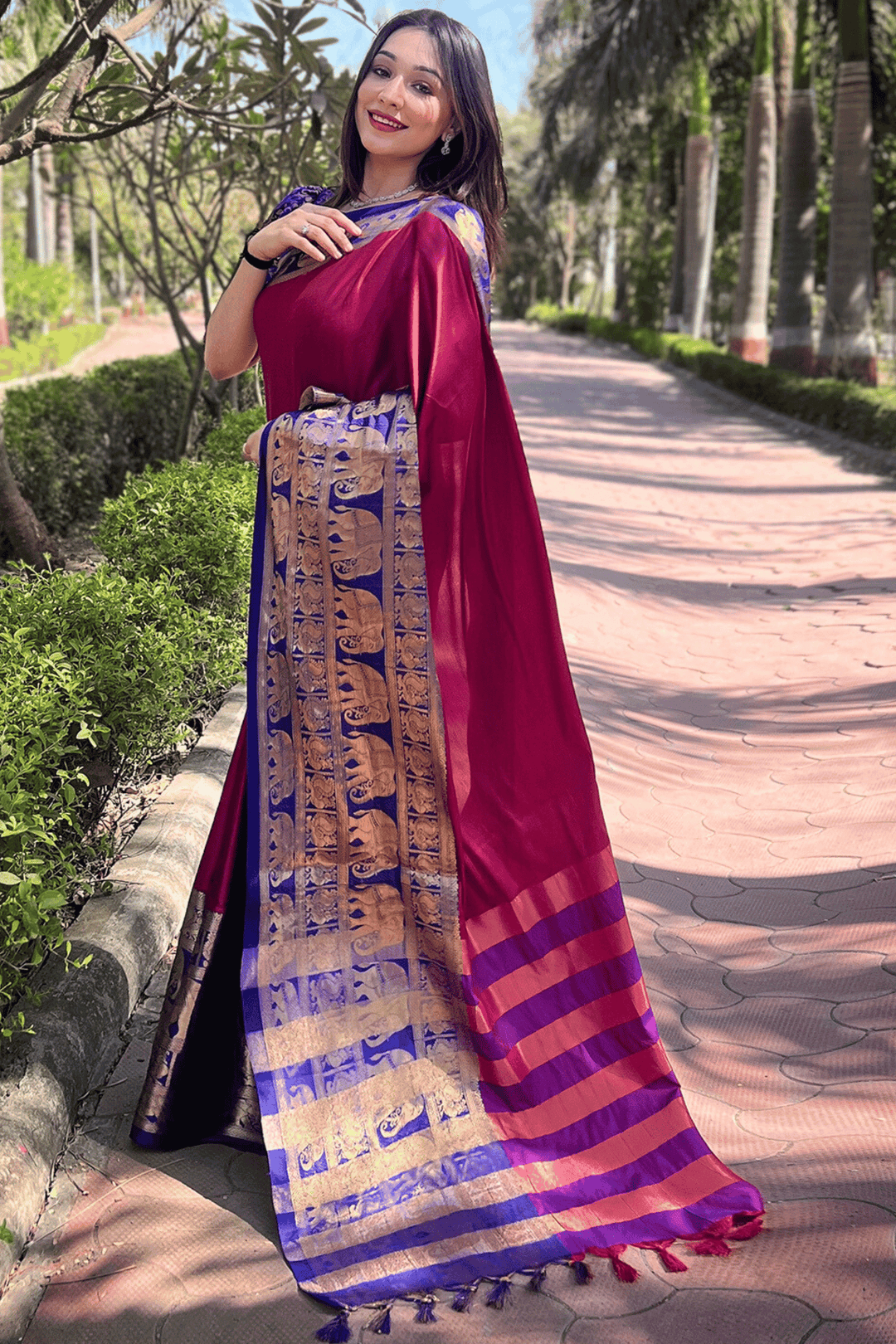 Introducing Ready to Wear Burgundy Soft Silk Saree by Glamwiz, a soft silk saree ornamented with traditional border and striped pallu, ideal for festive and wedding ceremonies.