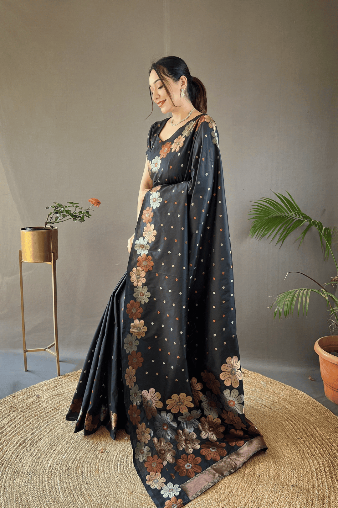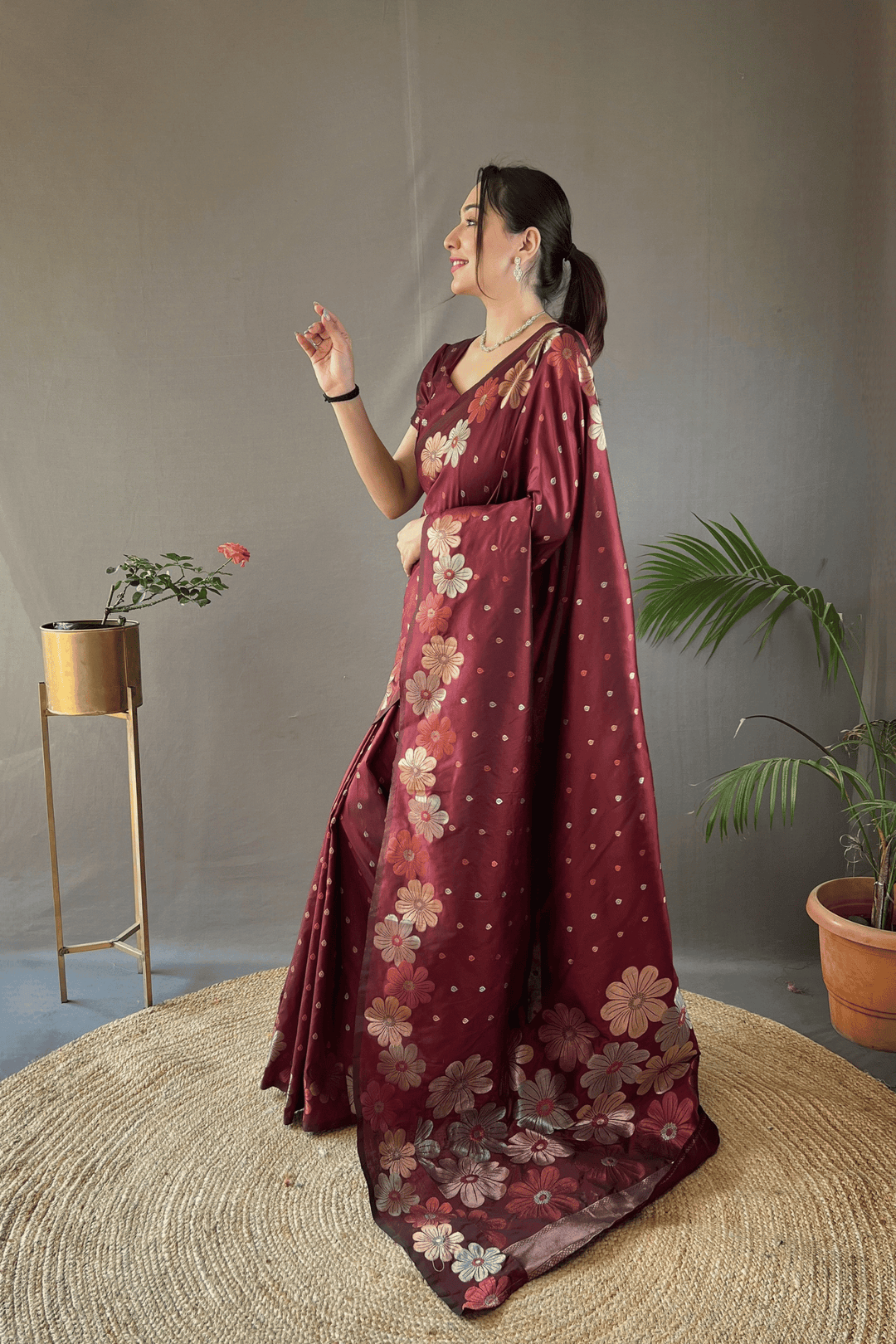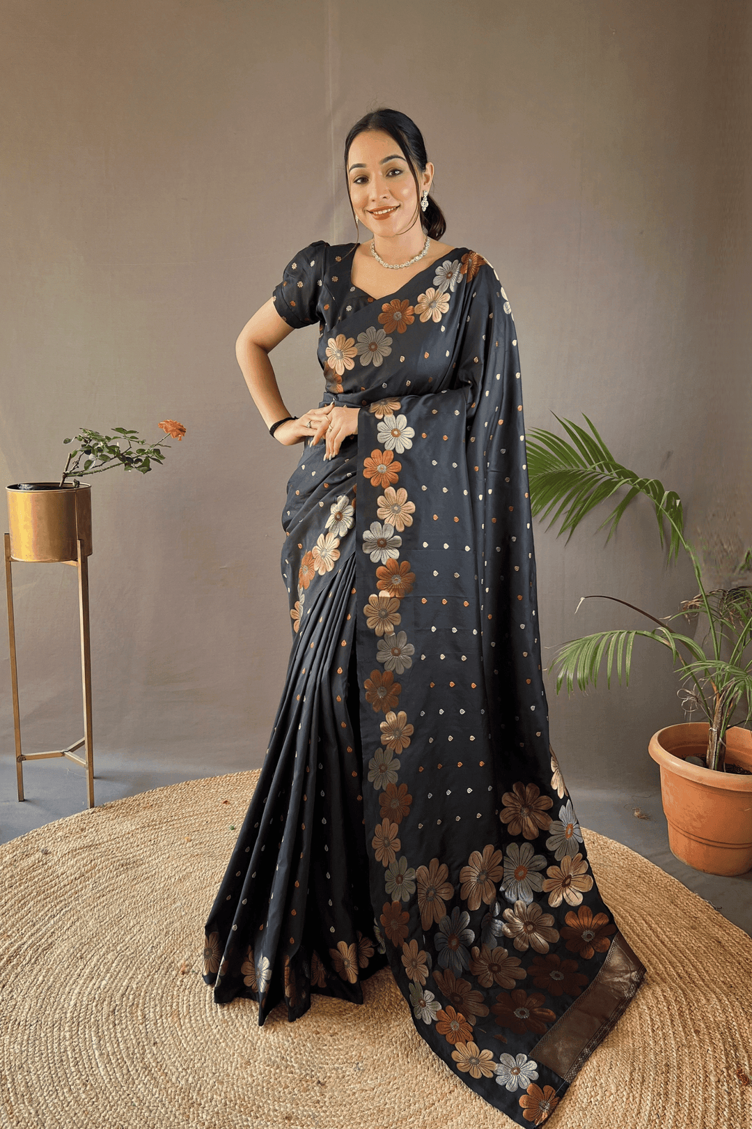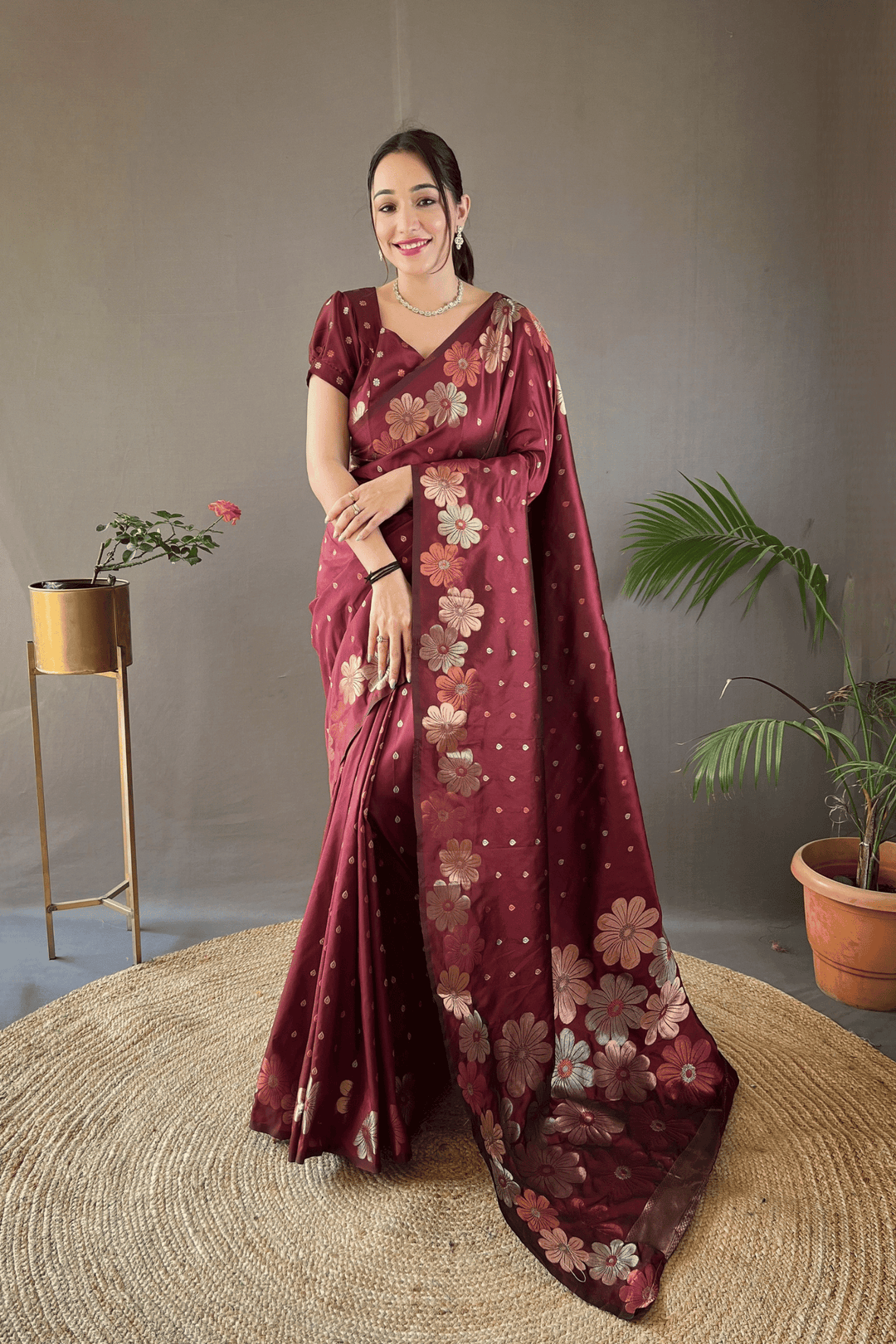 Elevate your style with Ready to Wear Copper Floral Banarasi Saree, a stunning fusion of fashion and luxury.The hooks do NOT show up as they are practically invisible. Just wear a petticoat /pant/skirt and you are ready to drape it! Fits from 28" waist upto 42" waist.