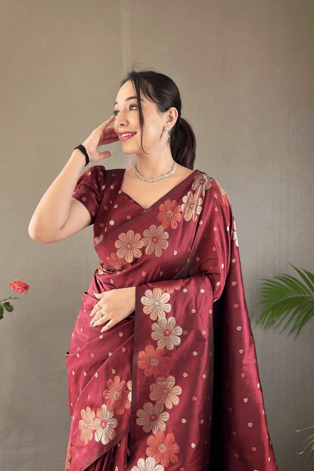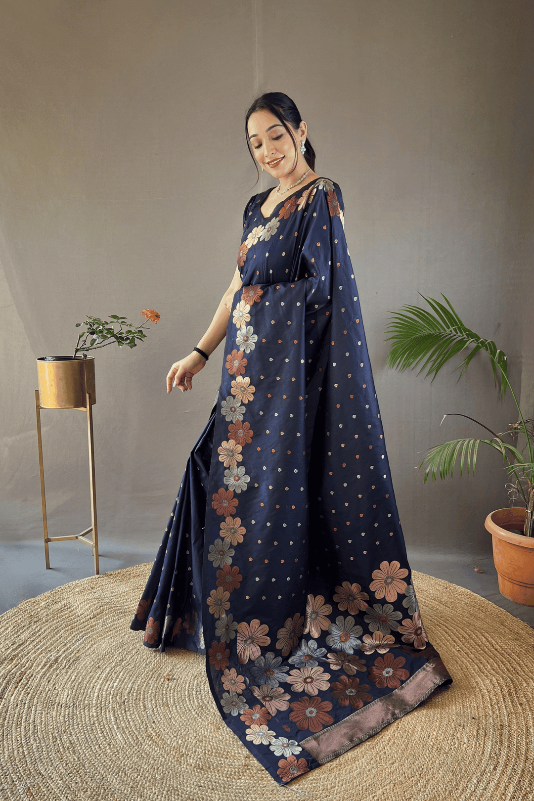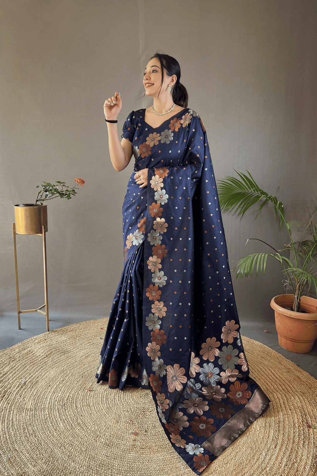Elevate your style with Ready to Wear Copper Floral Banarasi Saree, a stunning fusion of fashion and luxury.The hooks do NOT show up as they are practically invisible. Just wear a petticoat /pant/skirt and you are ready to drape it! Fits from 28" waist upto 42" waist.