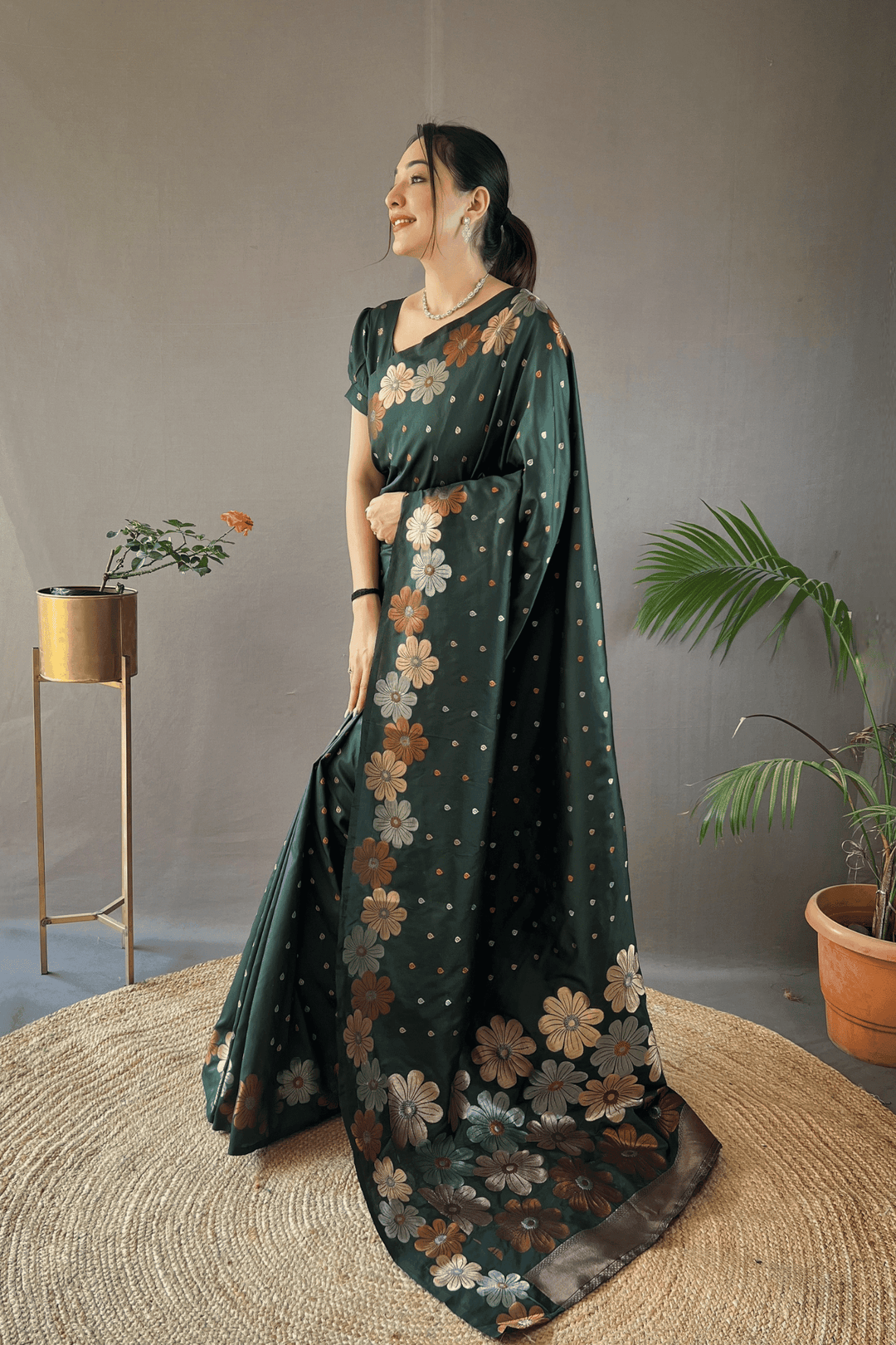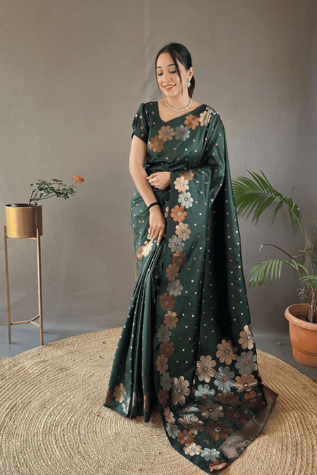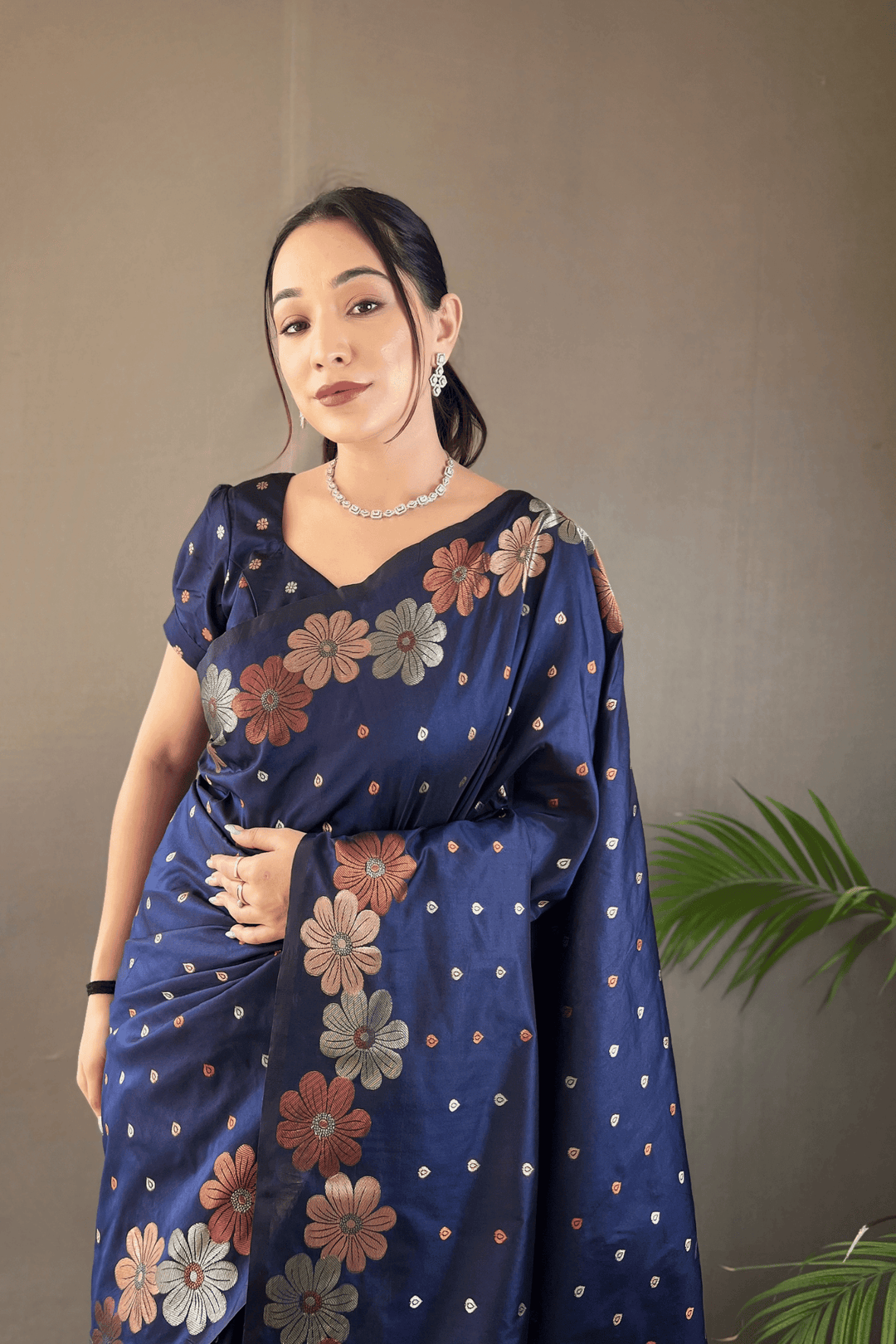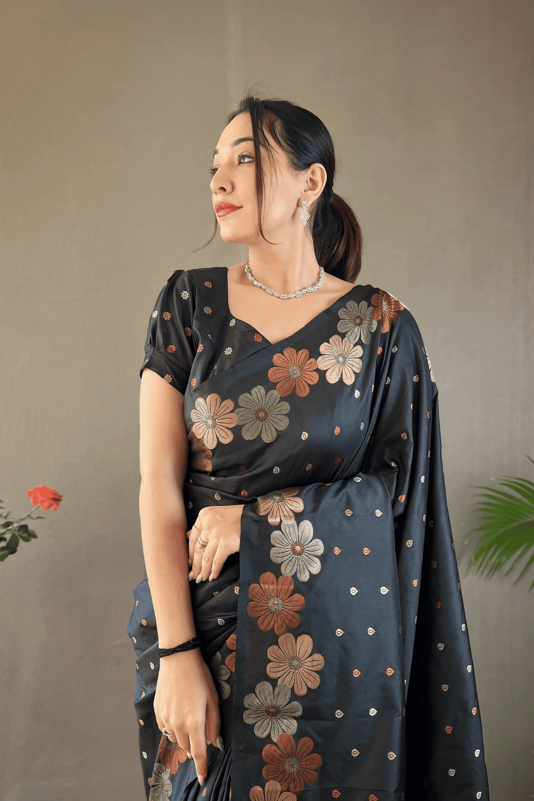 Elevate your style with Ready to Wear Copper Floral Banarasi Saree, a stunning fusion of fashion and luxury.The hooks do NOT show up as they are practically invisible. Just wear a petticoat /pant/skirt and you are ready to drape it! Fits from 28" waist upto 42" waist.