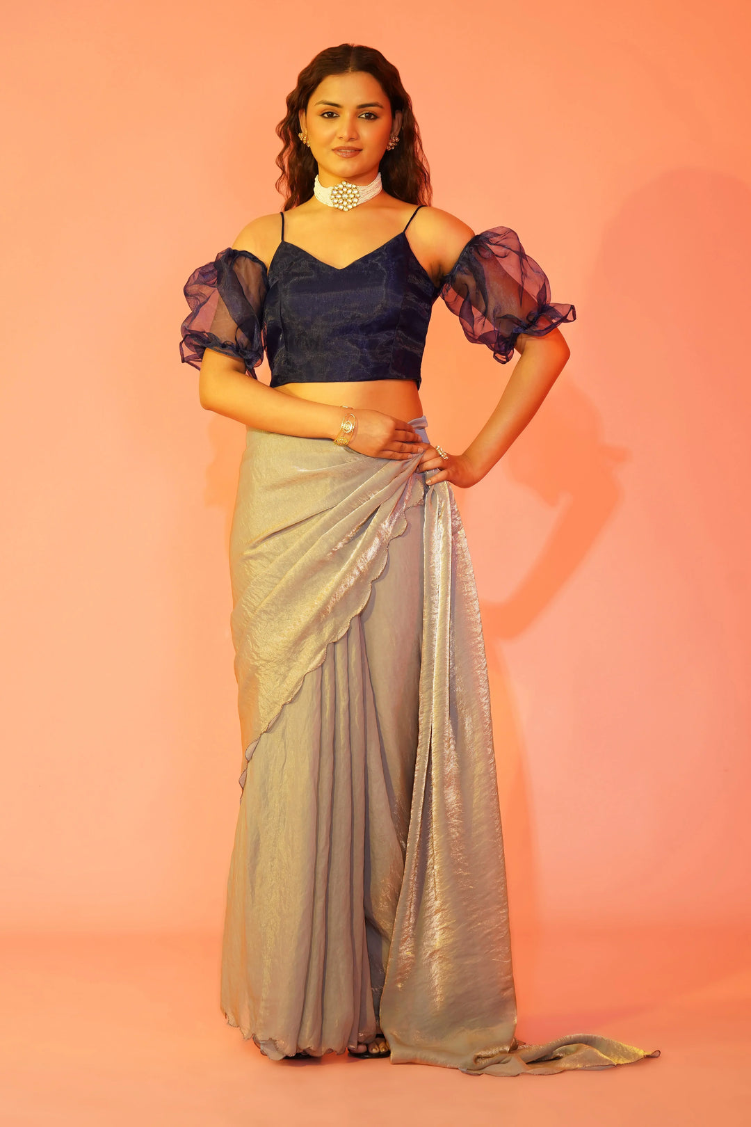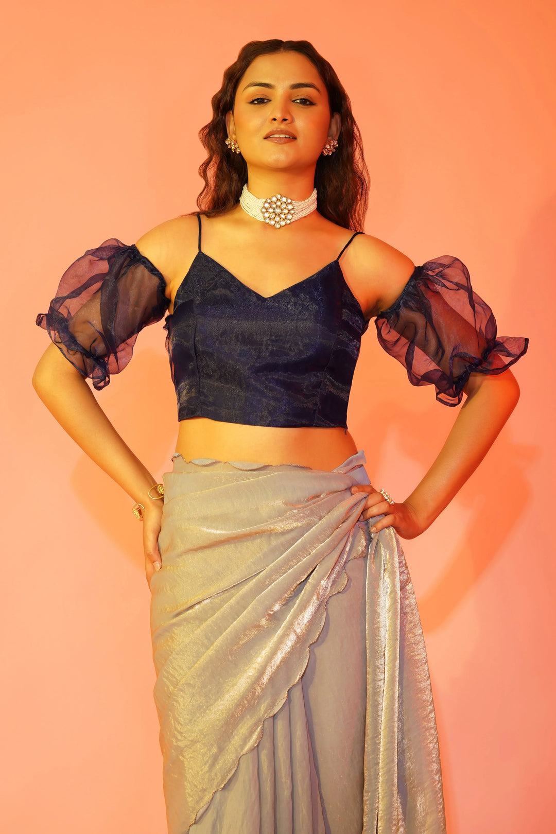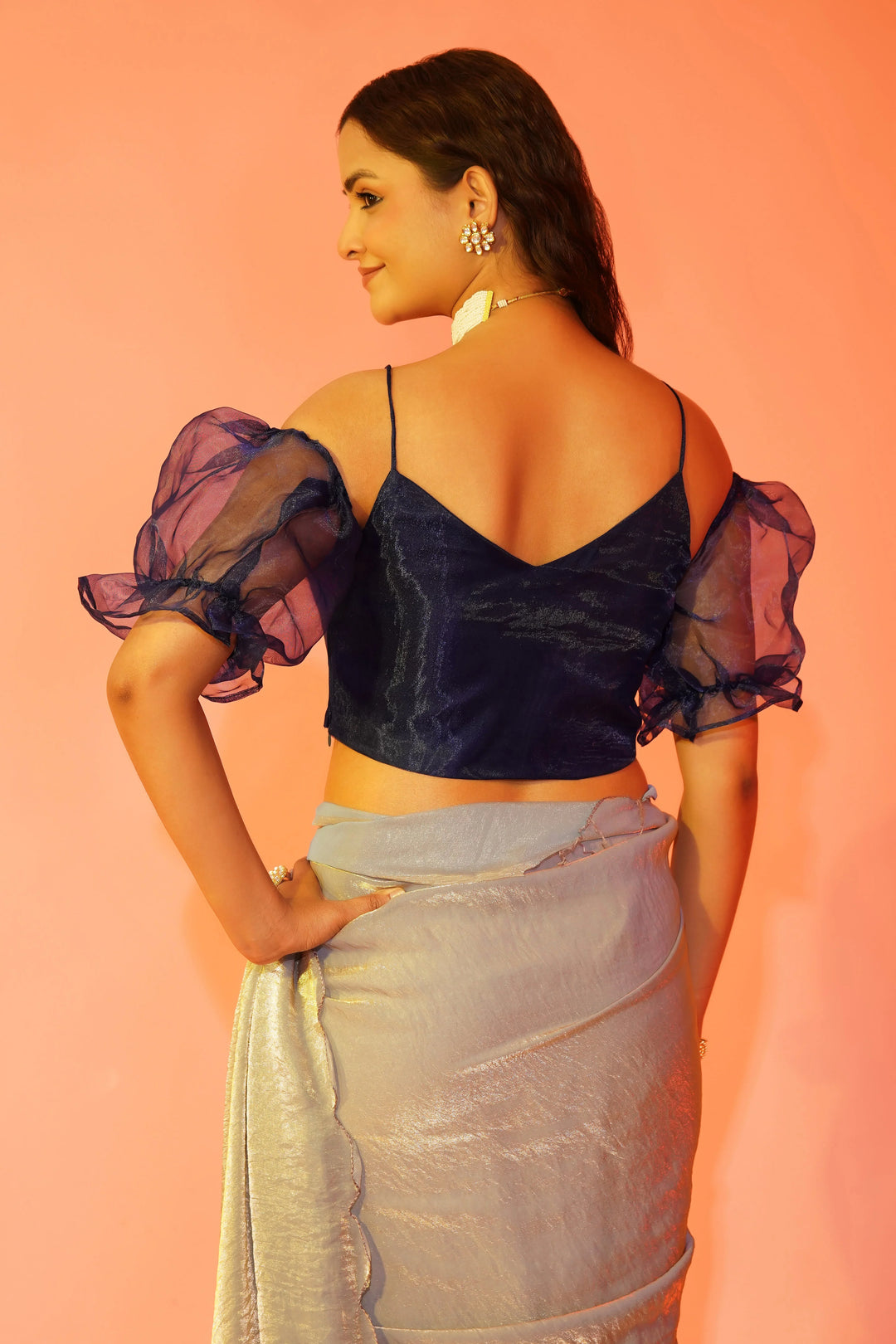 Description:- A Plain Organza solid detachable ruffled sleeved blouse in V neck with noodle straps. The blouse is padded and ideal for daily wear!