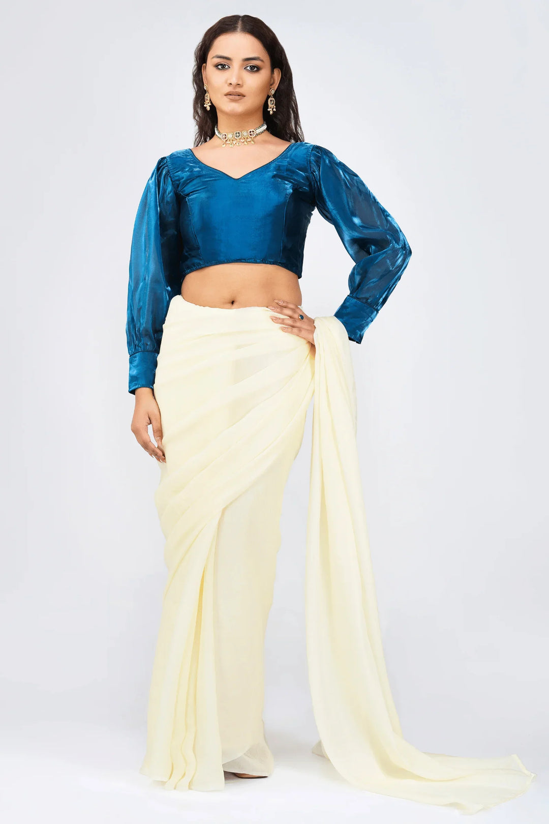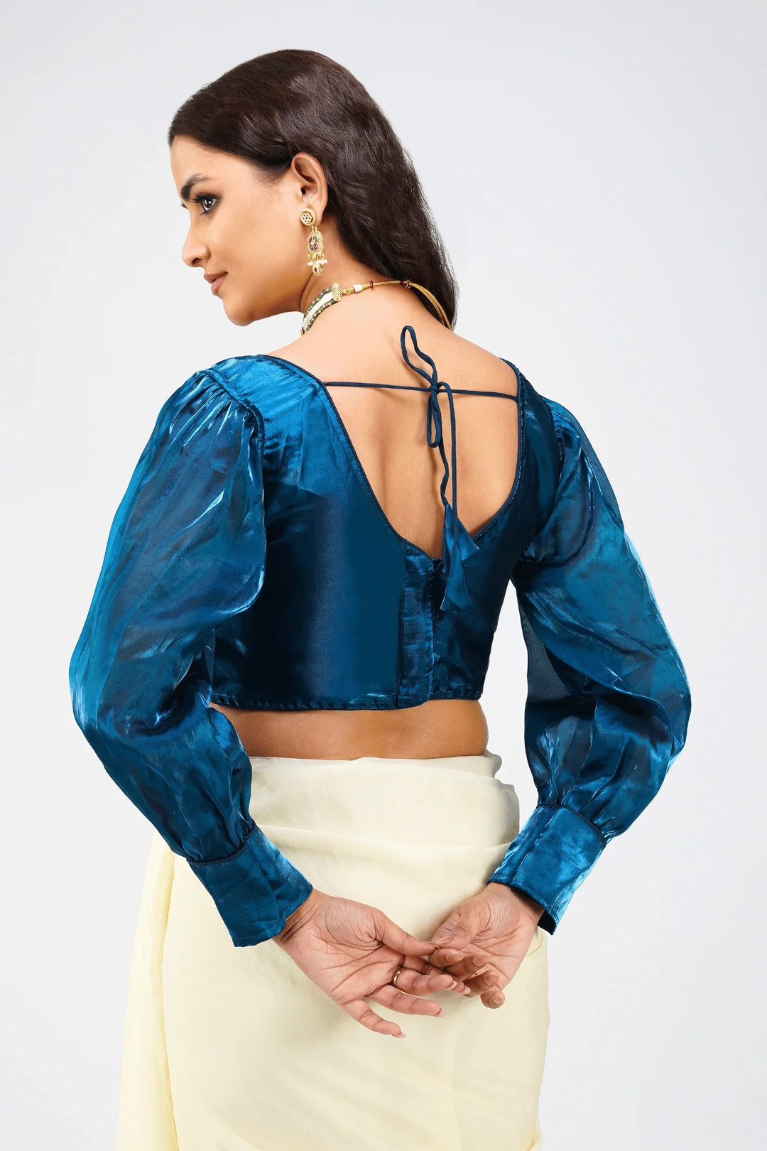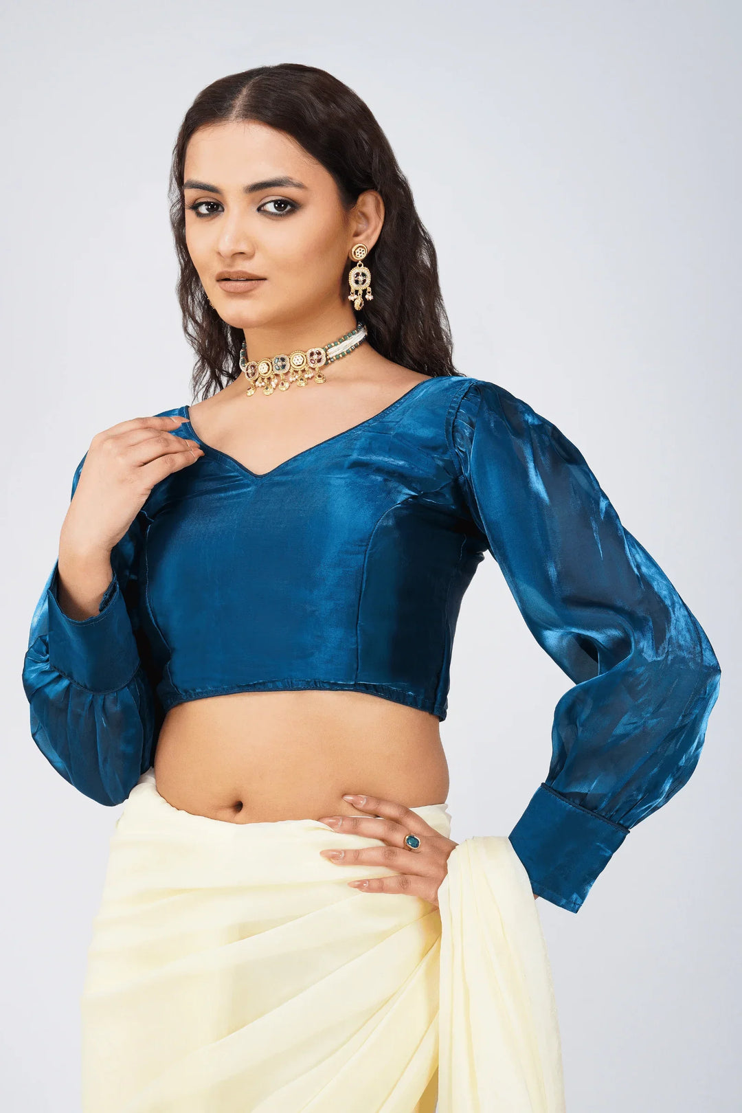 Description:- A Plain Blue color Organza blouse with full length sleeves . Blouse has a stylized front V- neck with pleated bodice. It has a Hook closure and a tie at the shoulder for that perfect fitting. The blouse is padded so you never have to worry about matching the right innerwear!