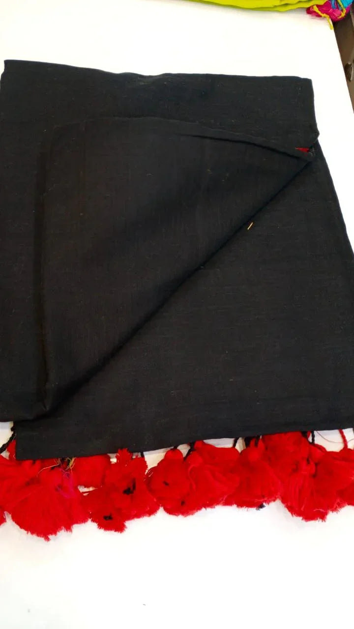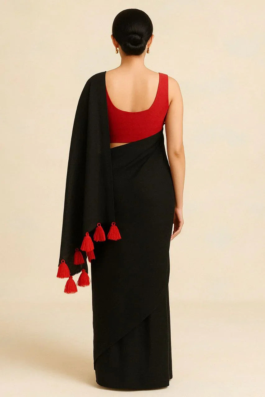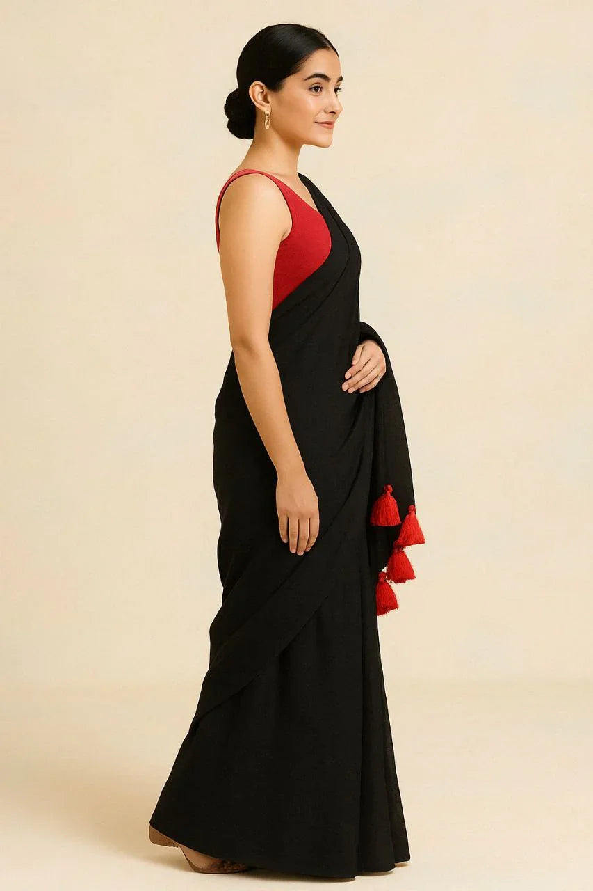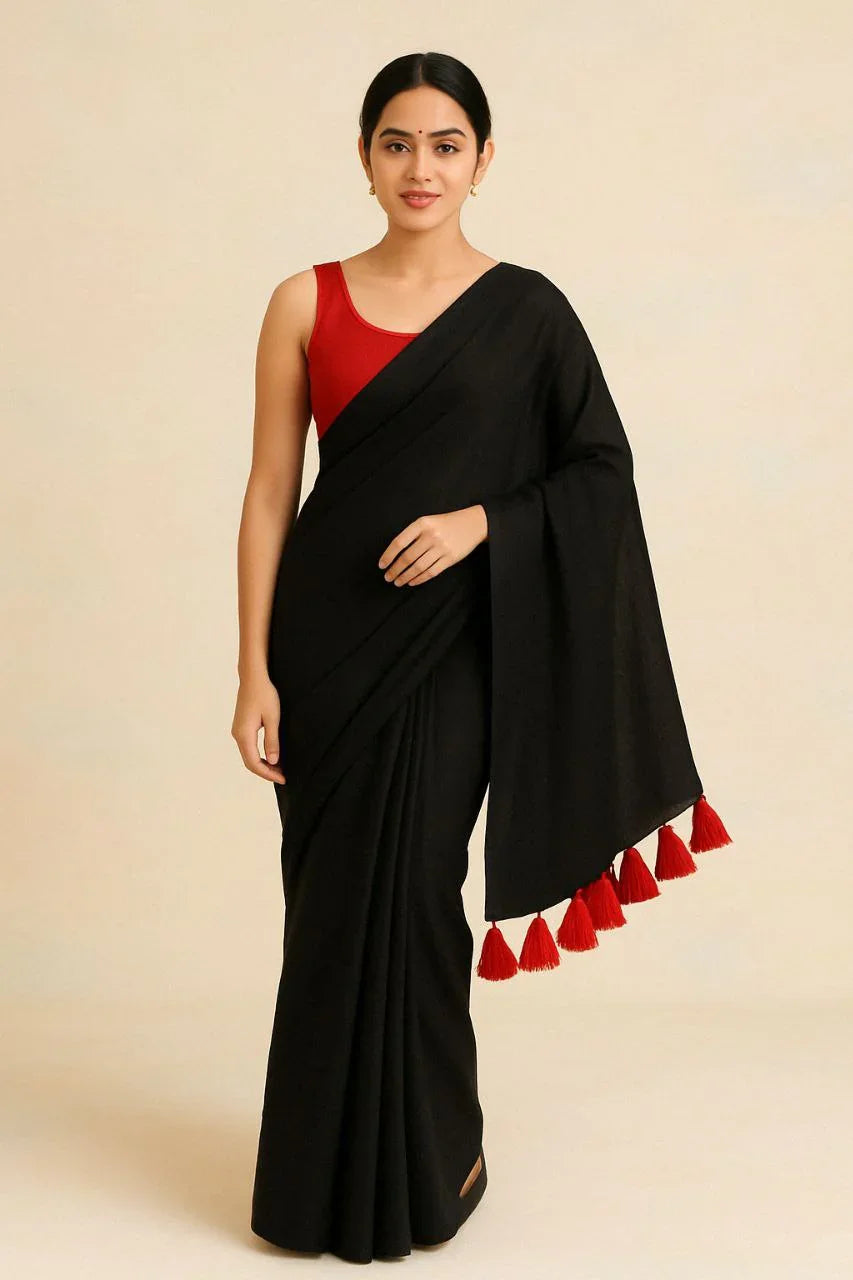 Radiate sunshine and confidence in this Black mul cotton saree, enhanced with playful red tassels for that extra pop of personality. Crafted in soft, breathable mul cotton, this saree is designed to keep you cool and stylish all day long.
