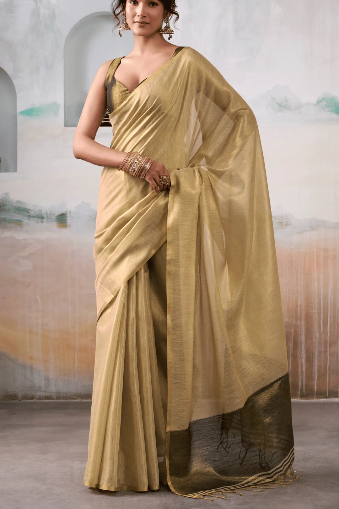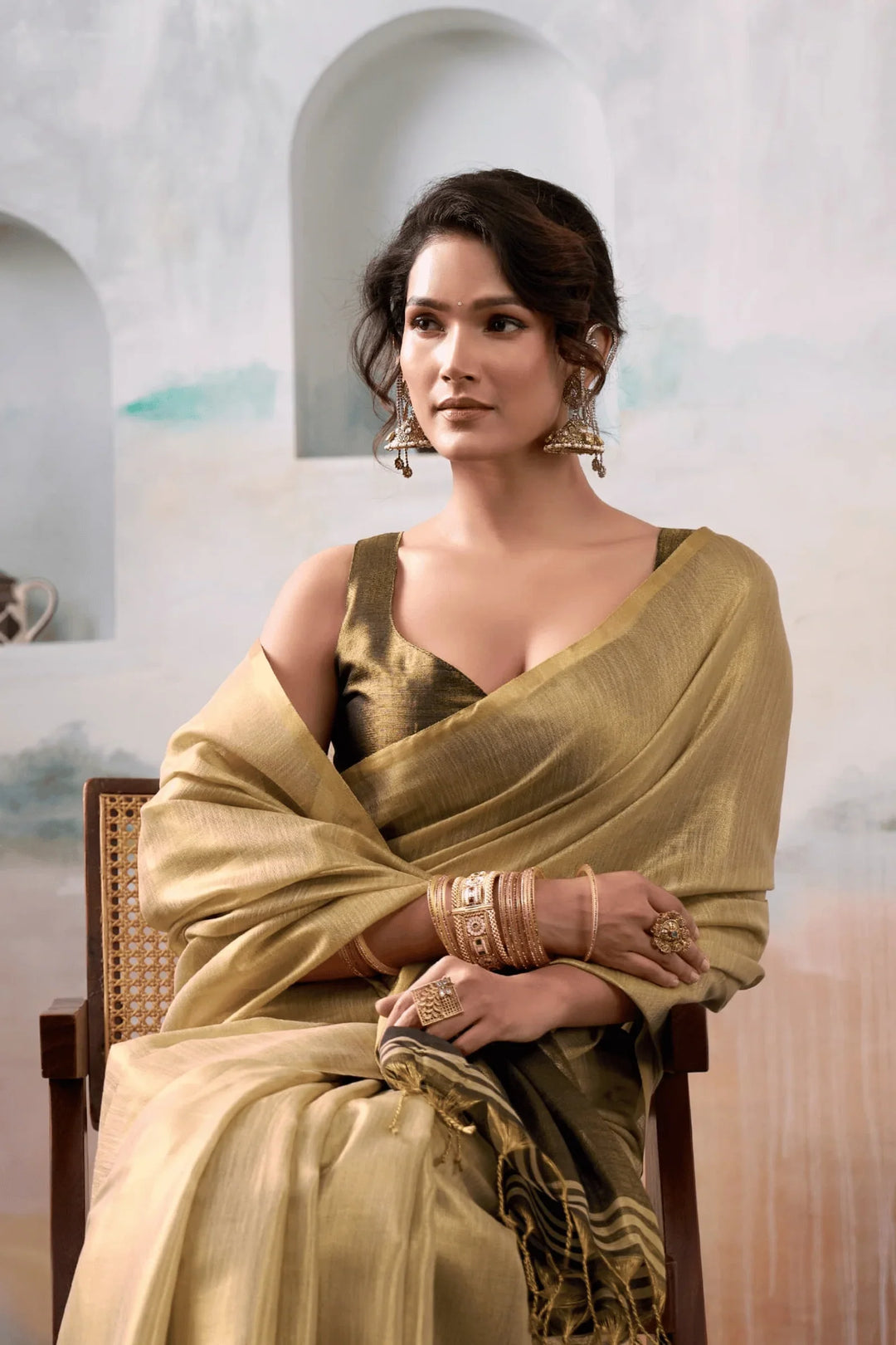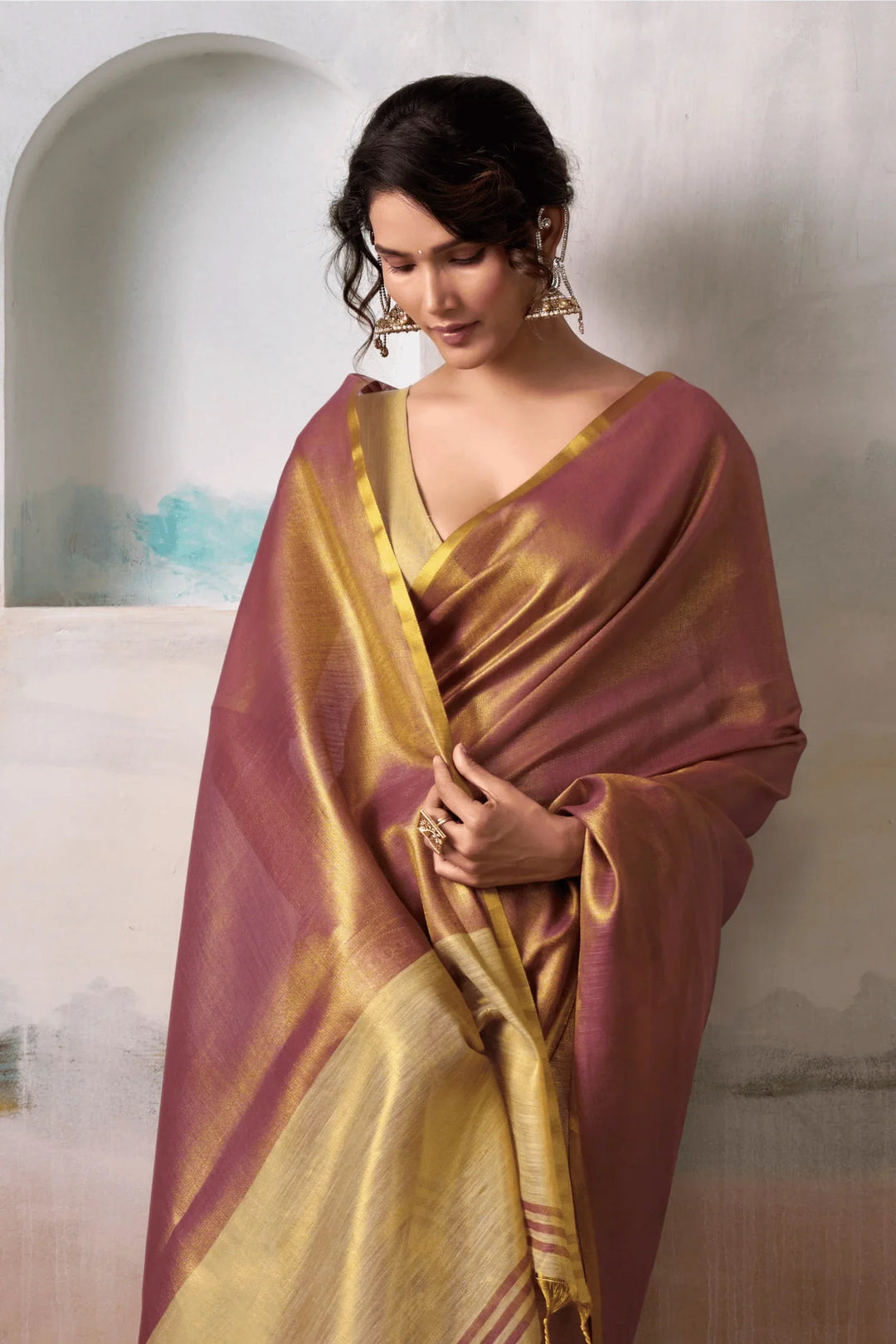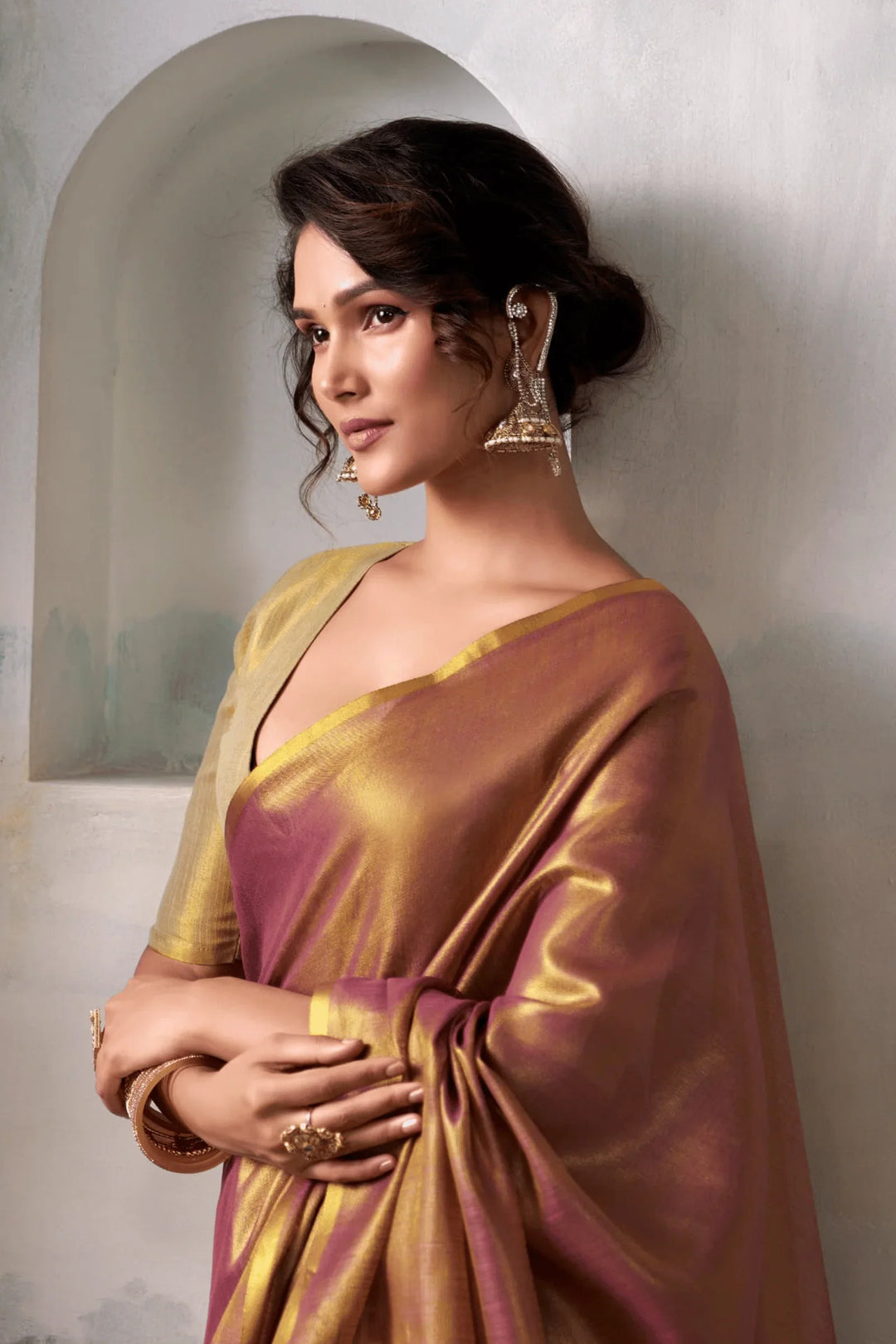 Drape yourself in the elegance of a Celeste Glow— a pre-stitched tissue saree kissed with golden zari. This saree is a perfect blend of traditional craftsmanship and modern ease, designed for the woman who owns every room she walks into.