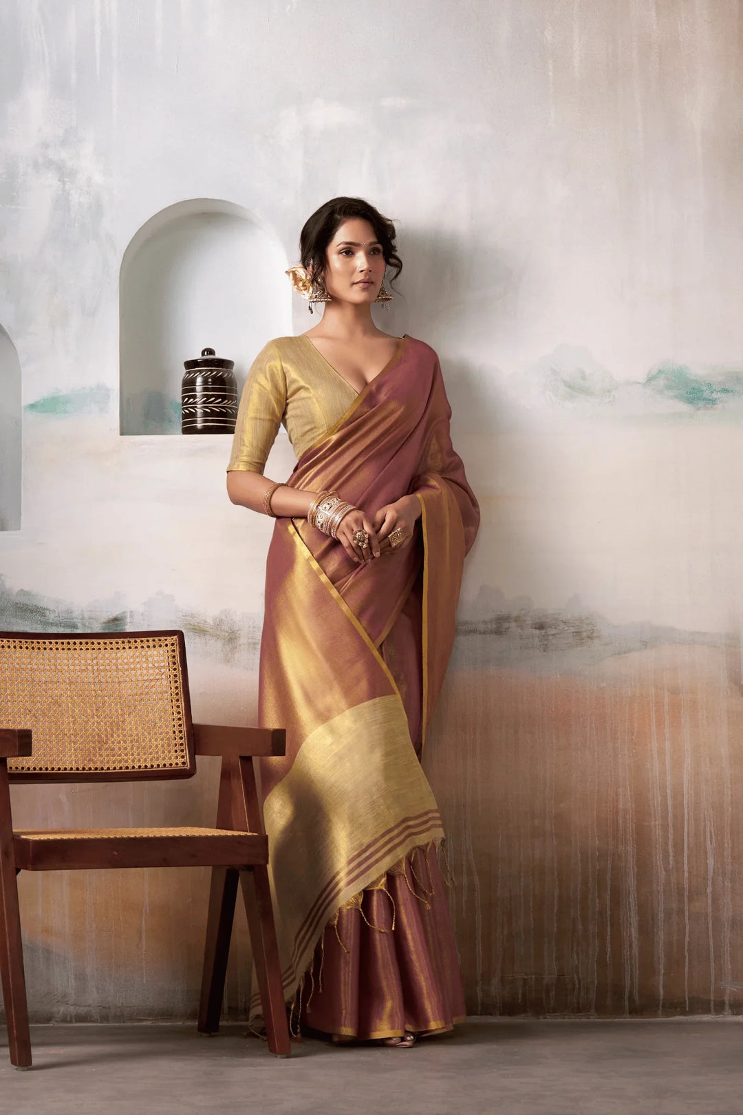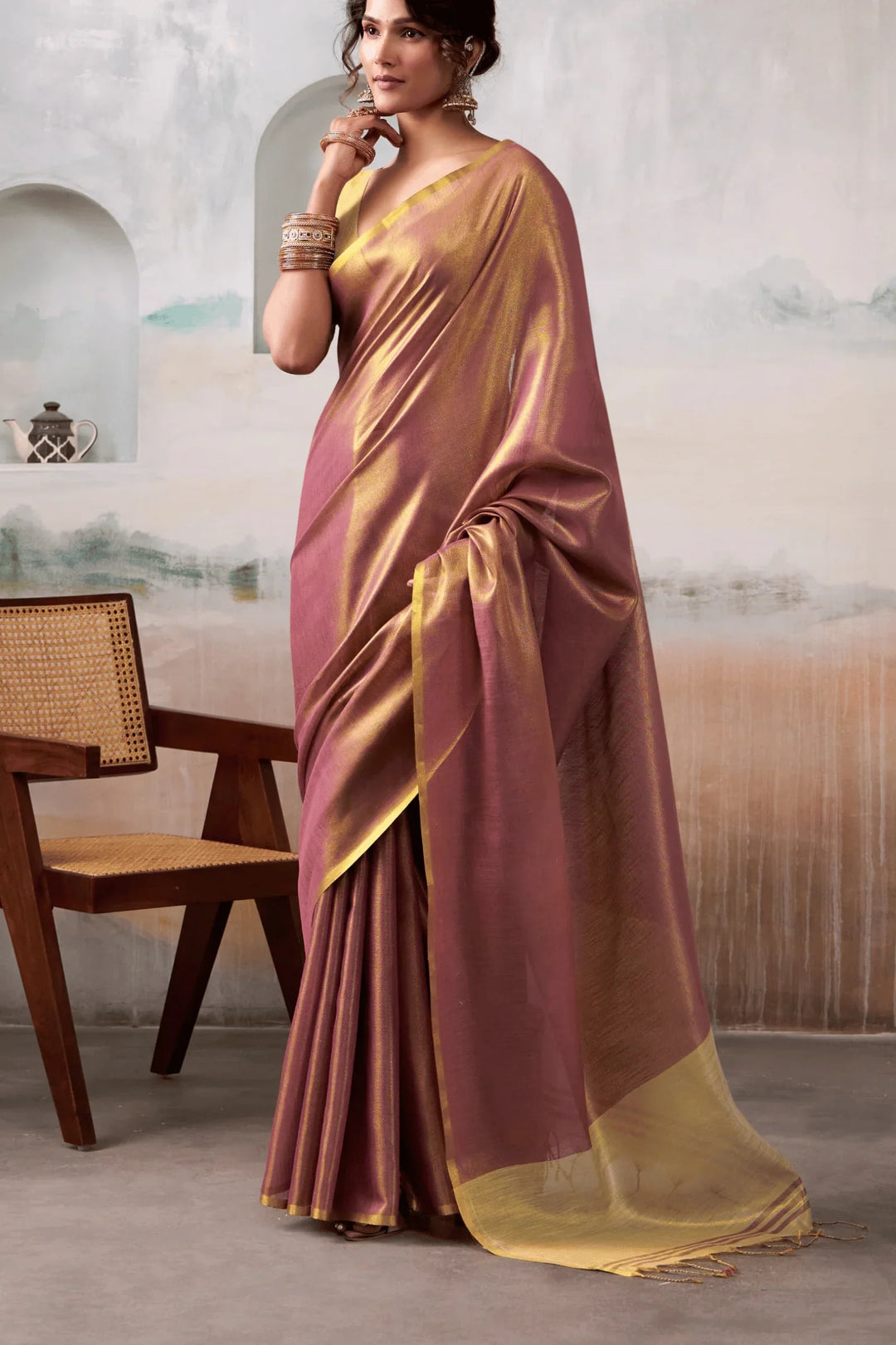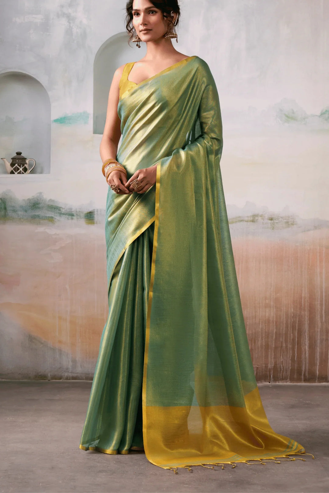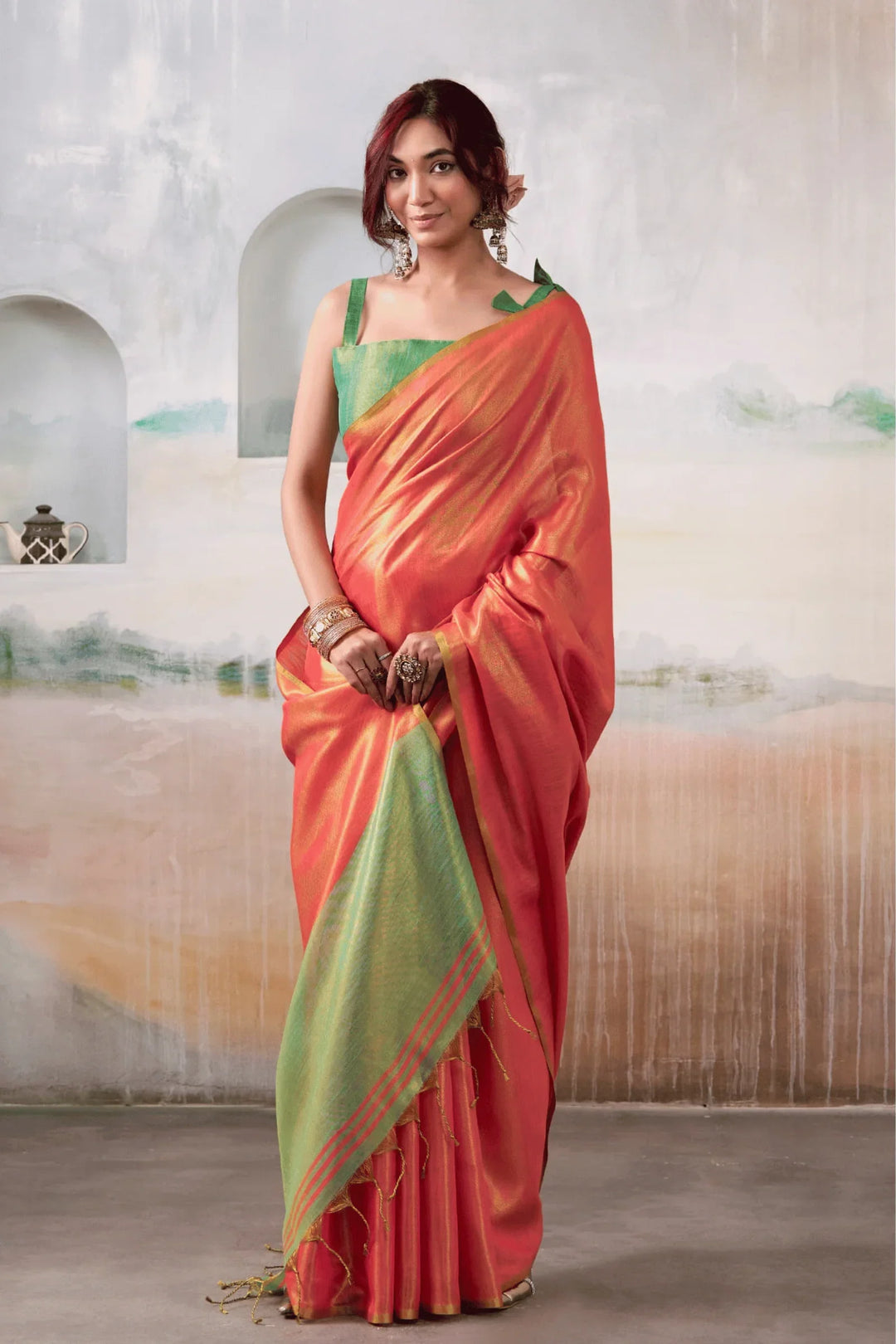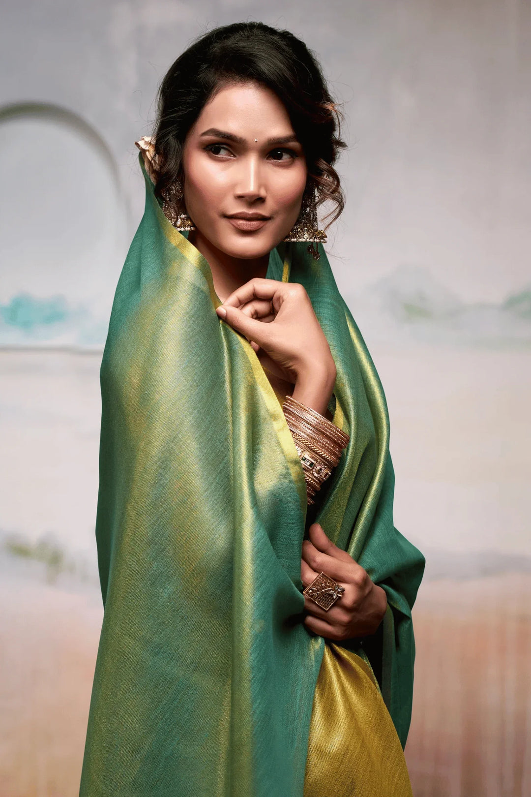 Drape yourself in the elegance of a Celeste Glow— a pre-stitched tissue saree kissed with golden zari. This saree is a perfect blend of traditional craftsmanship and modern ease, designed for the woman who owns every room she walks into.