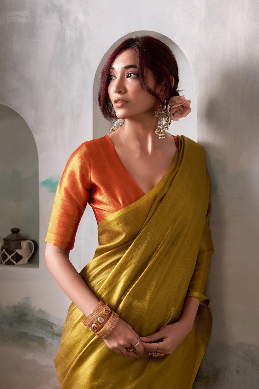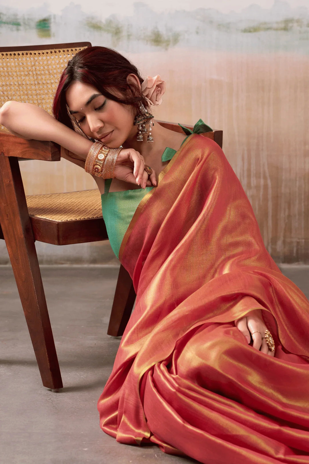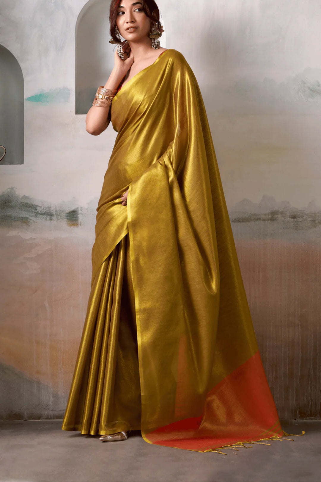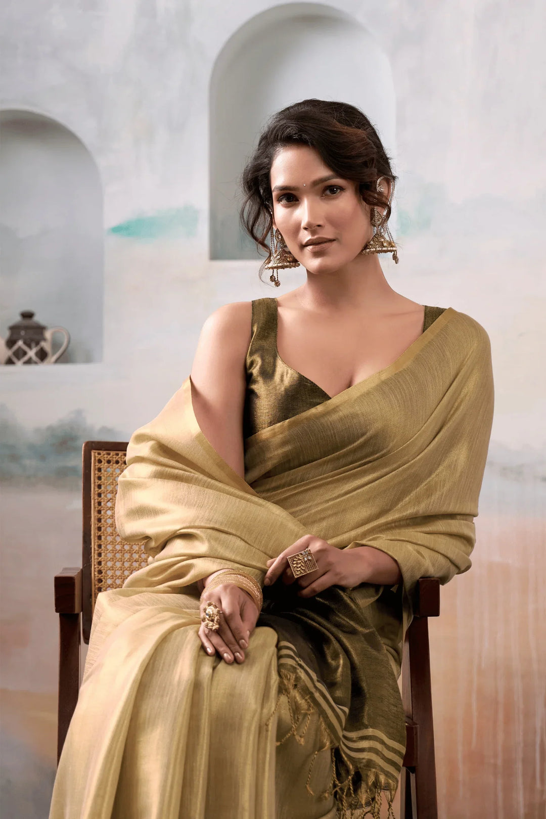 Drape yourself in the elegance of a Celeste Glow— a pre-stitched tissue saree kissed with golden zari. This saree is a perfect blend of traditional craftsmanship and modern ease, designed for the woman who owns every room she walks into.