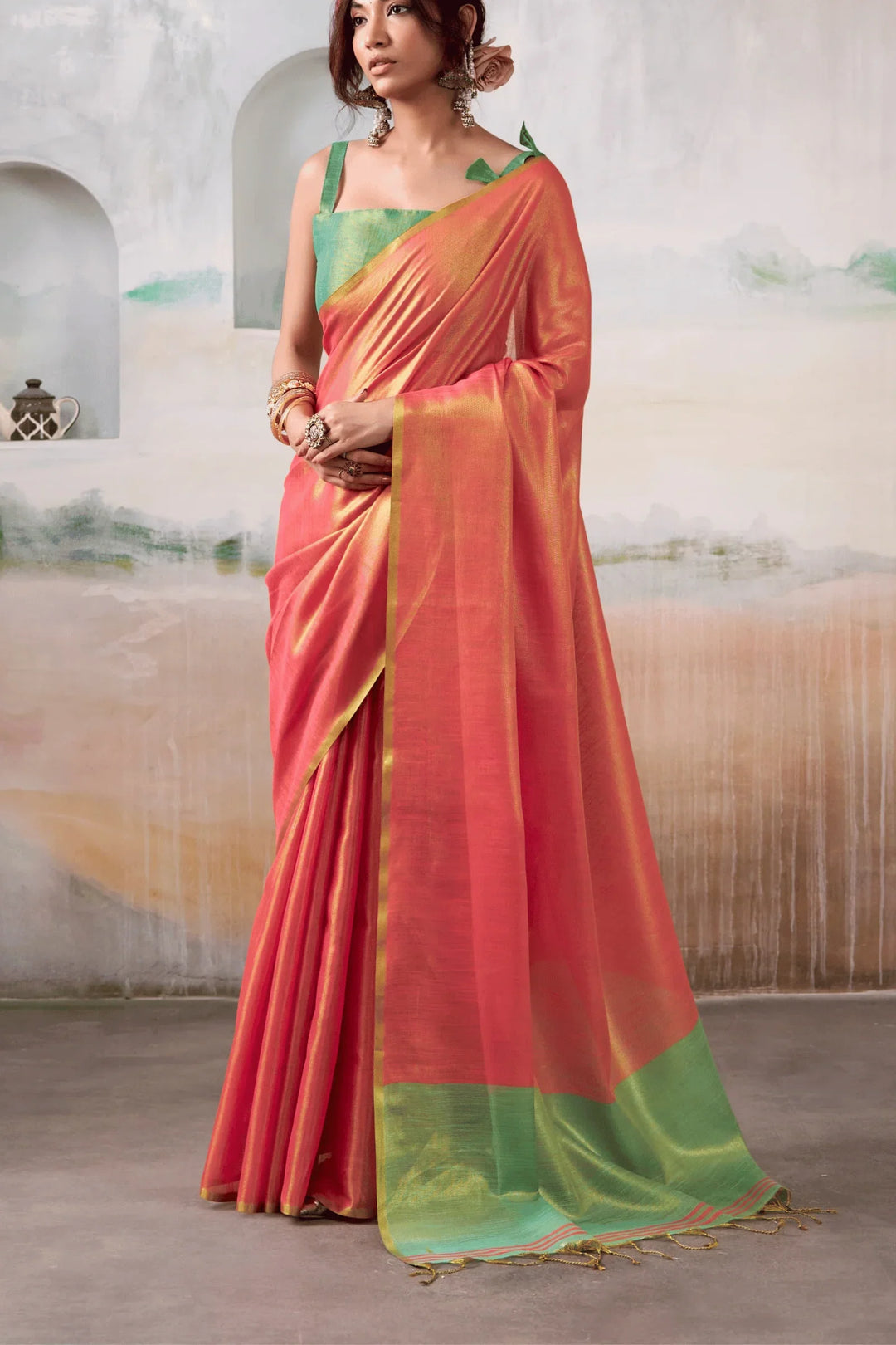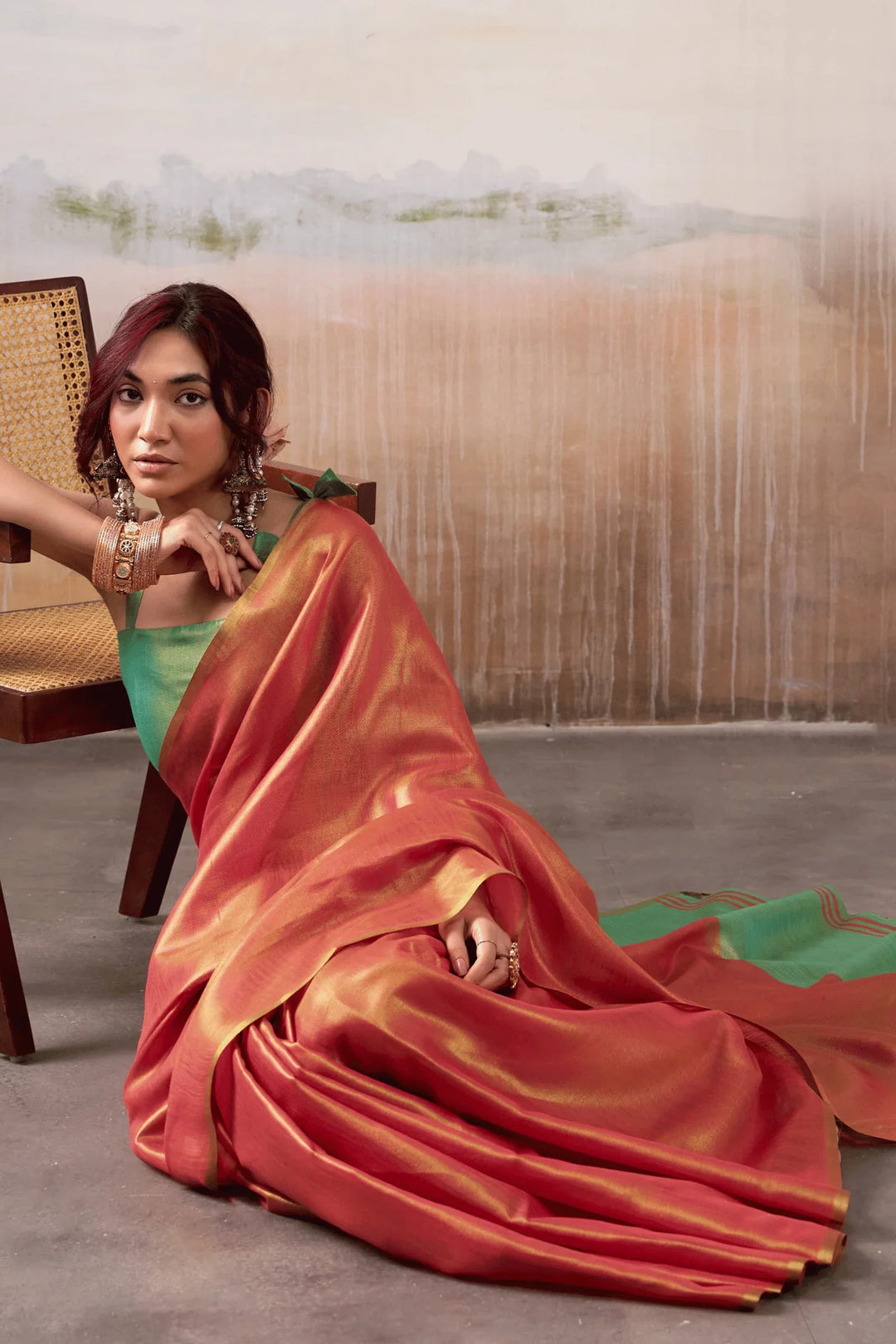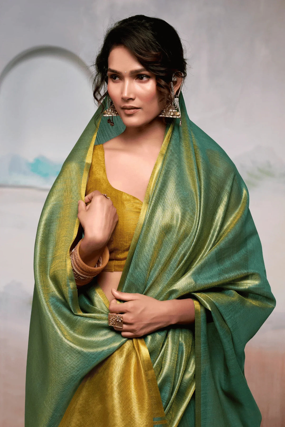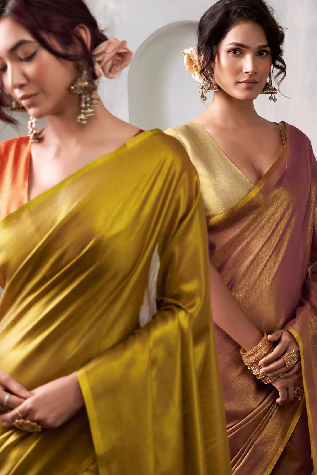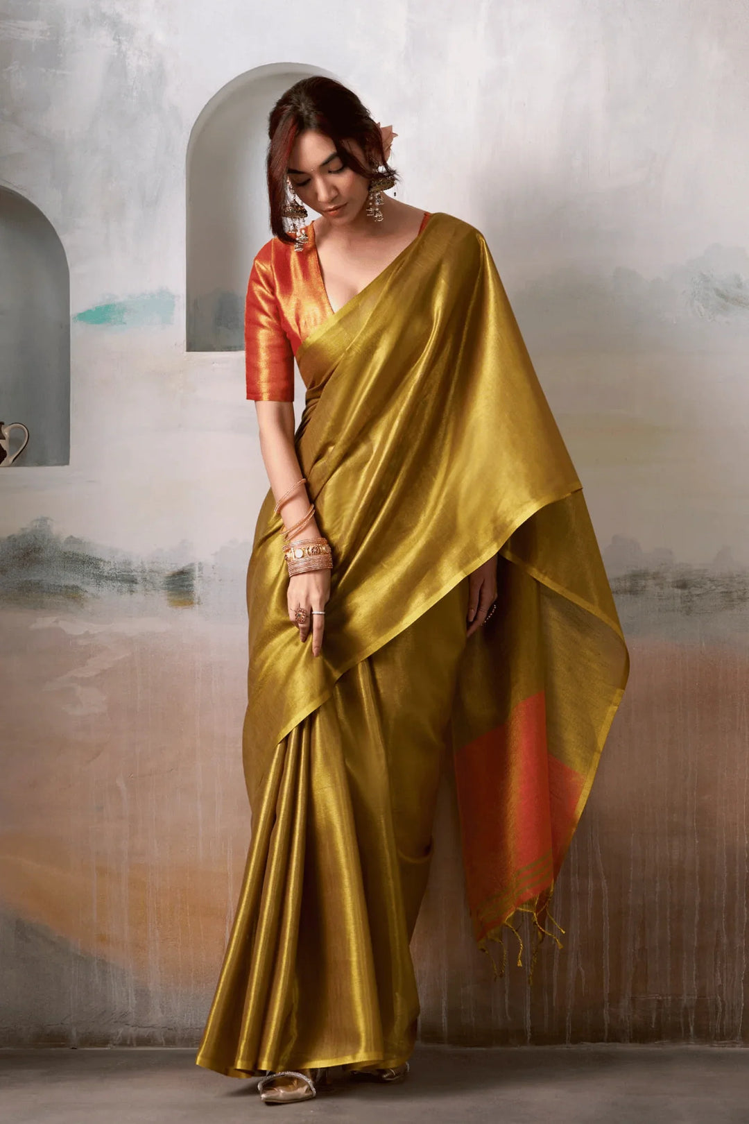 Drape yourself in the elegance of a Celeste Glow— a pre-stitched tissue saree kissed with golden zari. This saree is a perfect blend of traditional craftsmanship and modern ease, designed for the woman who owns every room she walks into.