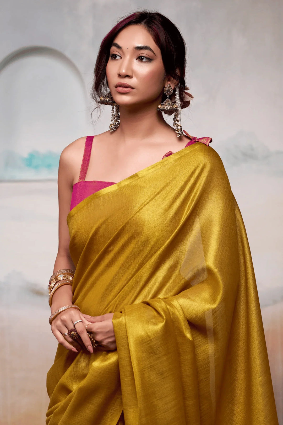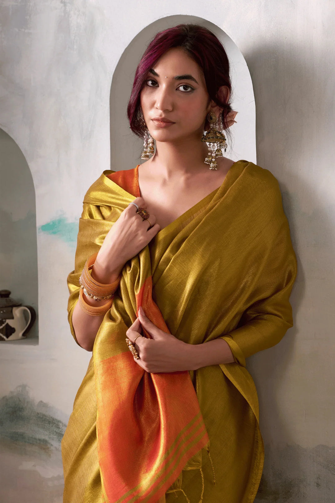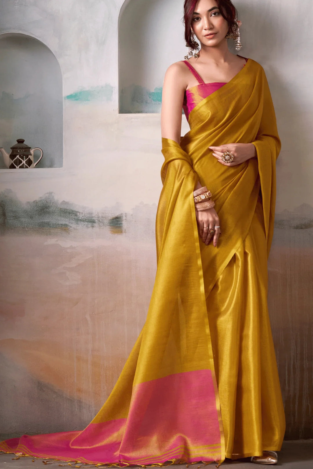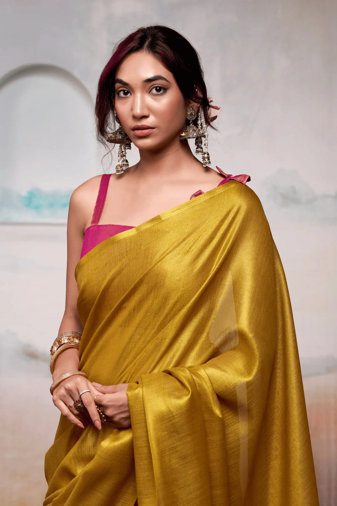 Drape yourself in the elegance of a Celeste Glow— a pre-stitched tissue saree kissed with golden zari. This saree is a perfect blend of traditional craftsmanship and modern ease, designed for the woman who owns every room she walks into.