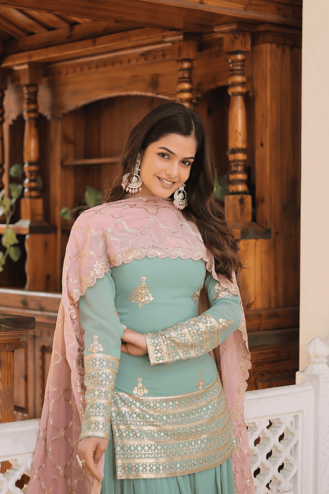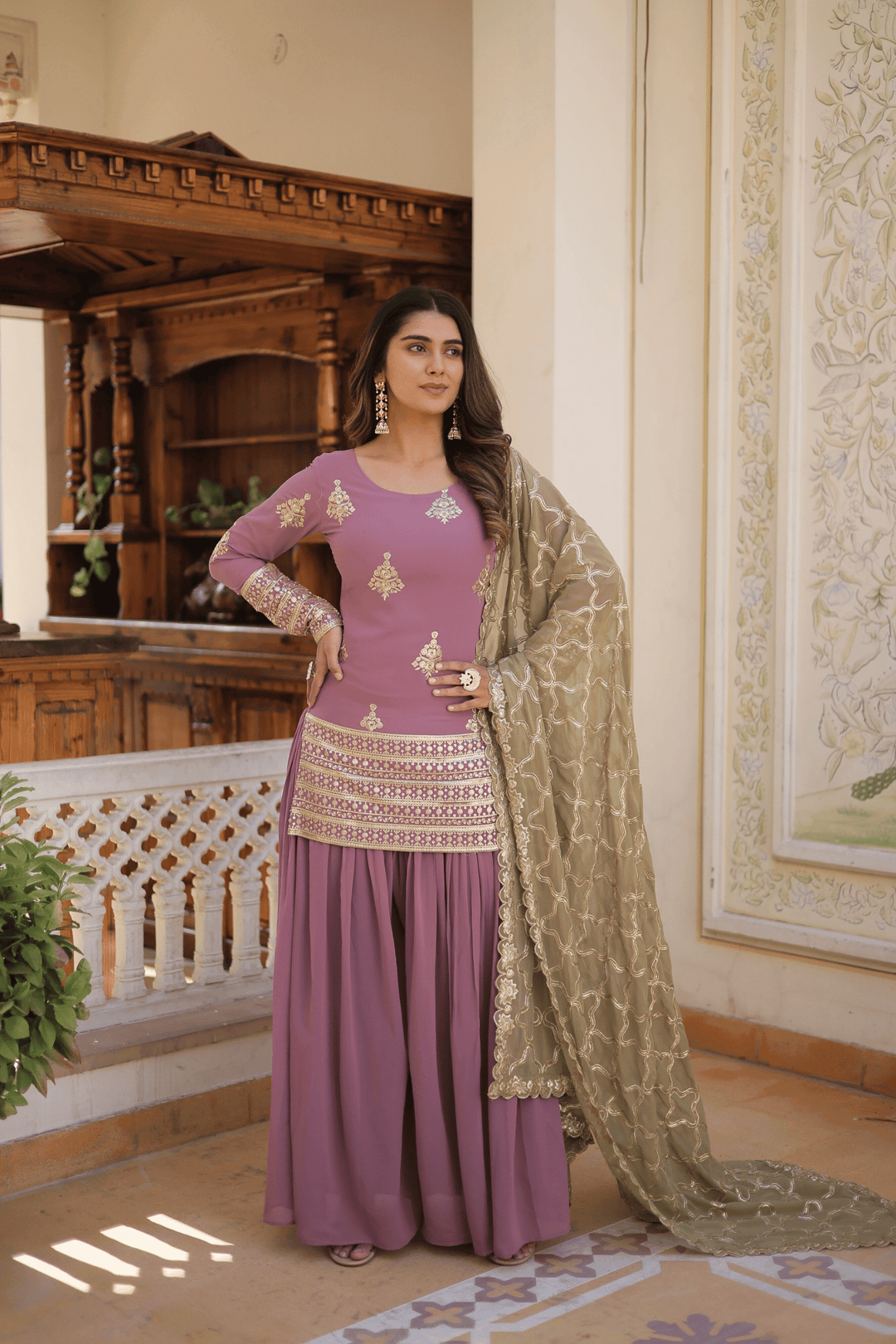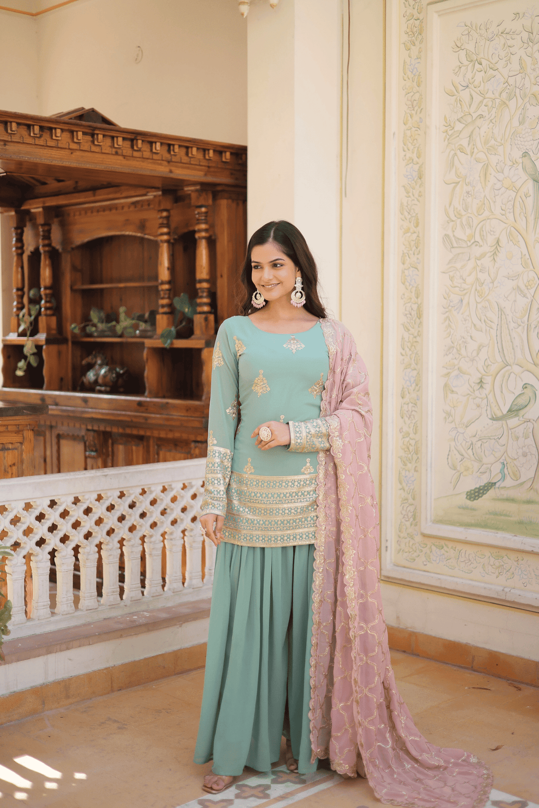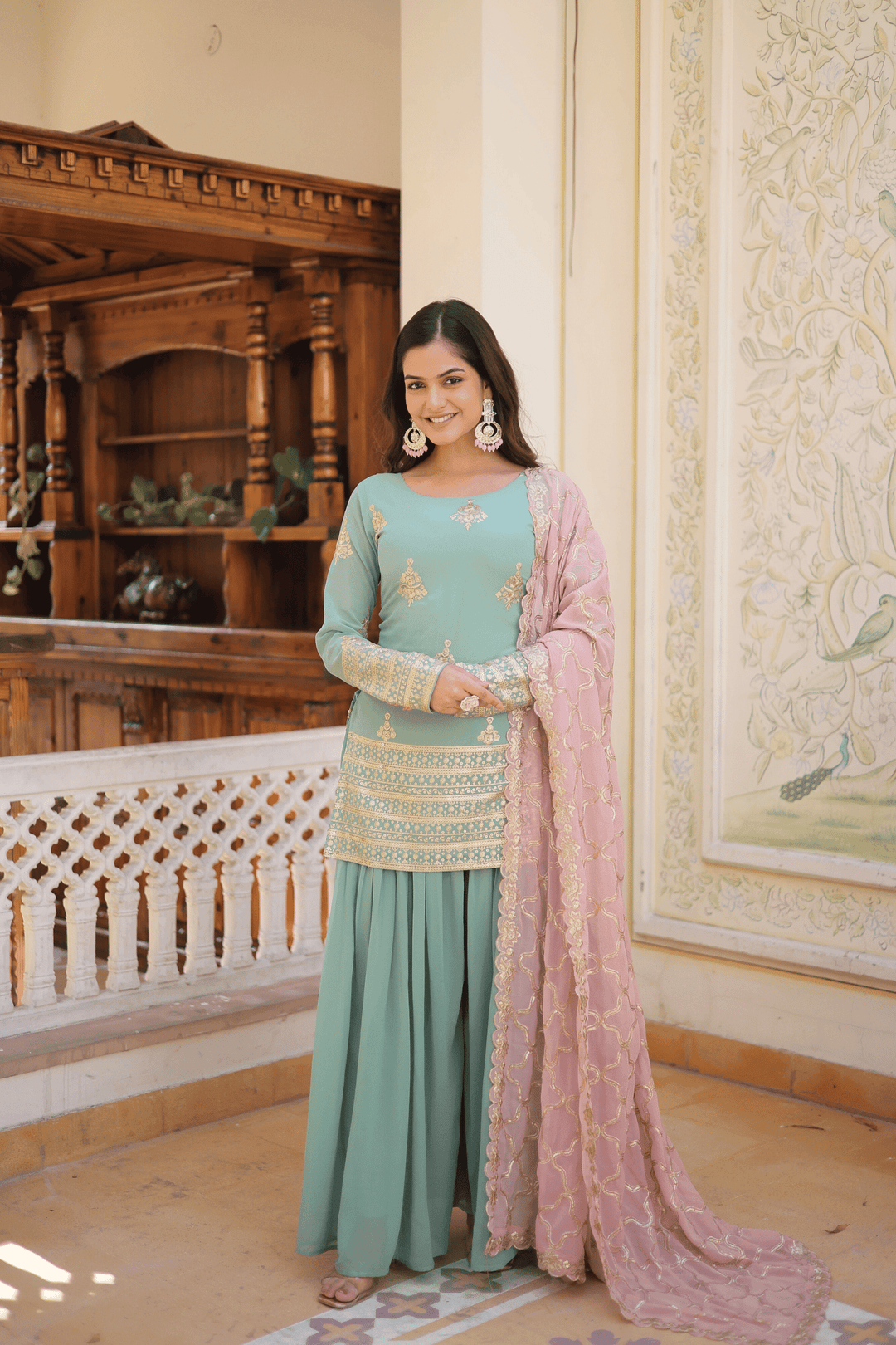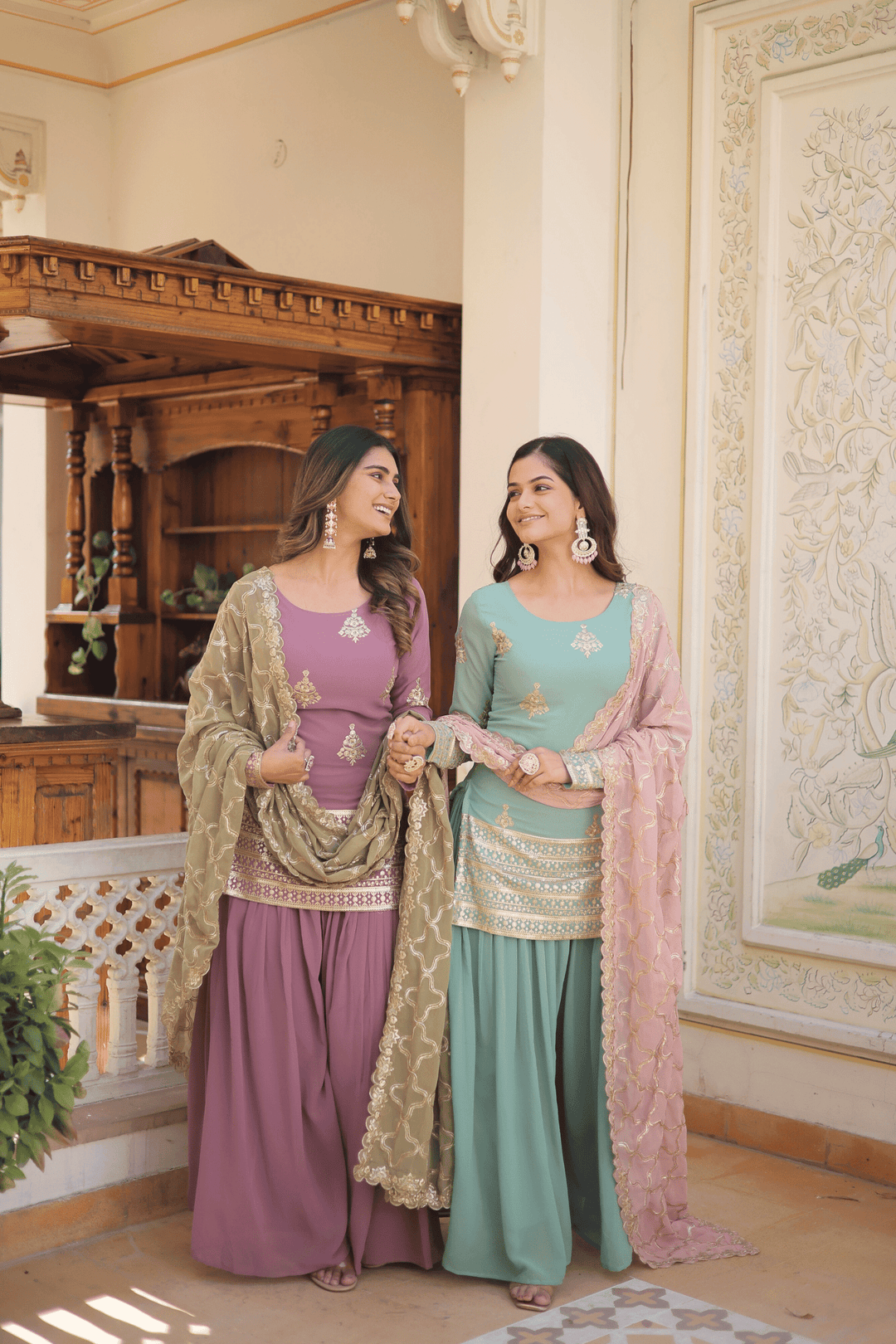 Introducing Glamwiz Sequins Embellished sharara suit, in georgette fabric crafted in beautiful pastel colors. This Suit is ideal for occasional wear or festive wear.