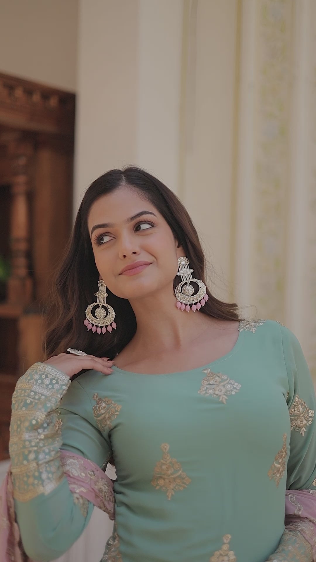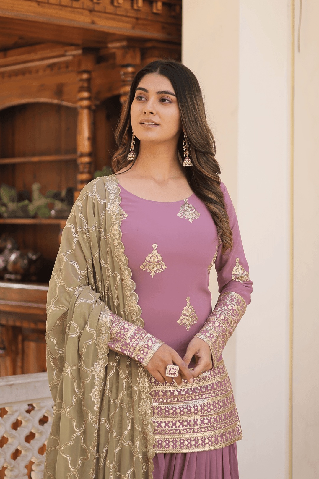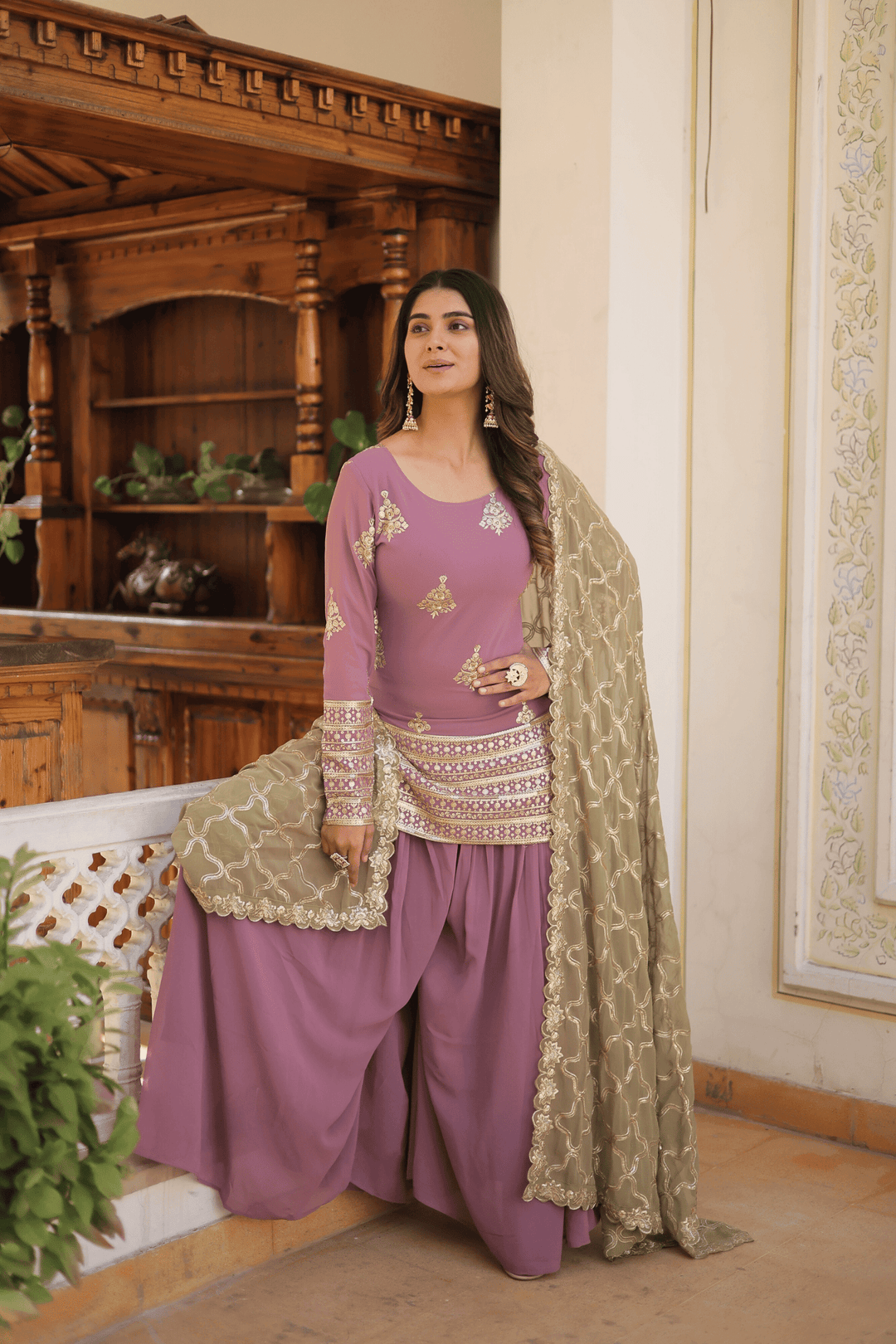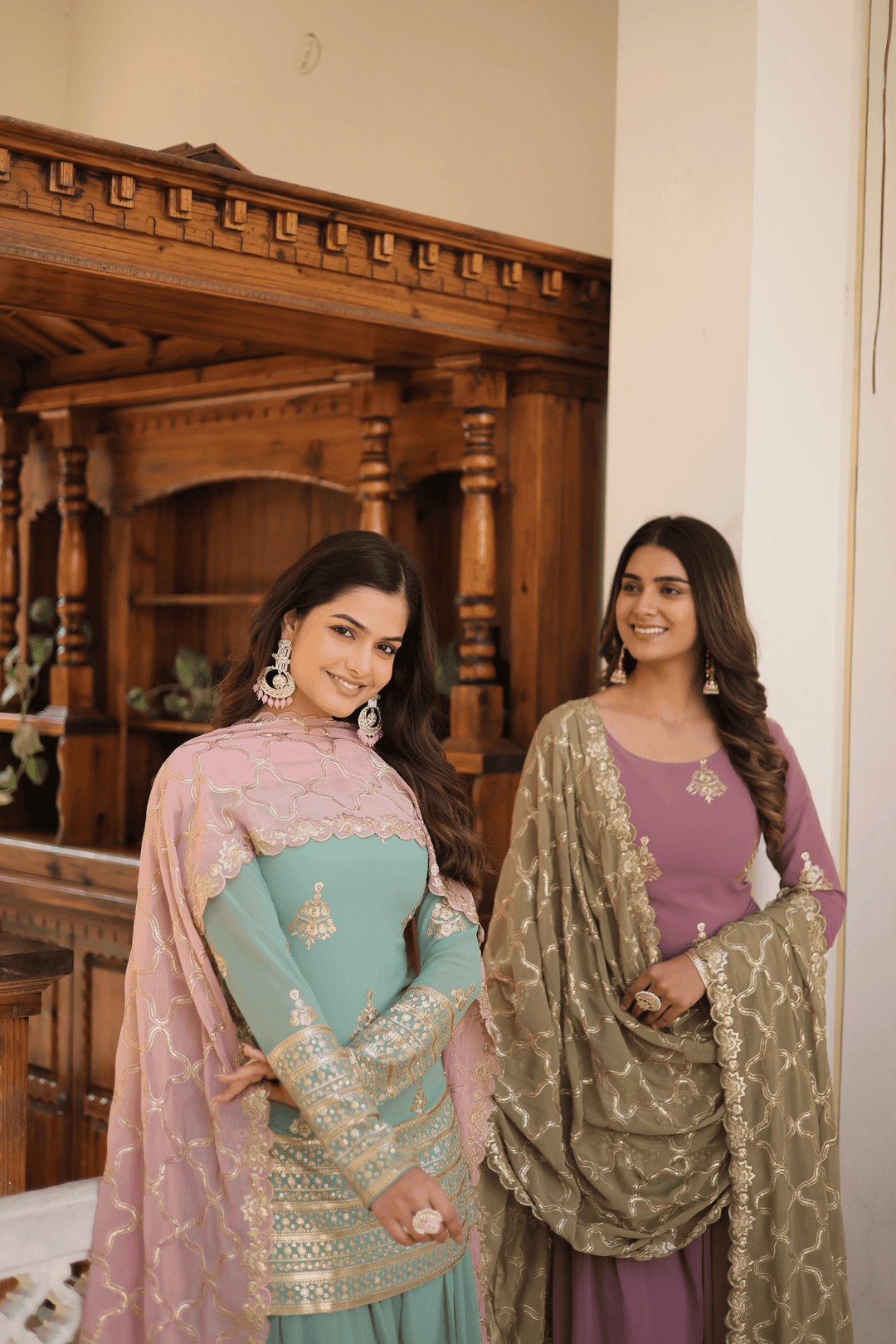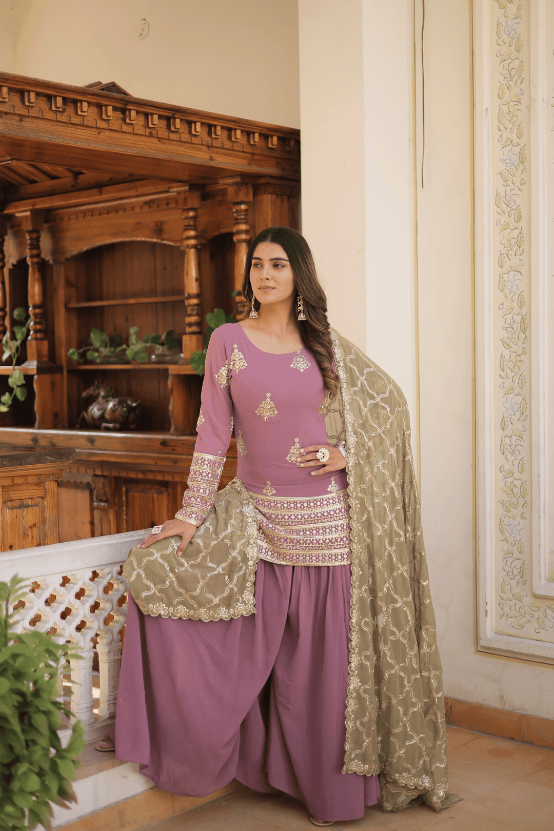 Introducing Glamwiz Sequins Embellished sharara suit, in georgette fabric crafted in beautiful pastel colors. This Suit is ideal for occasional wear or festive wear.