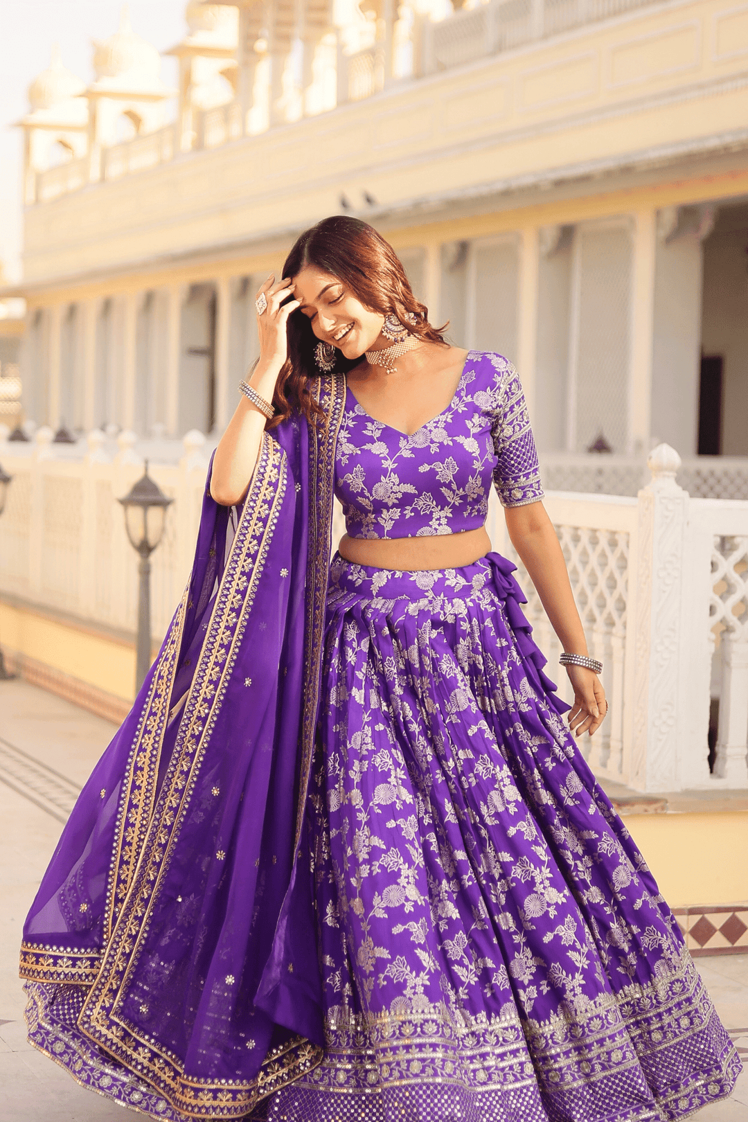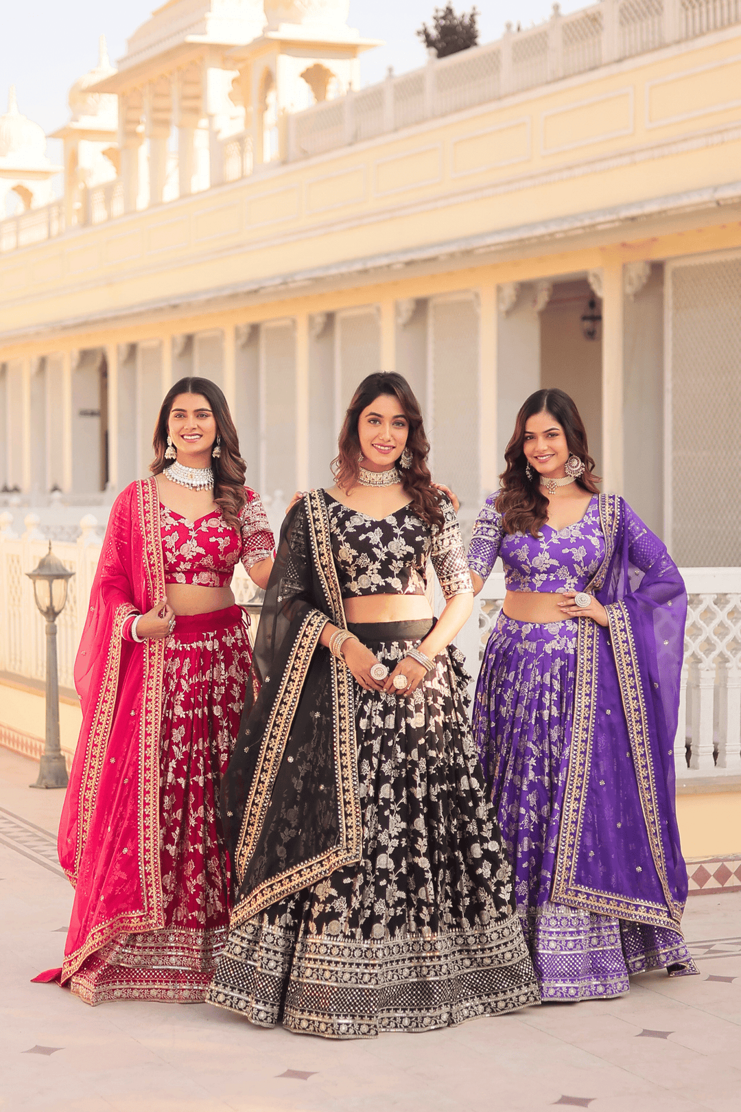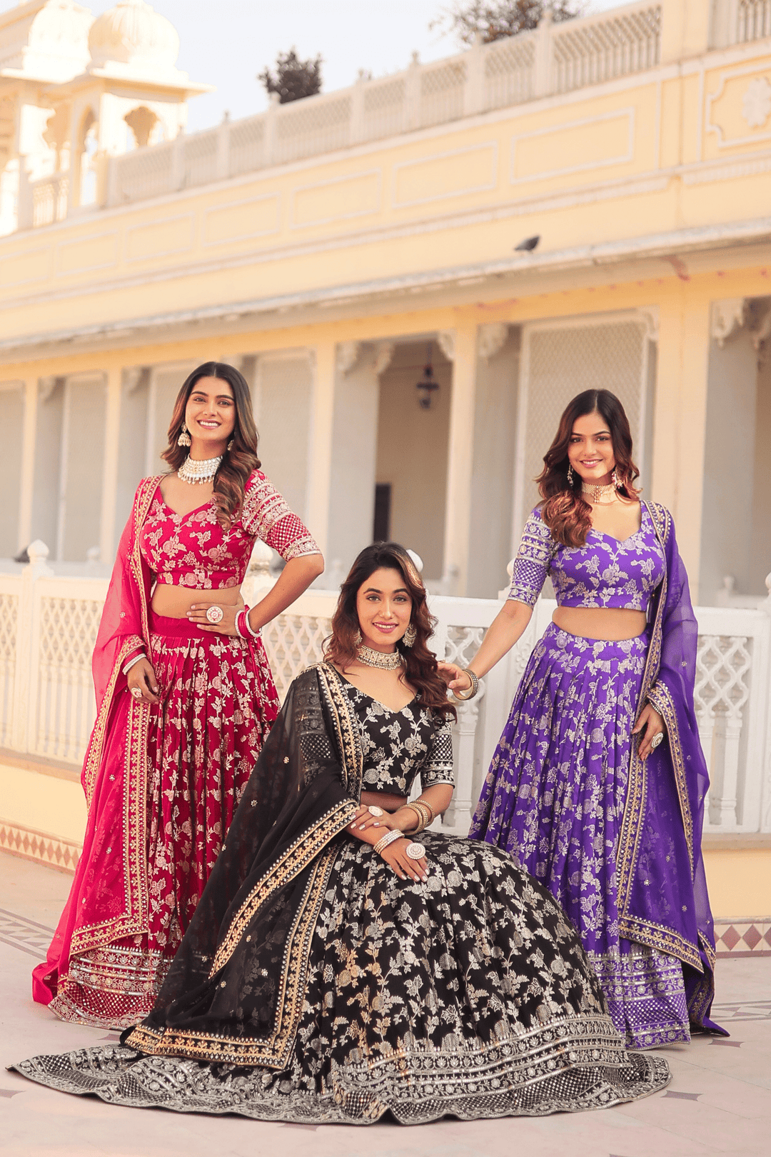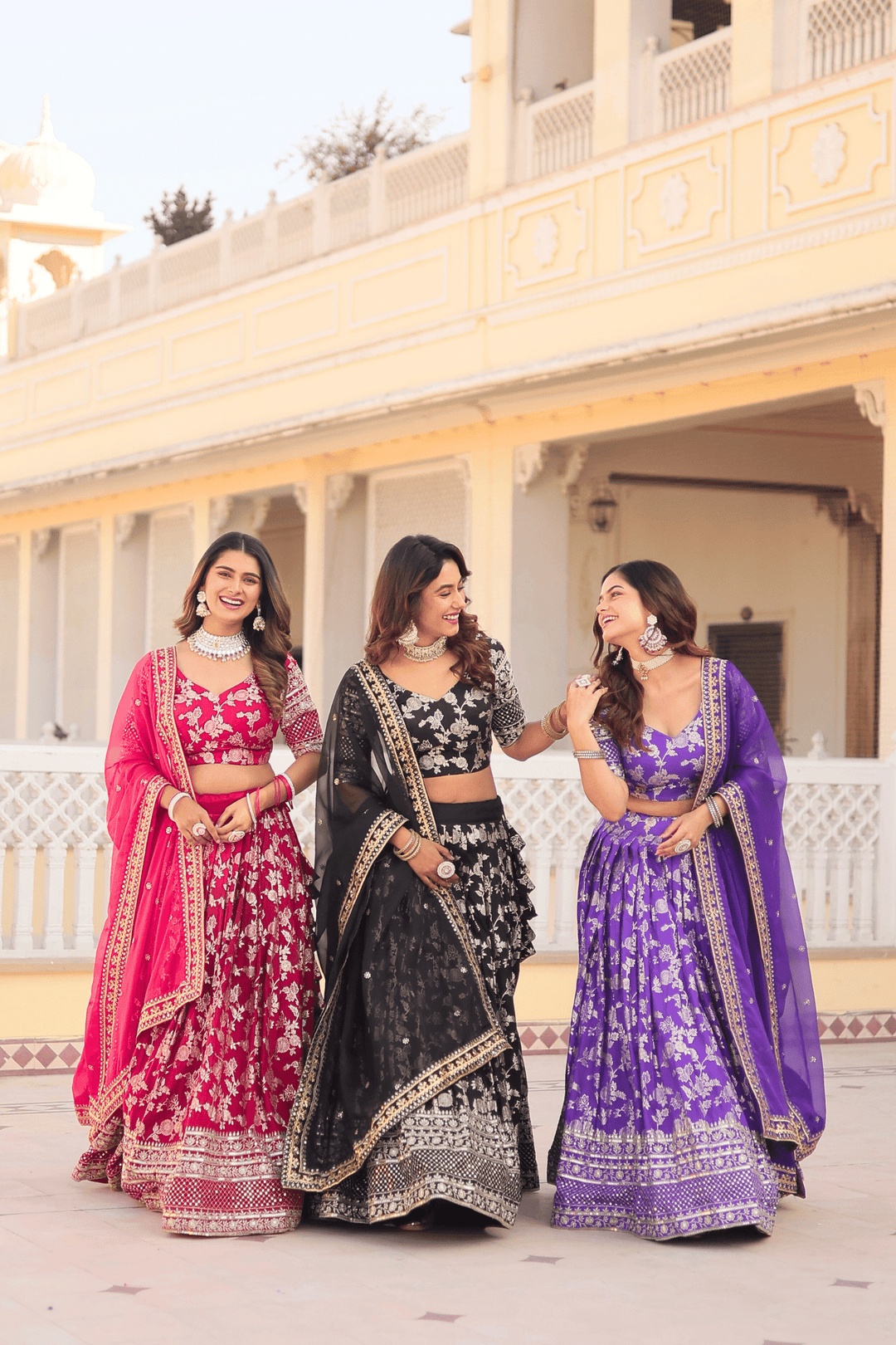 Introducing Glamwiz Jacquard woven Lehenga set, embellished with intricate sequins work. This lehenga is ideal for bridesmaid for wedding ceremonies, crafted in 4 bright colors.