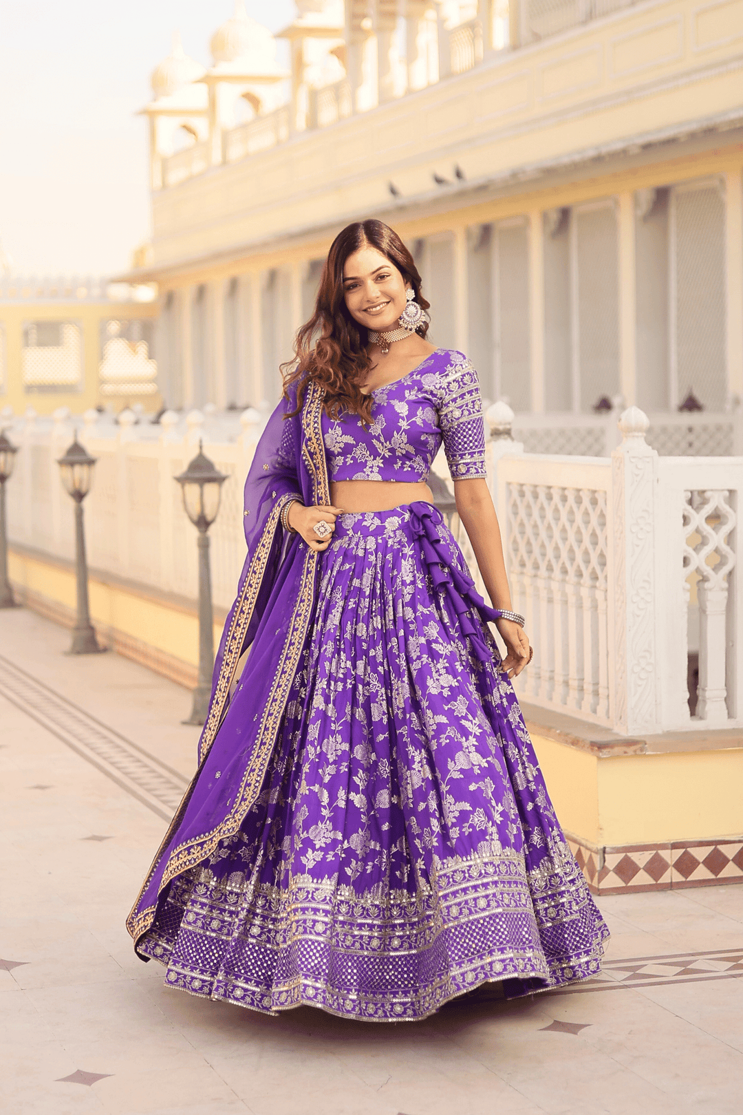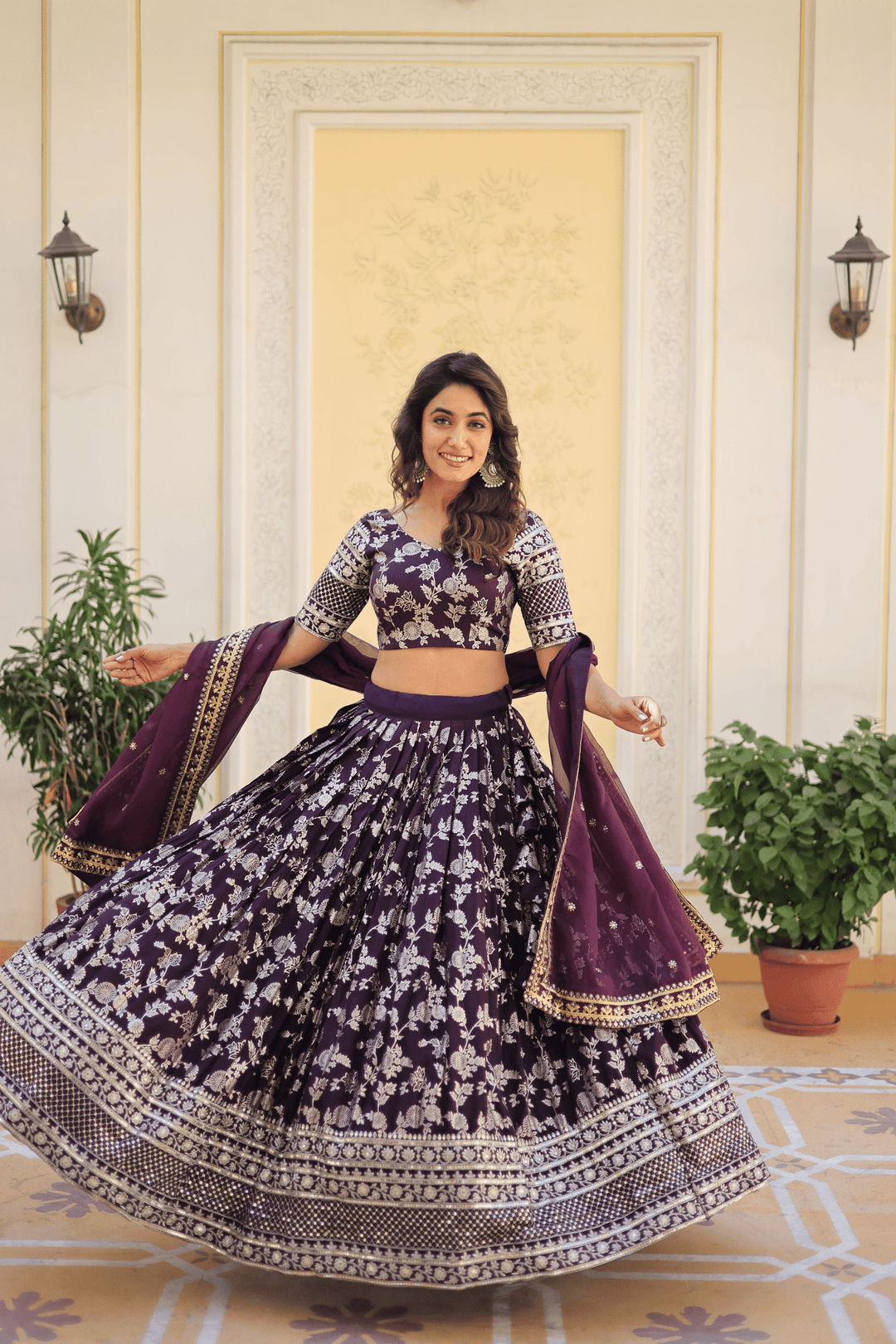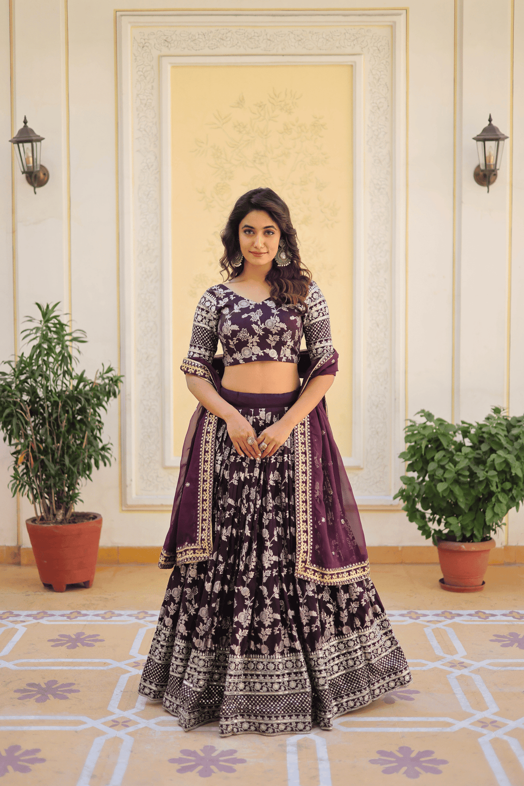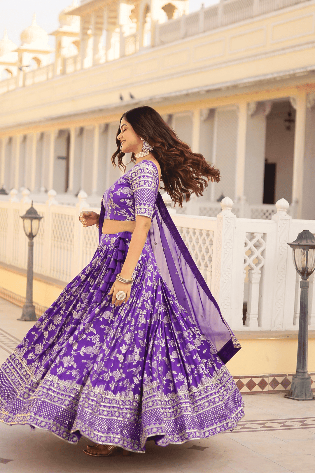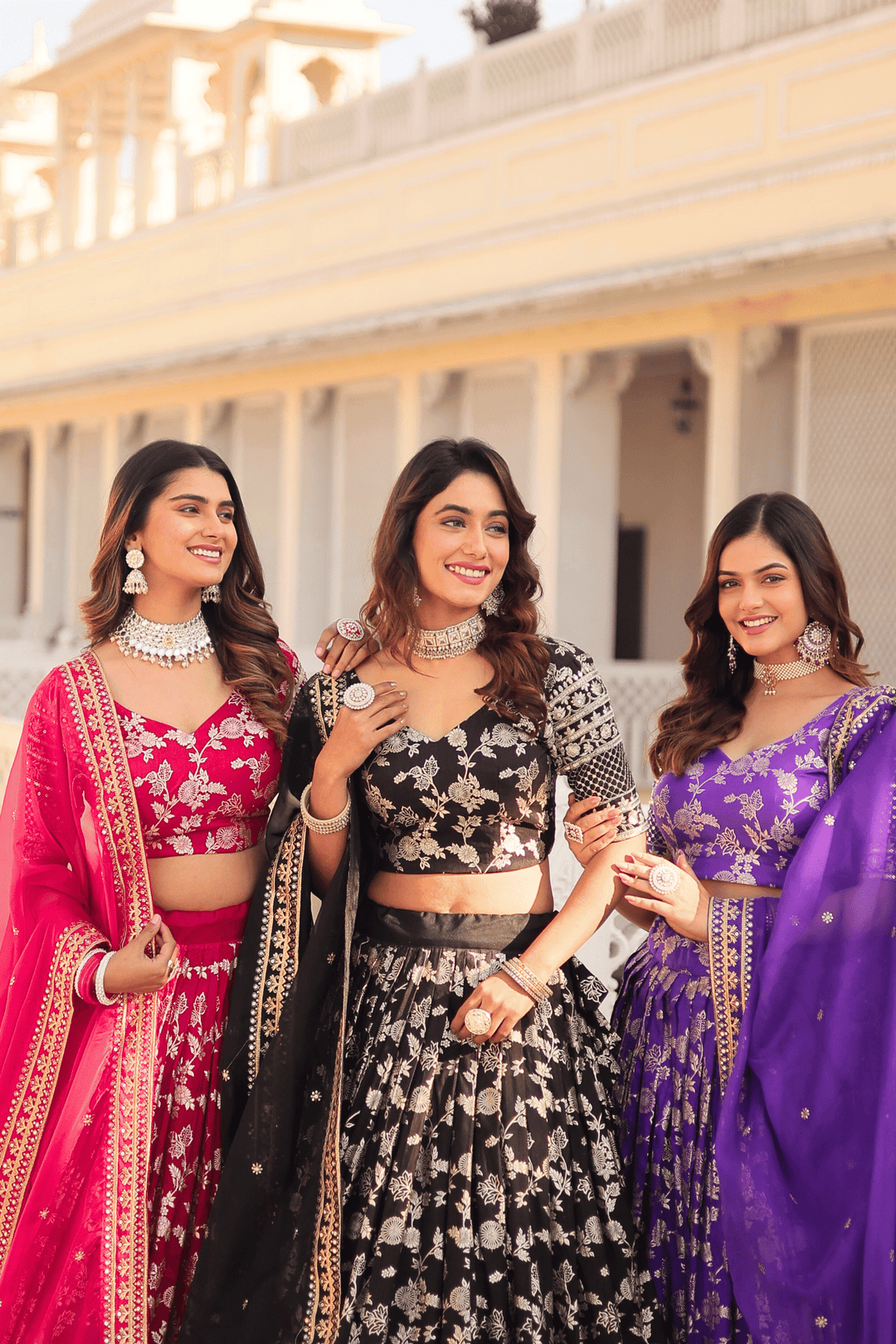 Introducing Glamwiz Jacquard woven Lehenga set, embellished with intricate sequins work. This lehenga is ideal for bridesmaid for wedding ceremonies, crafted in 4 bright colors.