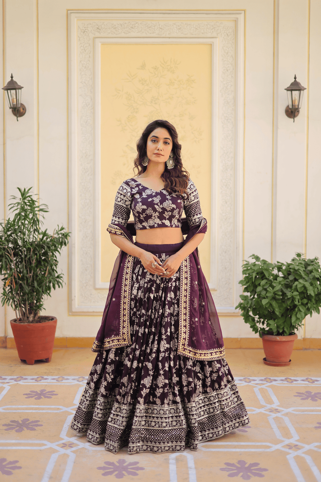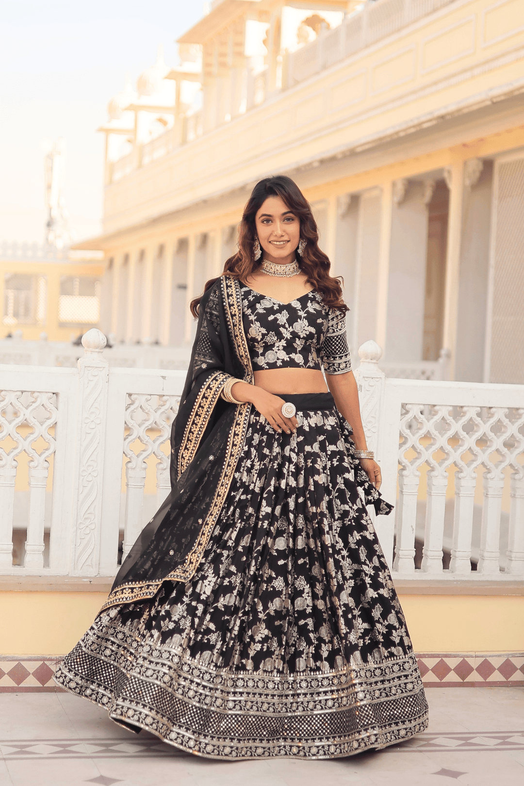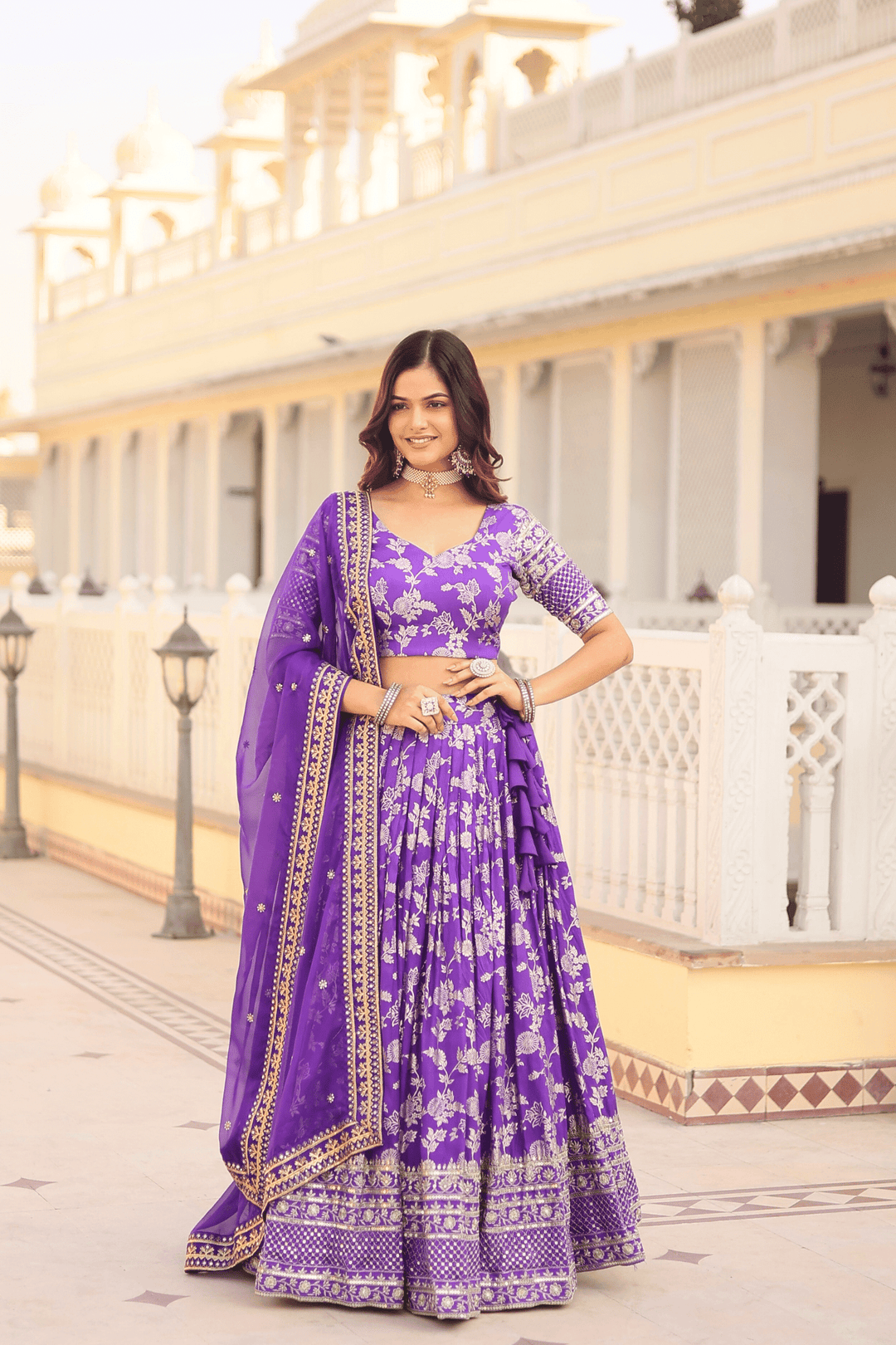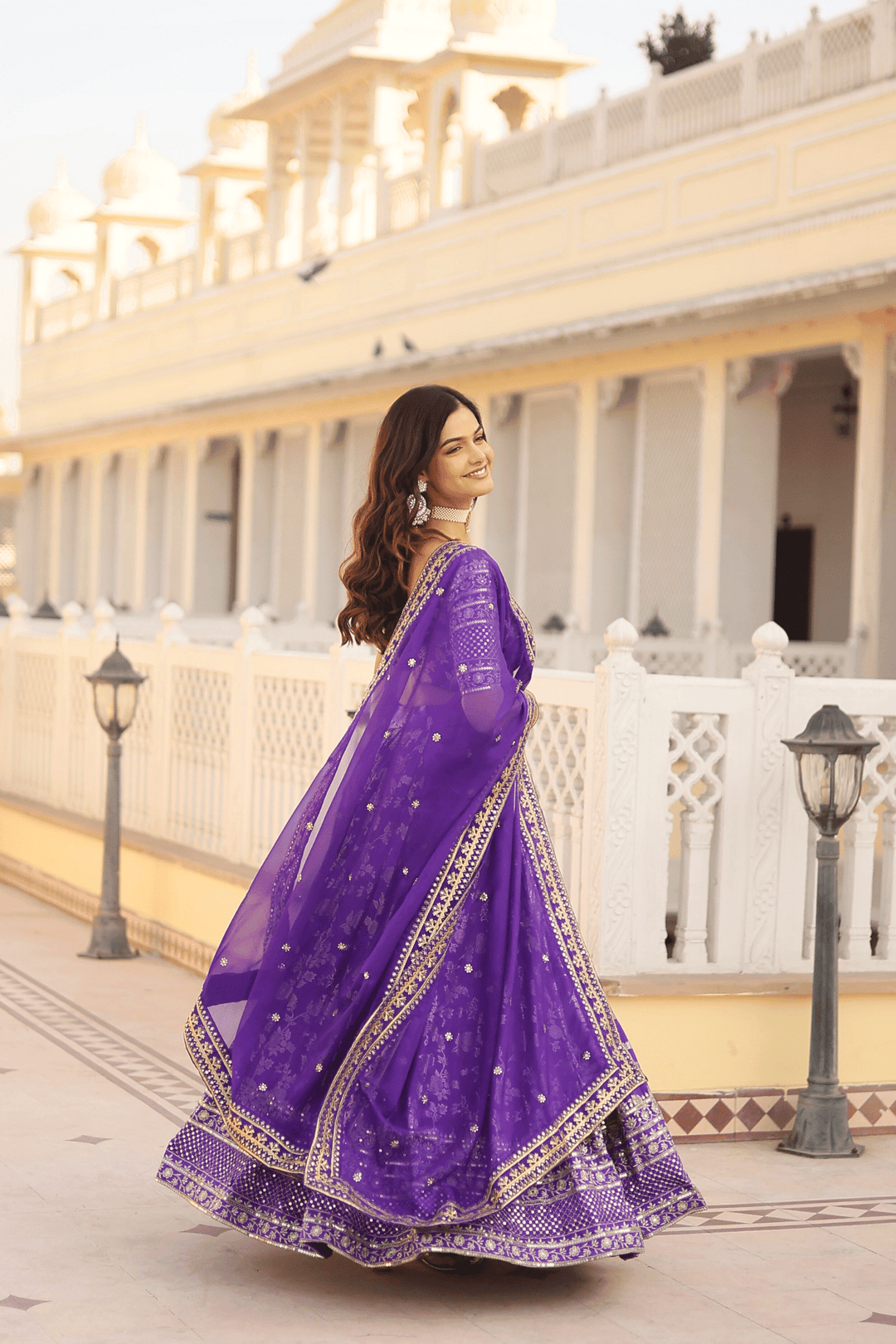 Introducing Glamwiz Jacquard woven Lehenga set, embellished with intricate sequins work. This lehenga is ideal for bridesmaid for wedding ceremonies, crafted in 4 bright colors.
