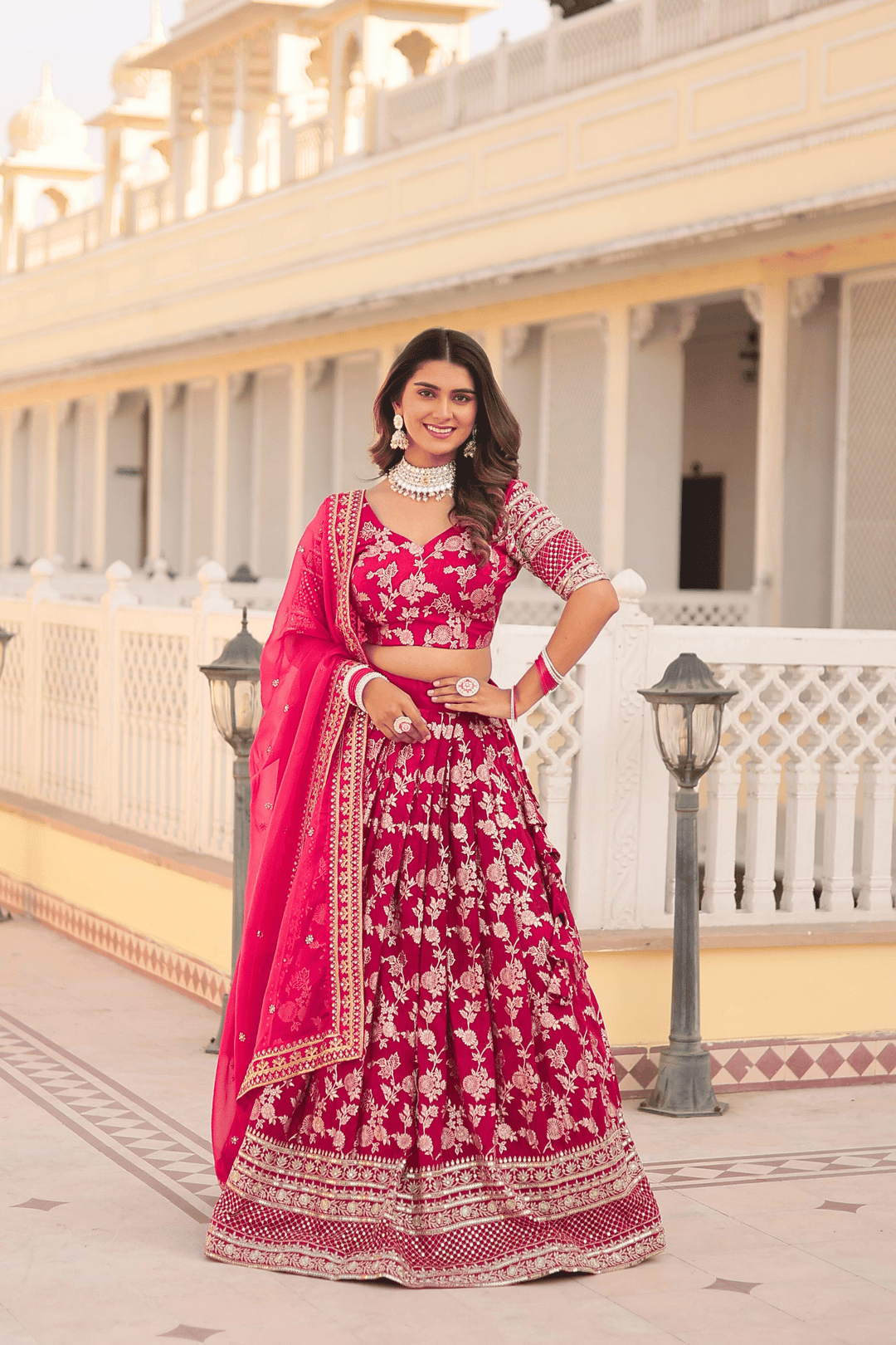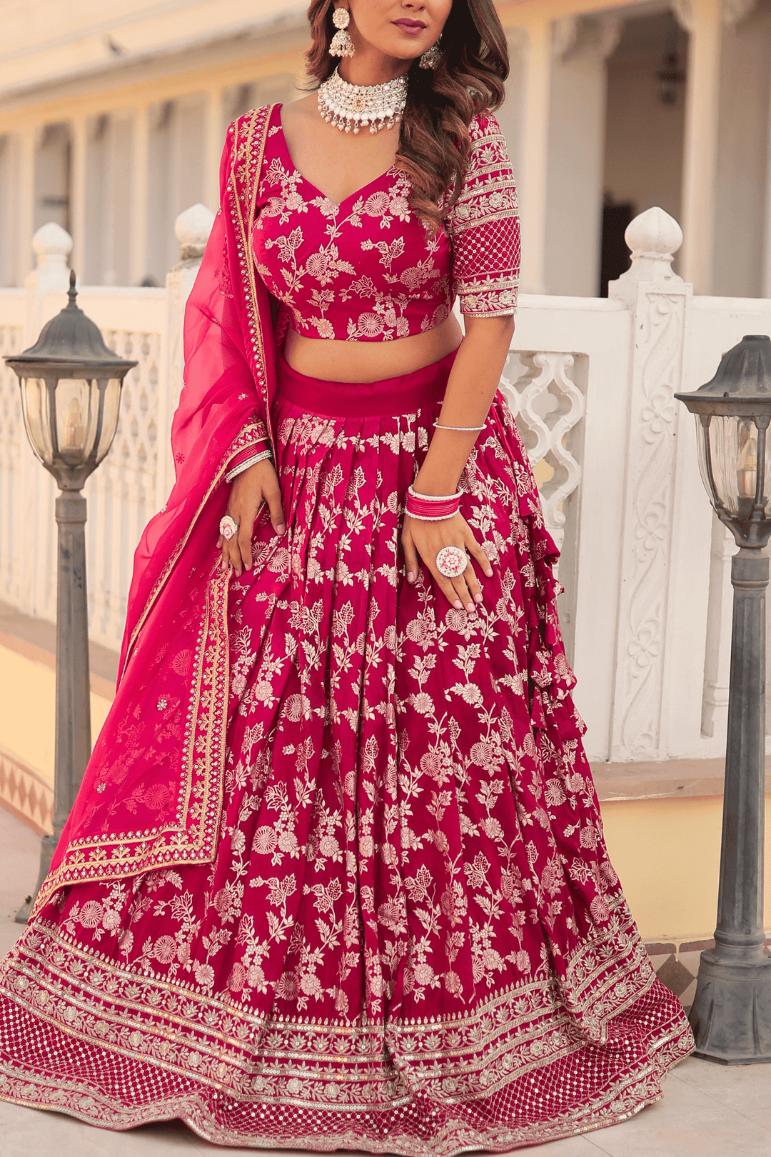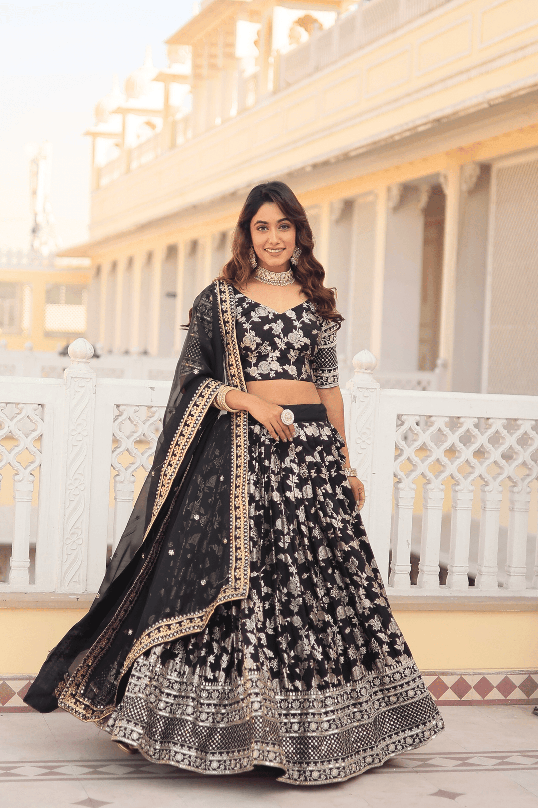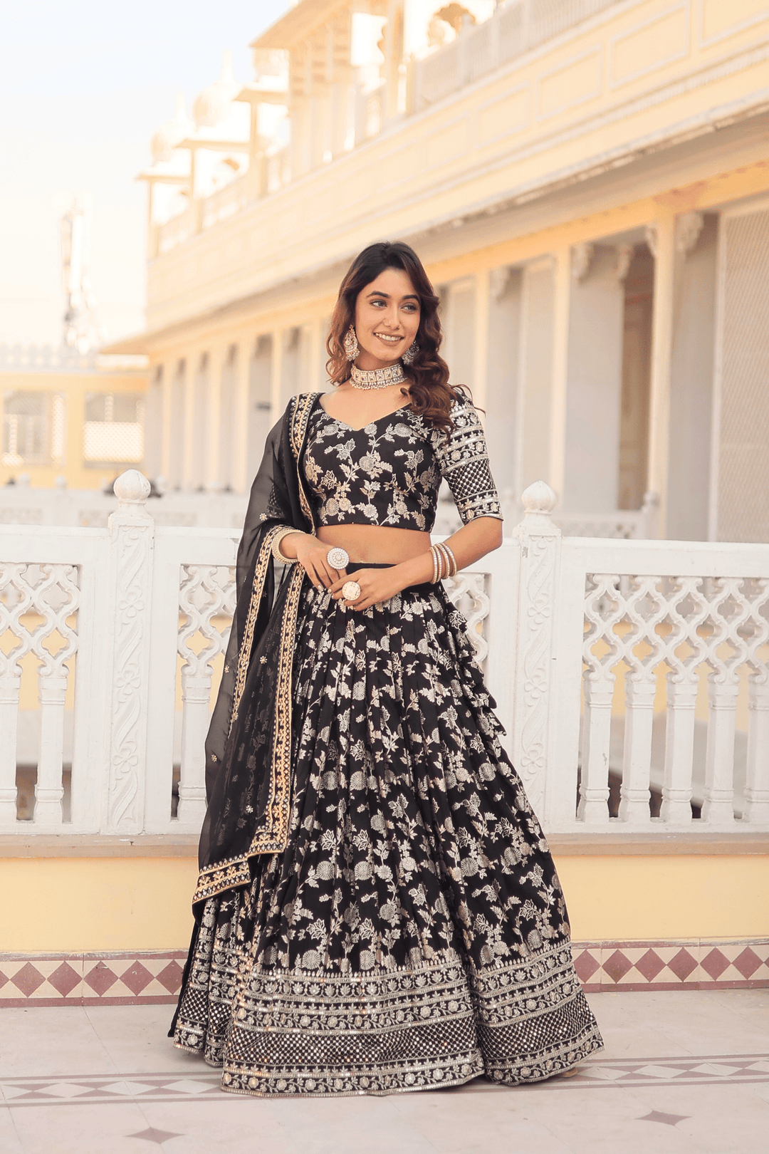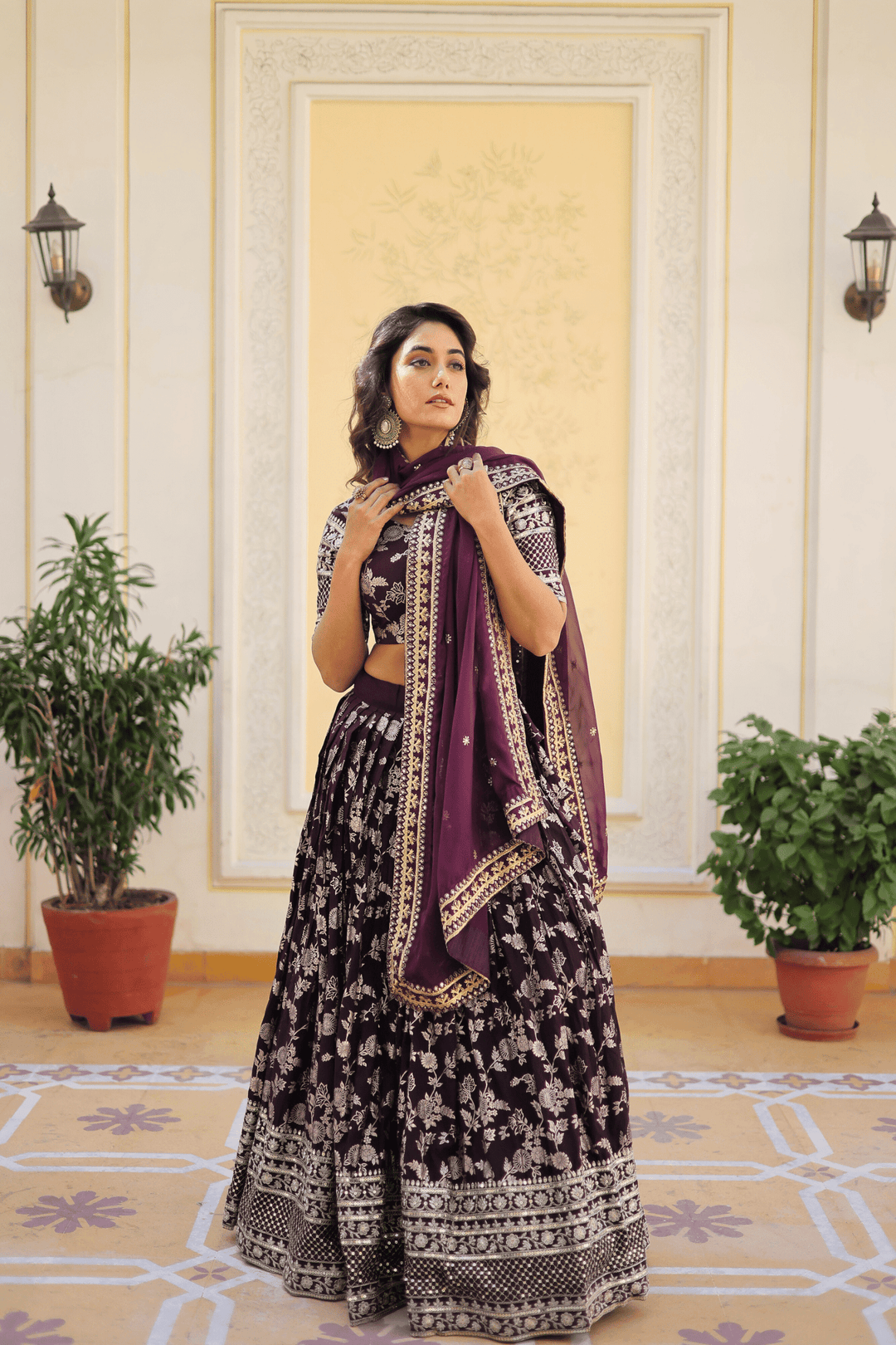 Introducing Glamwiz Jacquard woven Lehenga set, embellished with intricate sequins work. This lehenga is ideal for bridesmaid for wedding ceremonies, crafted in 4 bright colors.