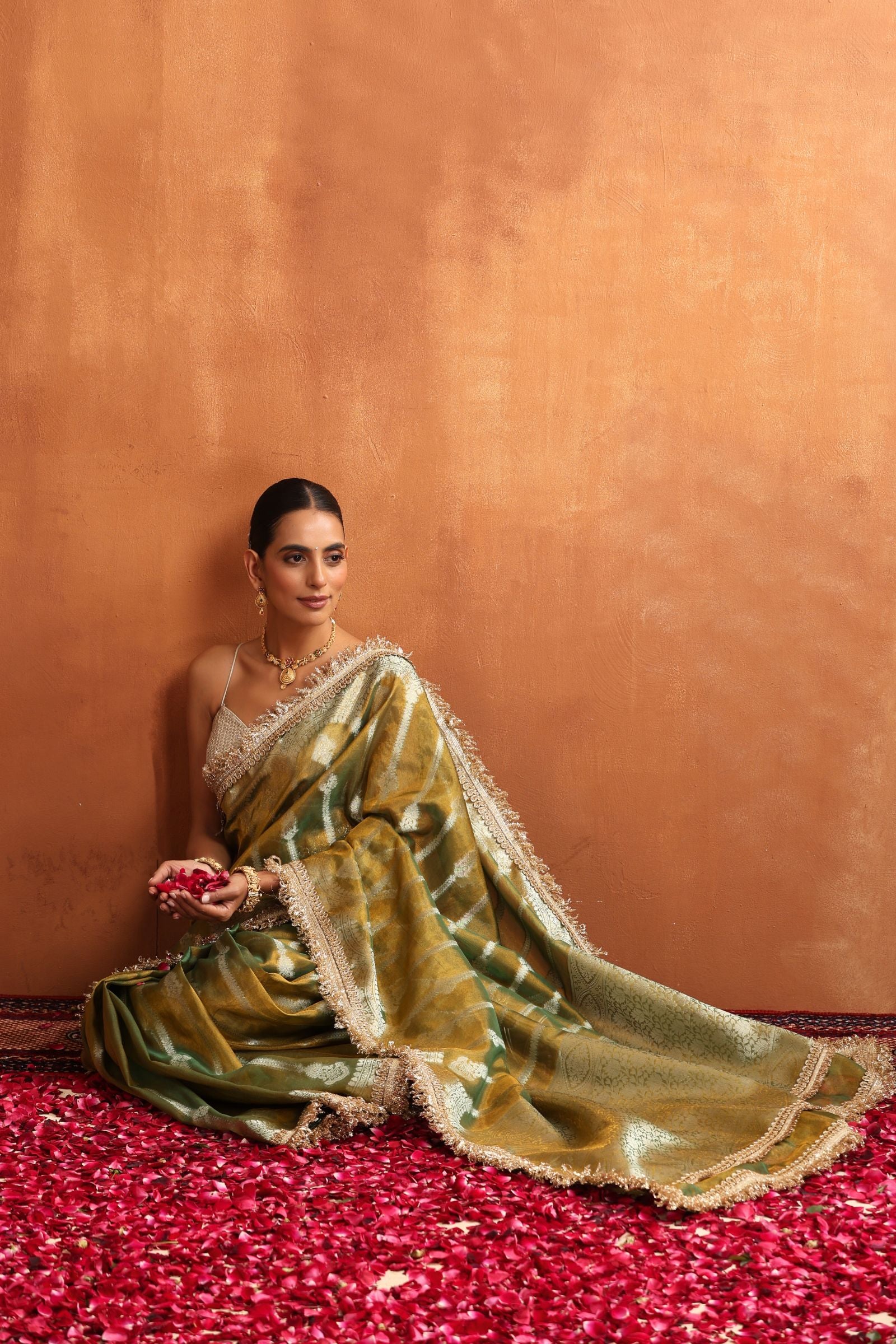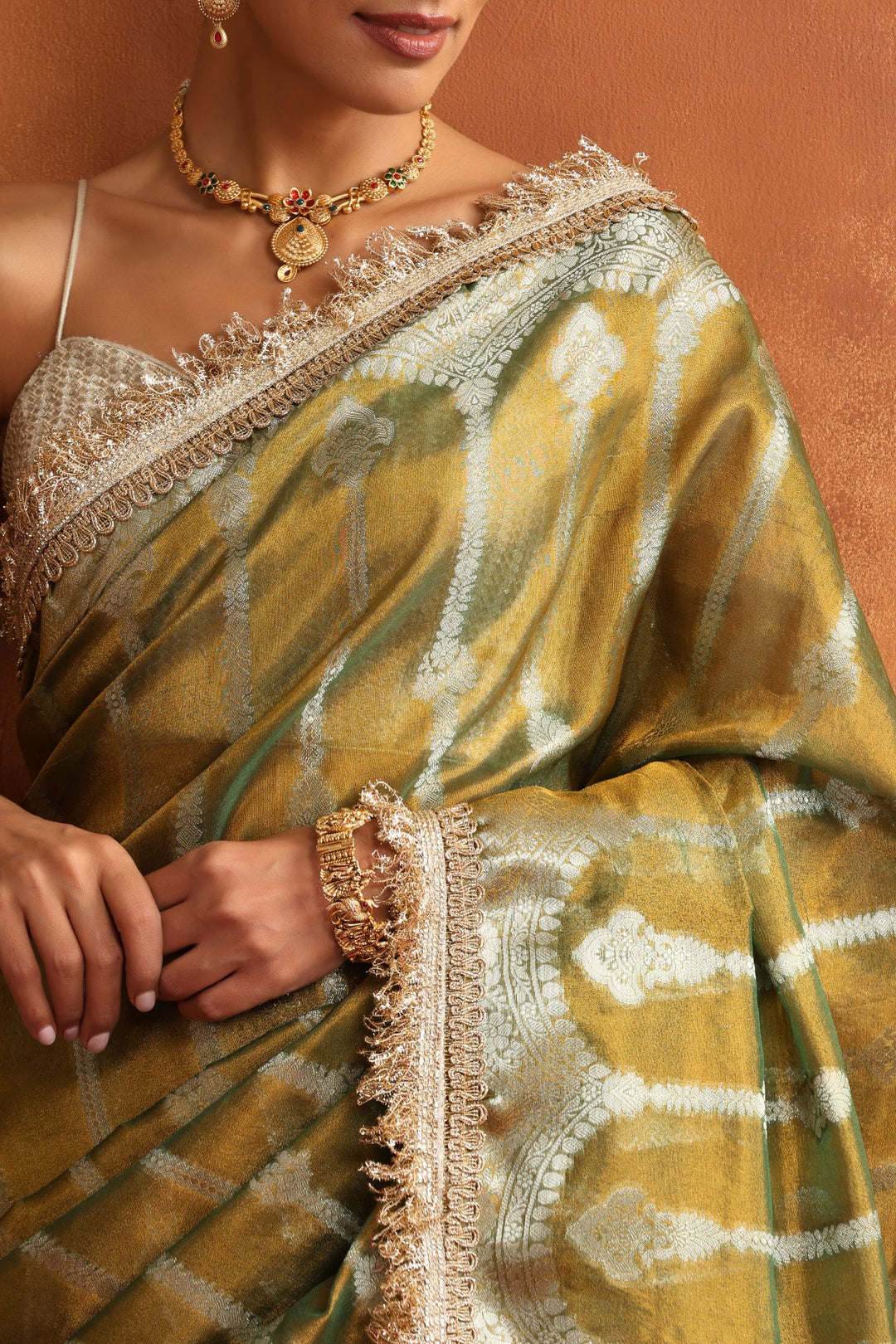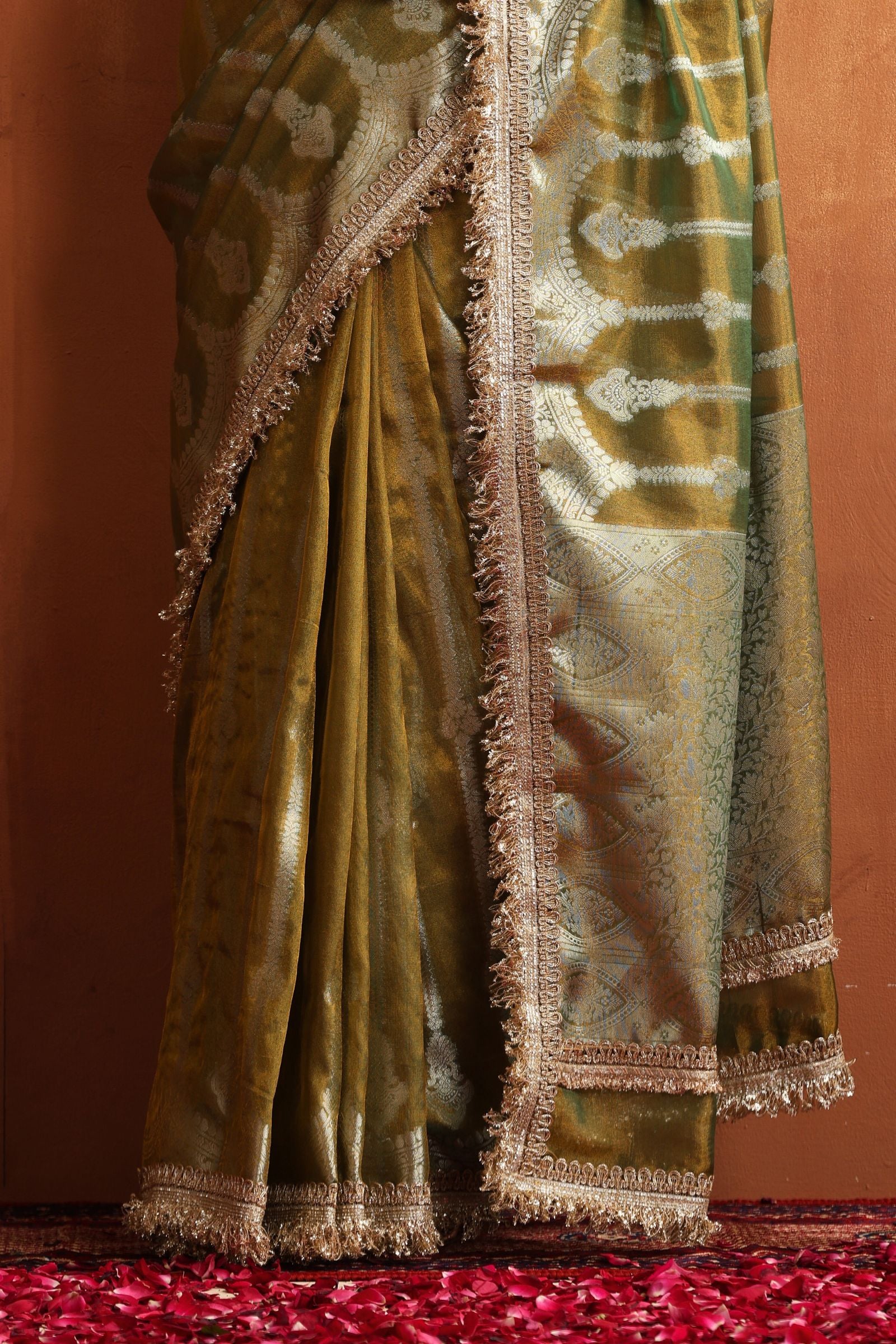 Golden Sage is a serene blend of tradition and sophistication. Crafted in a soft sage–olive Banarasi tissue, this saree carries a gentle golden sheen that glimmers beautifully under natural and evening light. The intricate zari motifs and signature Banarasi borders add royal charm without overwhelming the subtle elegance of the fabric.