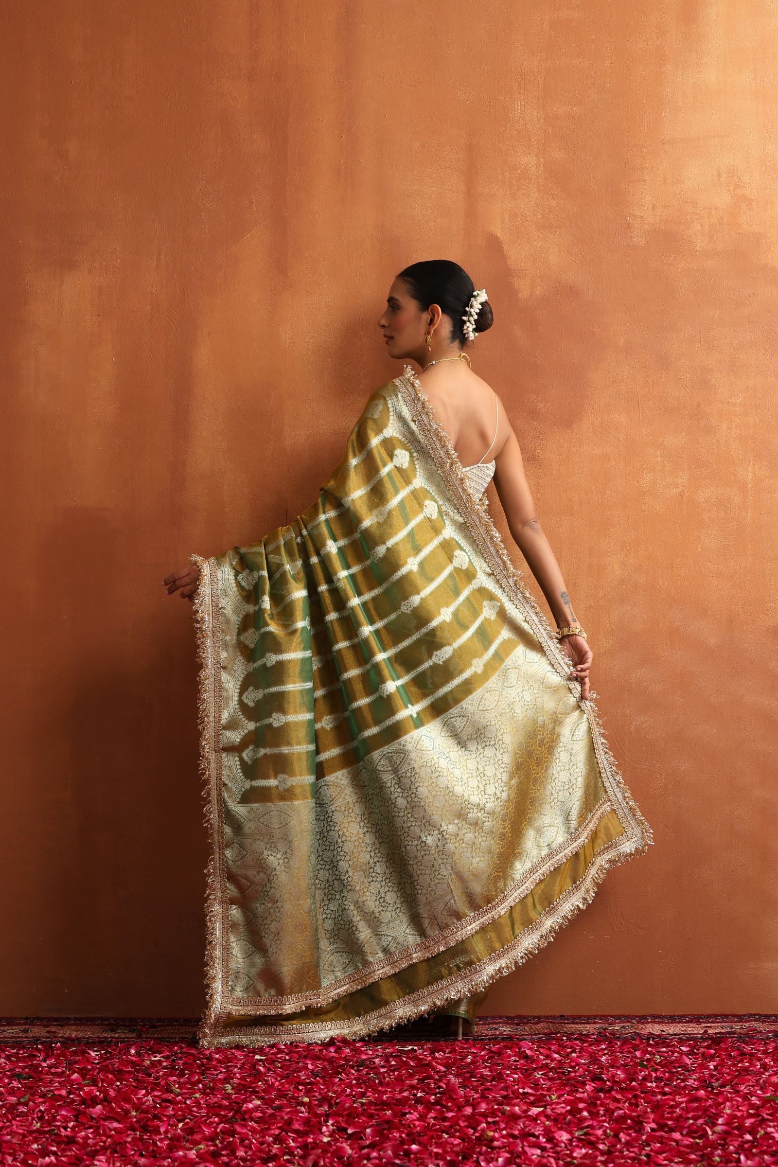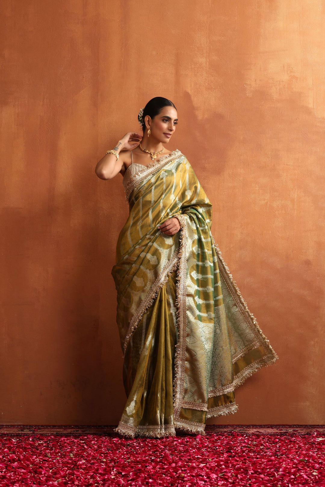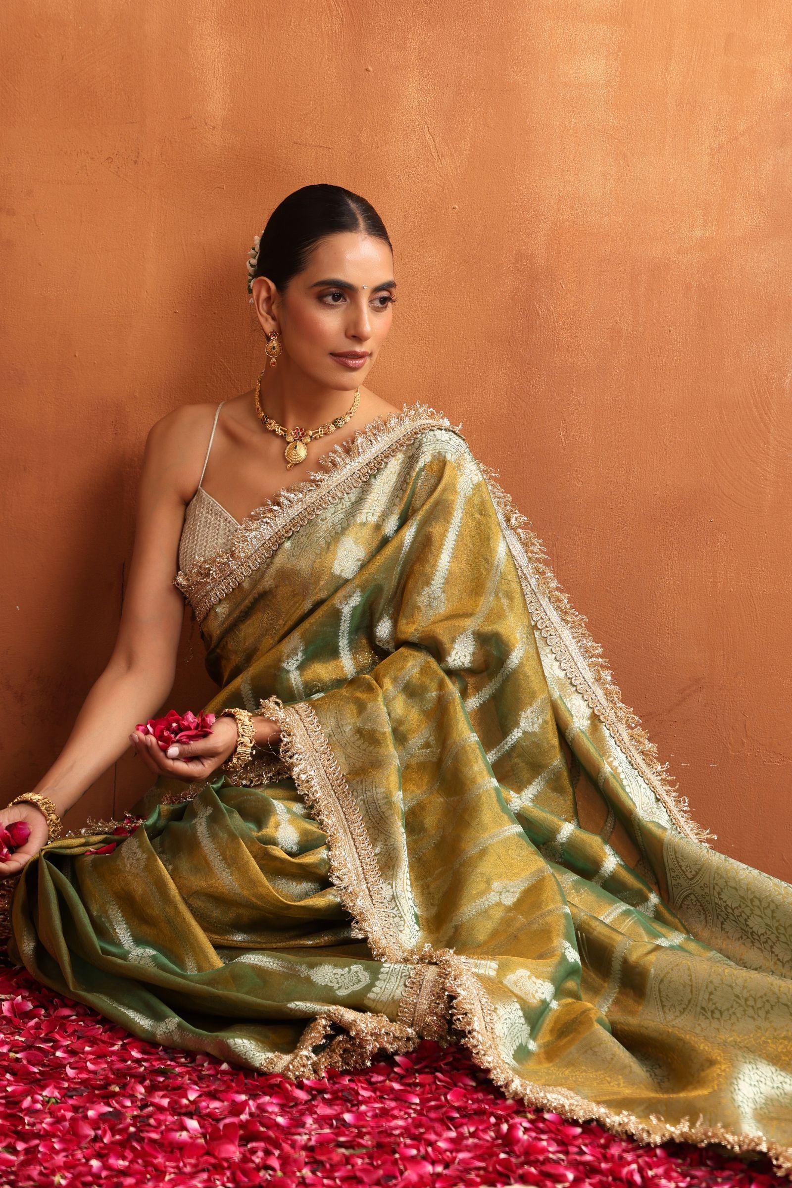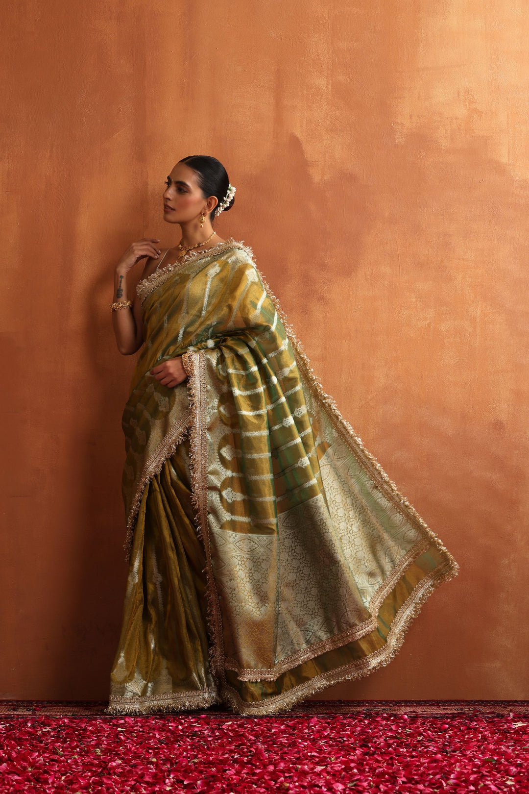 Golden Sage is a serene blend of tradition and sophistication. Crafted in a soft sage–olive Banarasi tissue, this saree carries a gentle golden sheen that glimmers beautifully under natural and evening light. The intricate zari motifs and signature Banarasi borders add royal charm without overwhelming the subtle elegance of the fabric.