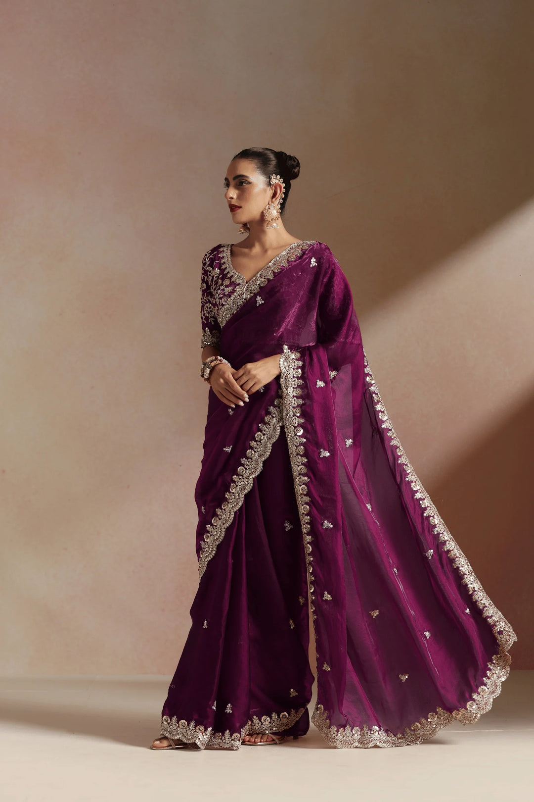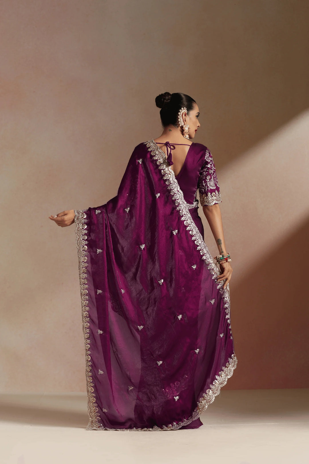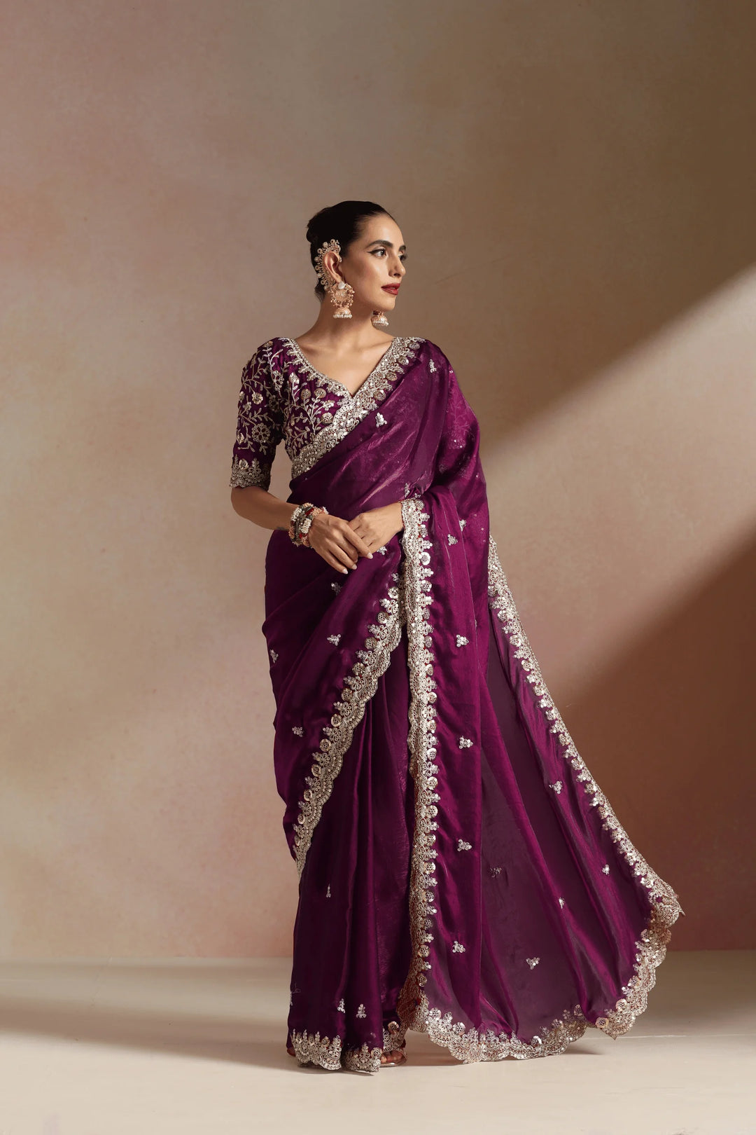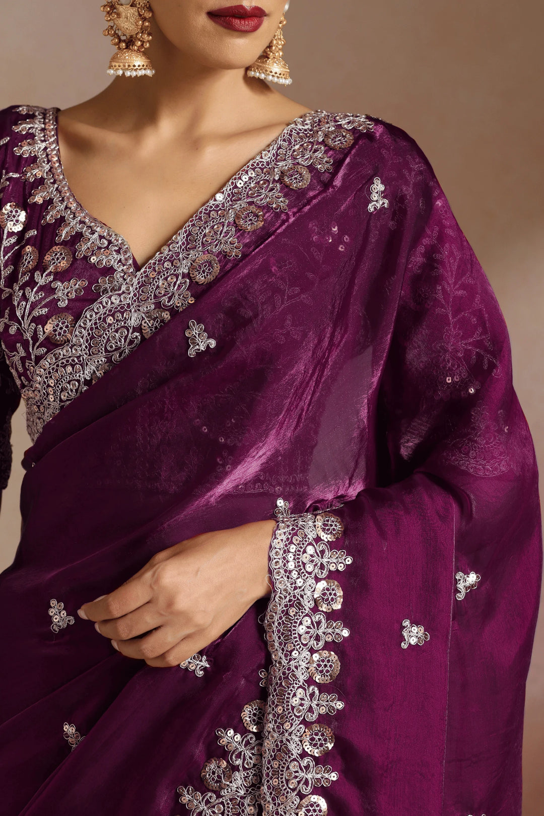 Fall in love with power dressing through Imperial Garnet, a Purple ready to wear saree that blends sultry elegance with bold femininity. Rich in color and adorned with delicate embellishments along the border, this saree is designed for the woman who commands attention with effortless grace.