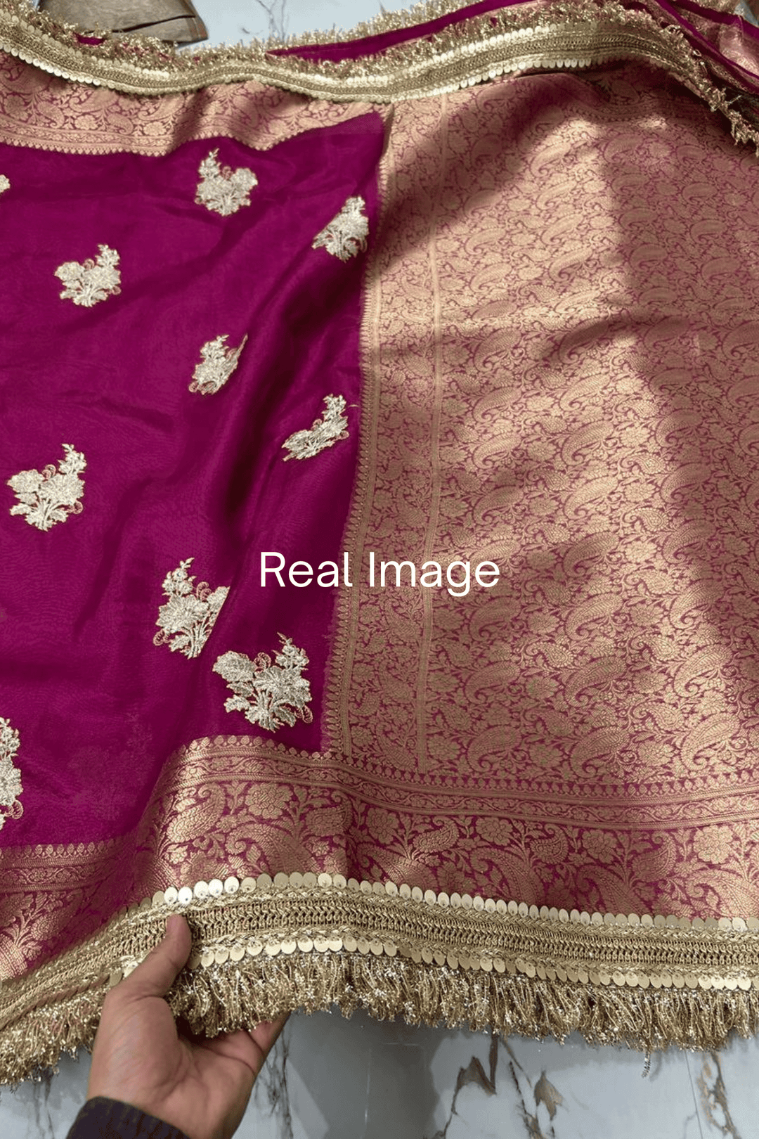 This Tissue Banarasi saree comes with stitched pleats, and is adjustable upto 5 XL.