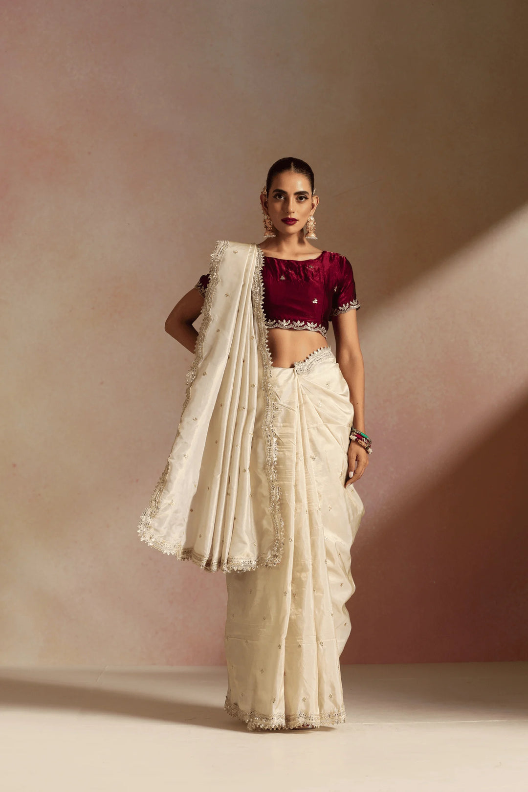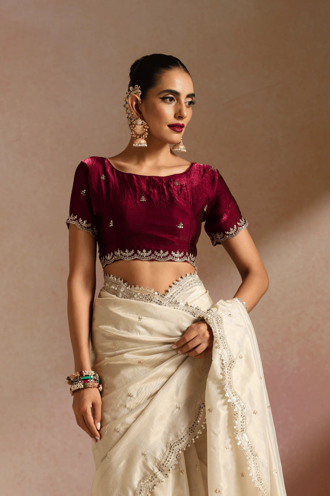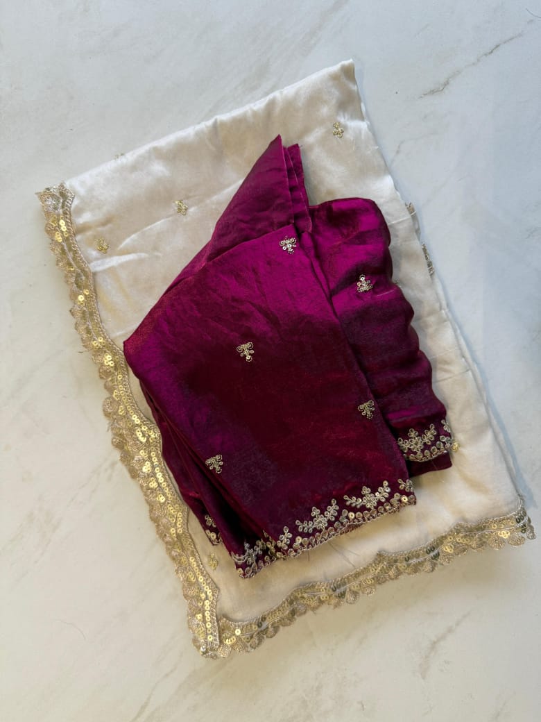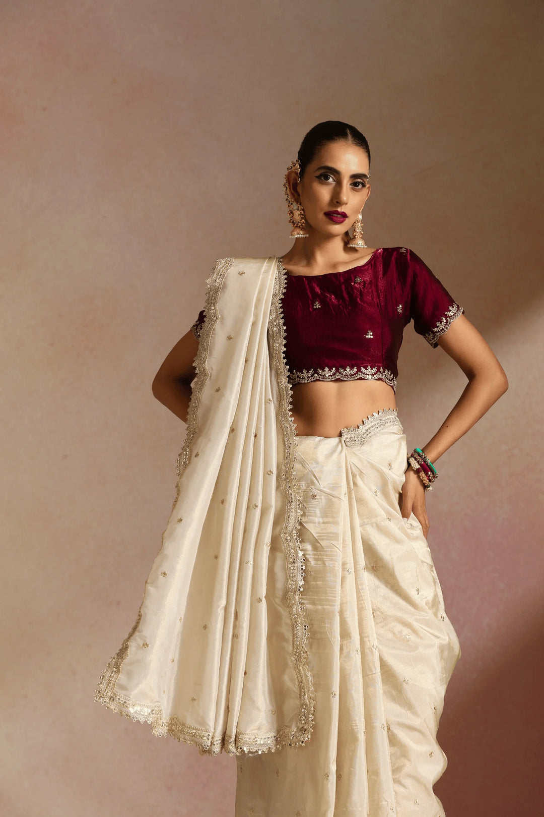 Step into understated power with Ivory Rebel. This ready to wear organza saree redefines elegance in a crisp white canvas, elevated with delicate embellishments along the border. Paired with a rich maroon stitched blouse, it strikes the perfect balance between timeless grace and unapologetic boldness.