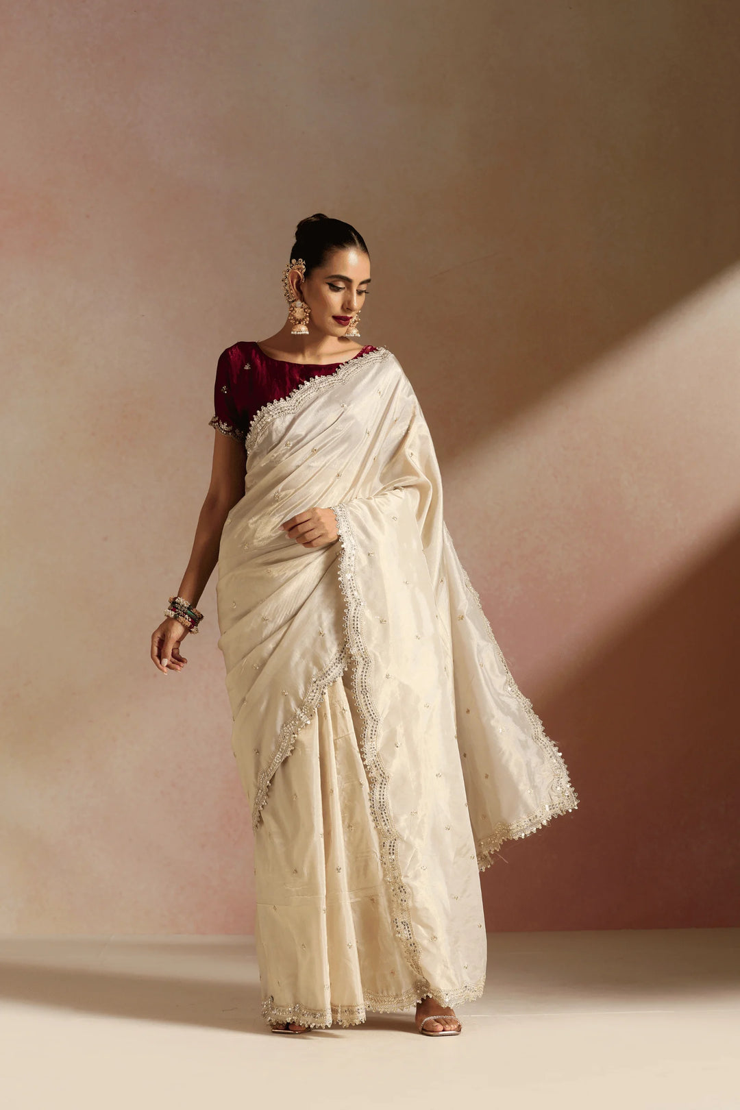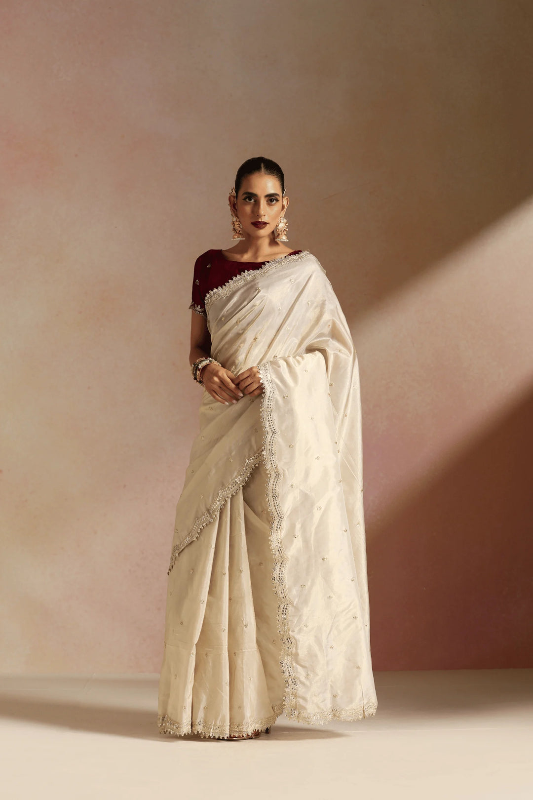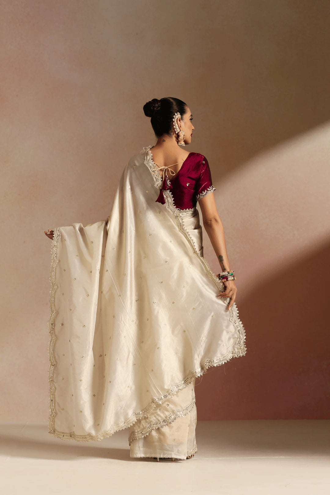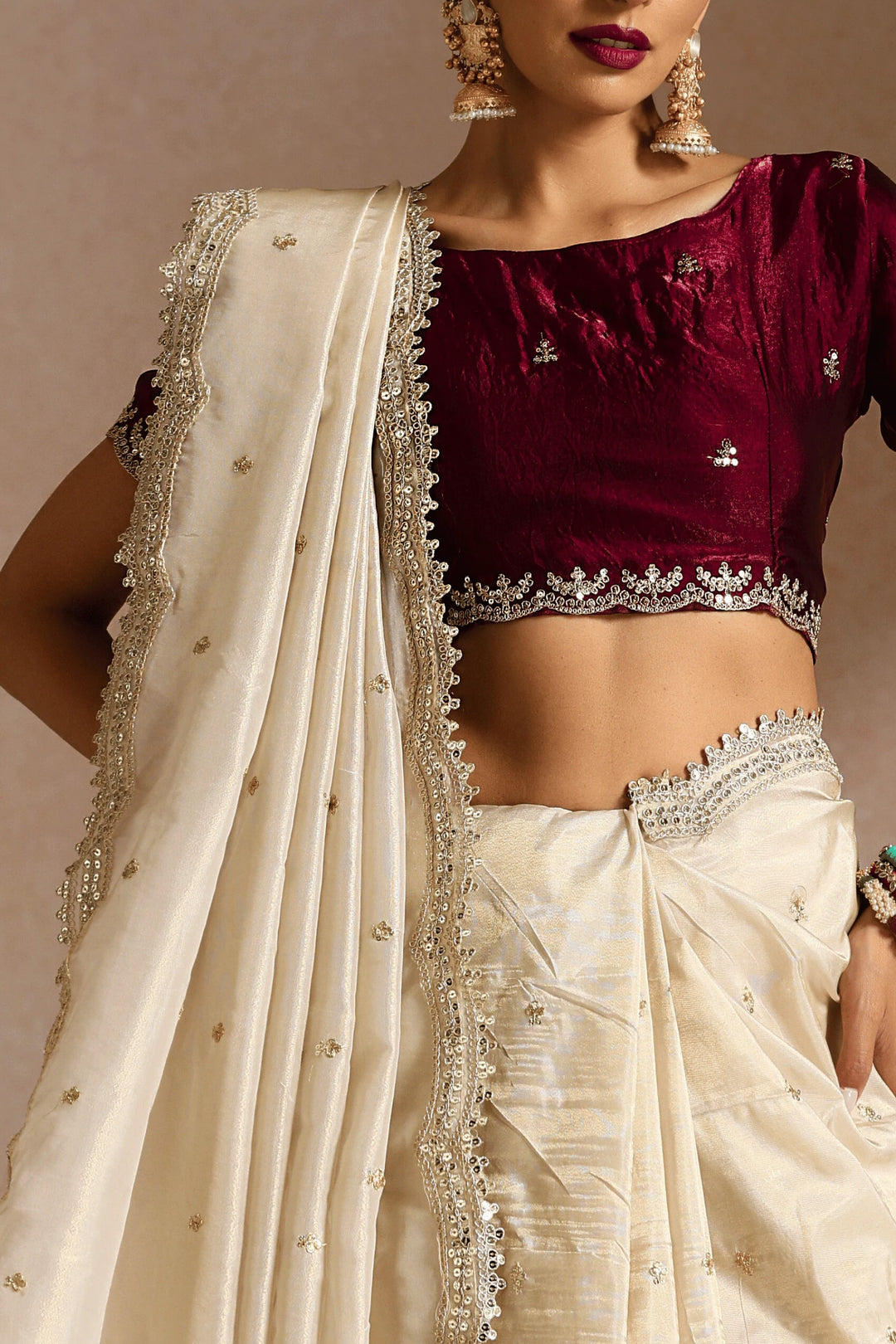 Step into understated power with Ivory Rebel. This ready to wear organza saree redefines elegance in a crisp white canvas, elevated with delicate embellishments along the border. Paired with a rich maroon stitched blouse, it strikes the perfect balance between timeless grace and unapologetic boldness.