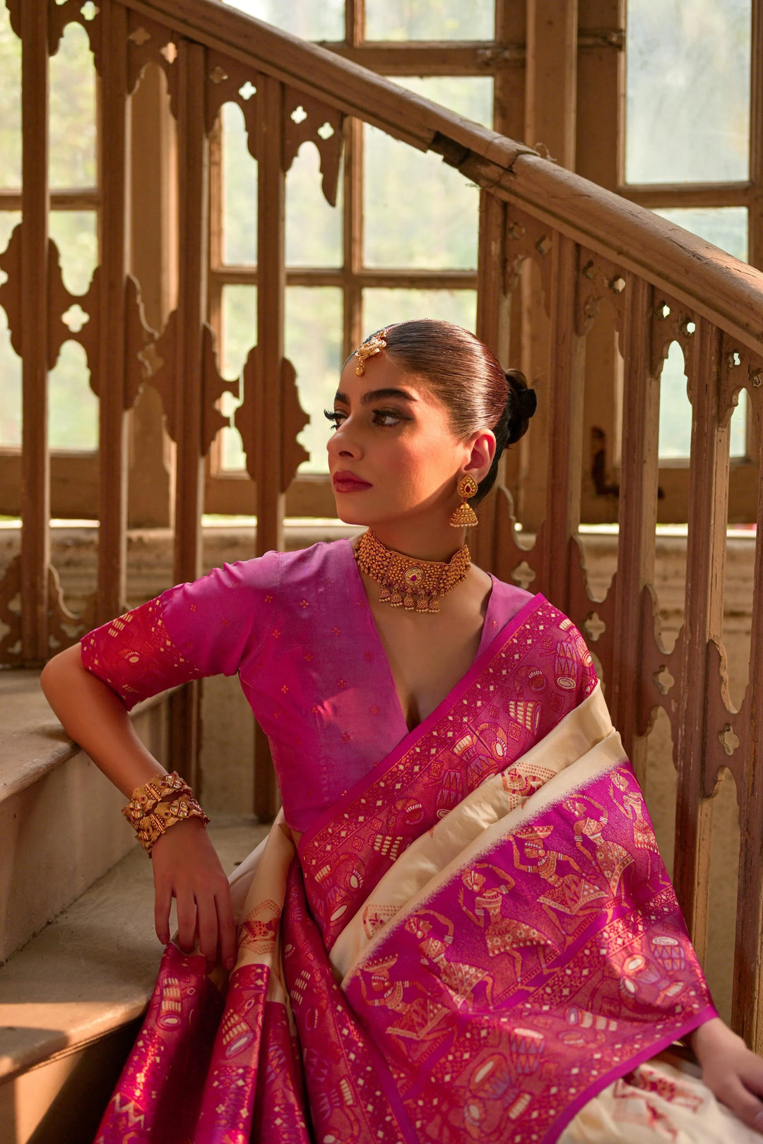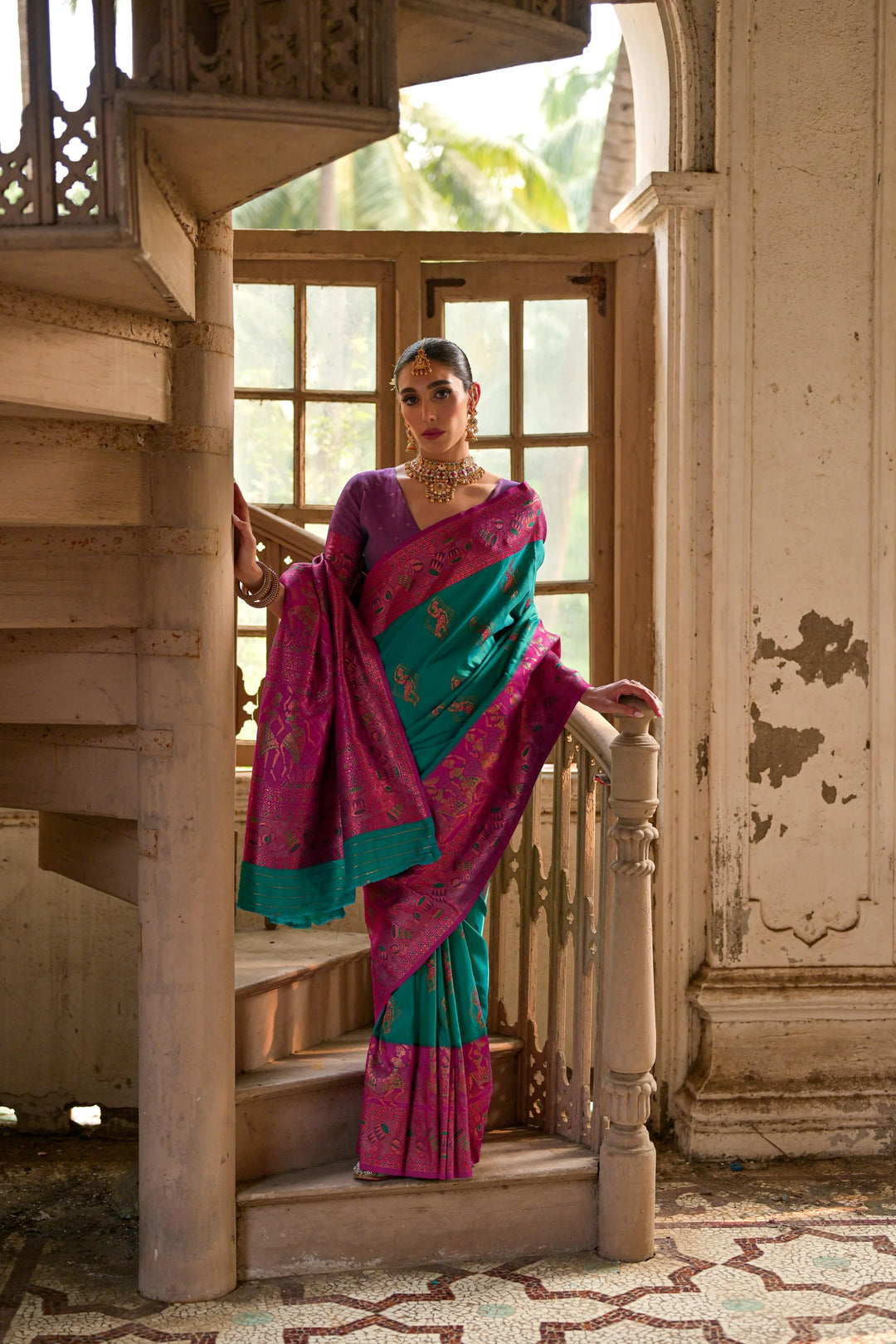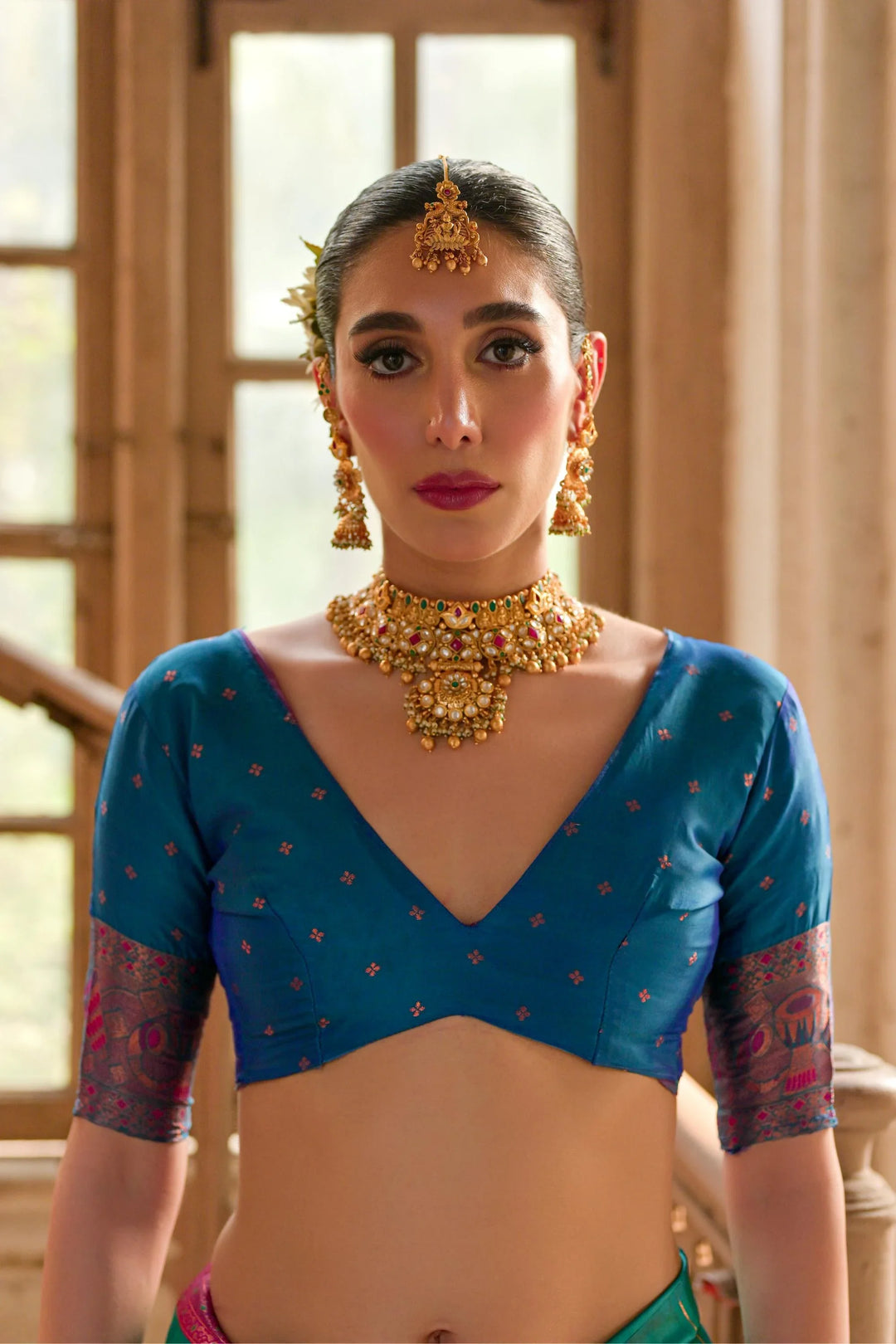 Drape yourself in the elegance of a Karigari Royale— a pre-stitched Banarasi saree with brocade blouse kissed with golden zari. This saree is a perfect blend of traditional craftsmanship and modern ease, designed for the woman who owns every room she walks into.