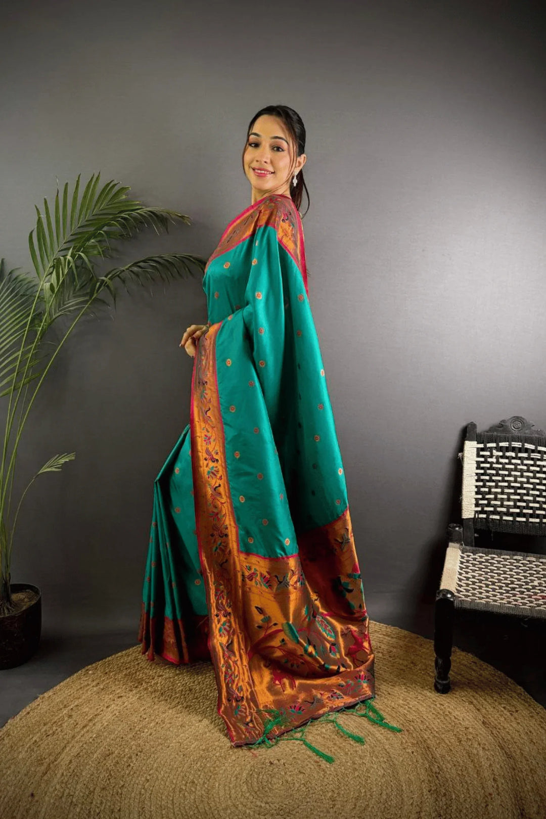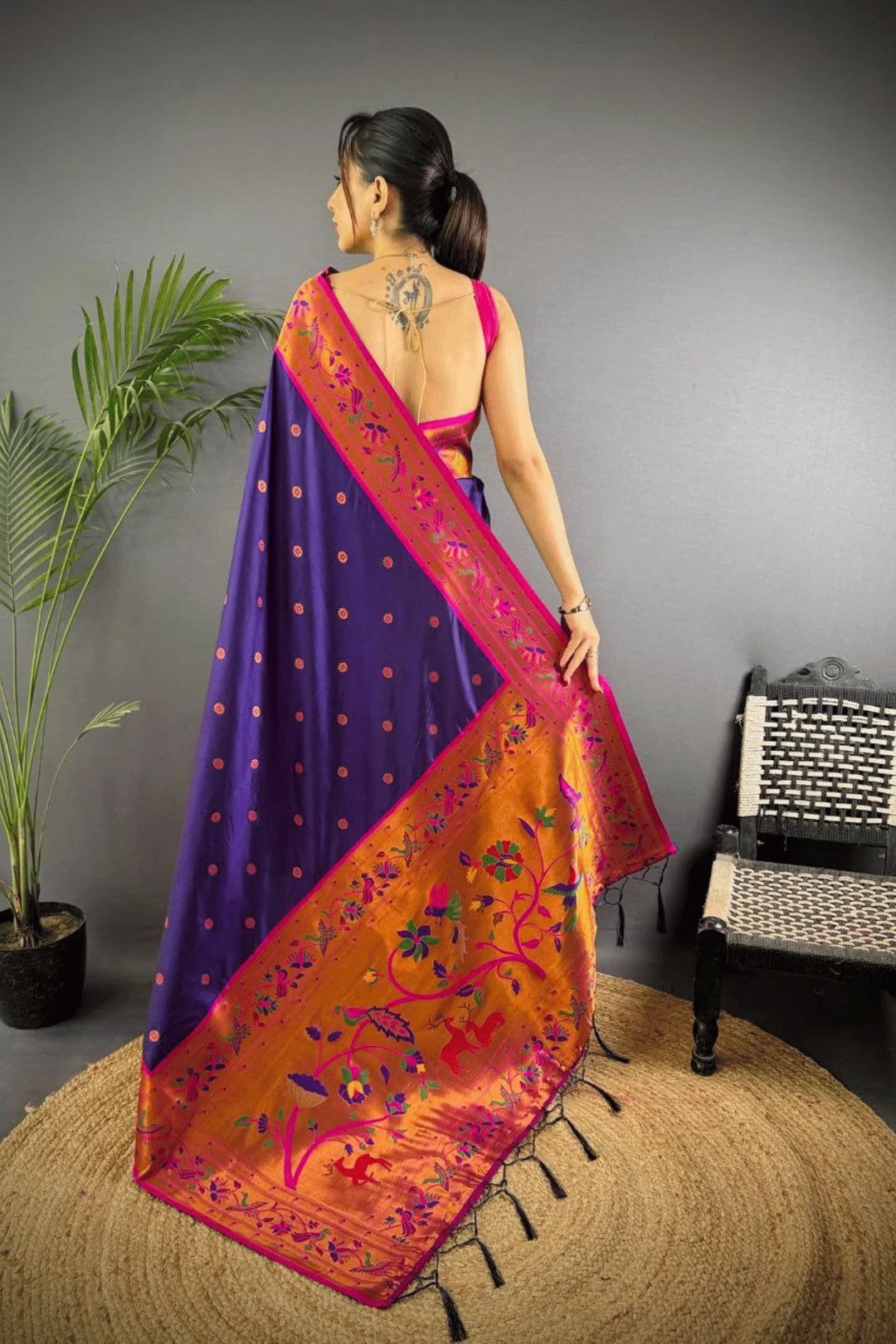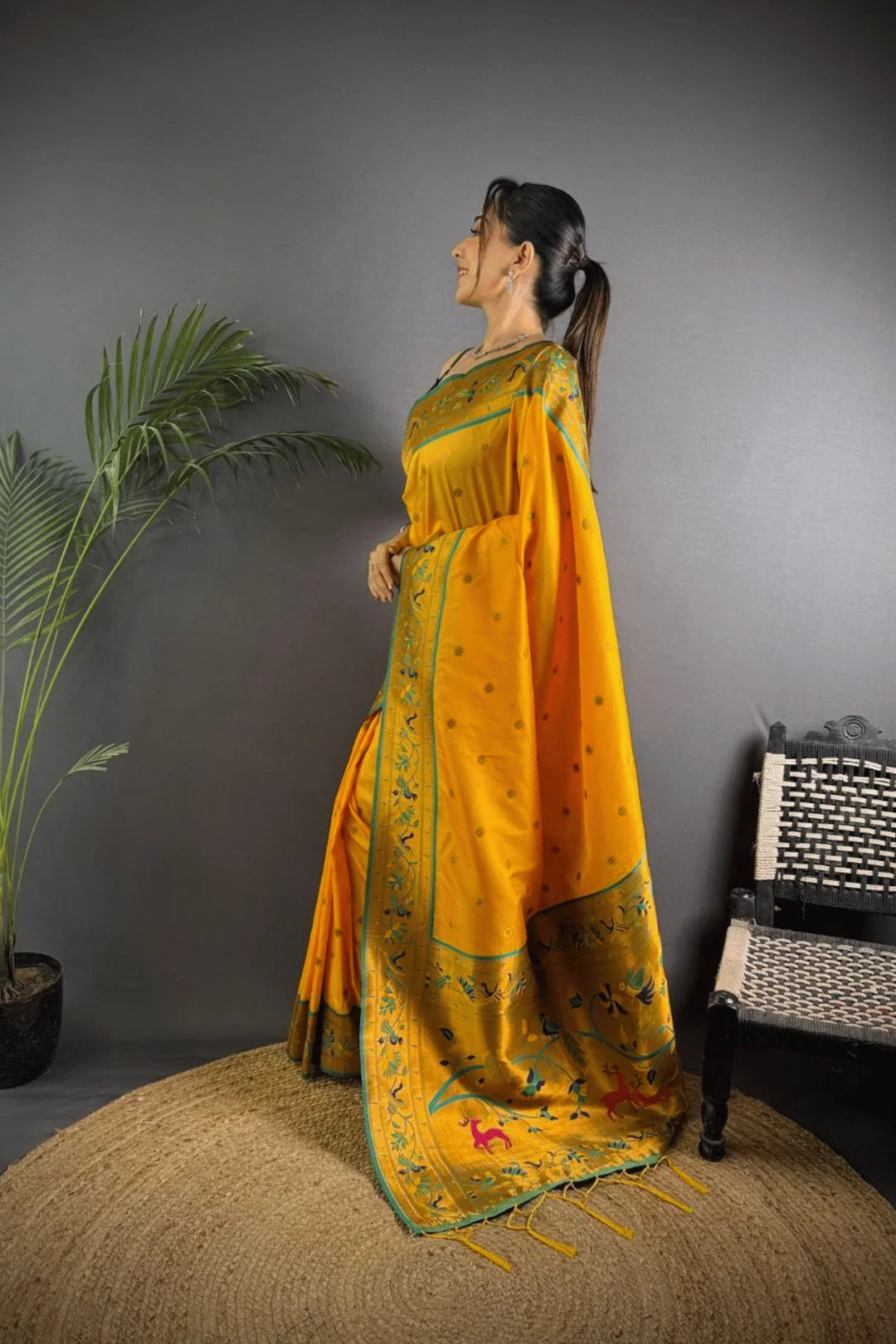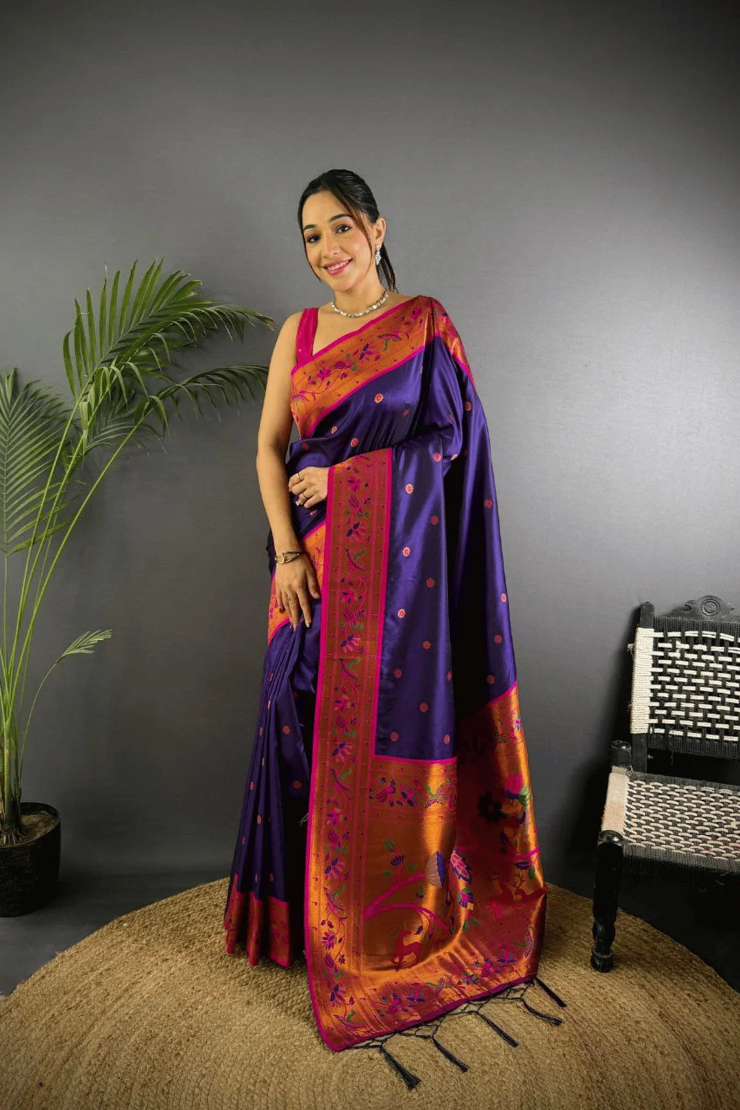 Drape yourself in the elegance of a Kashi Paithan— a pre-stitched paithani saree with Banarasi weaving. This saree is a perfect blend of traditional craftsmanship and modern ease, designed for the woman who owns every room she walks into.