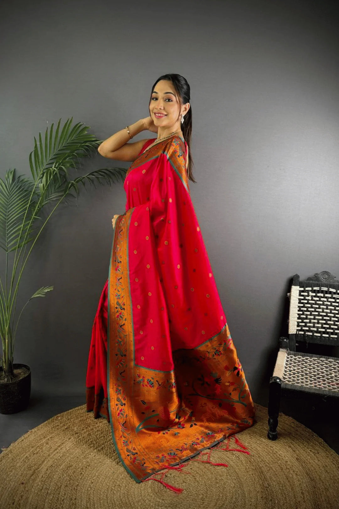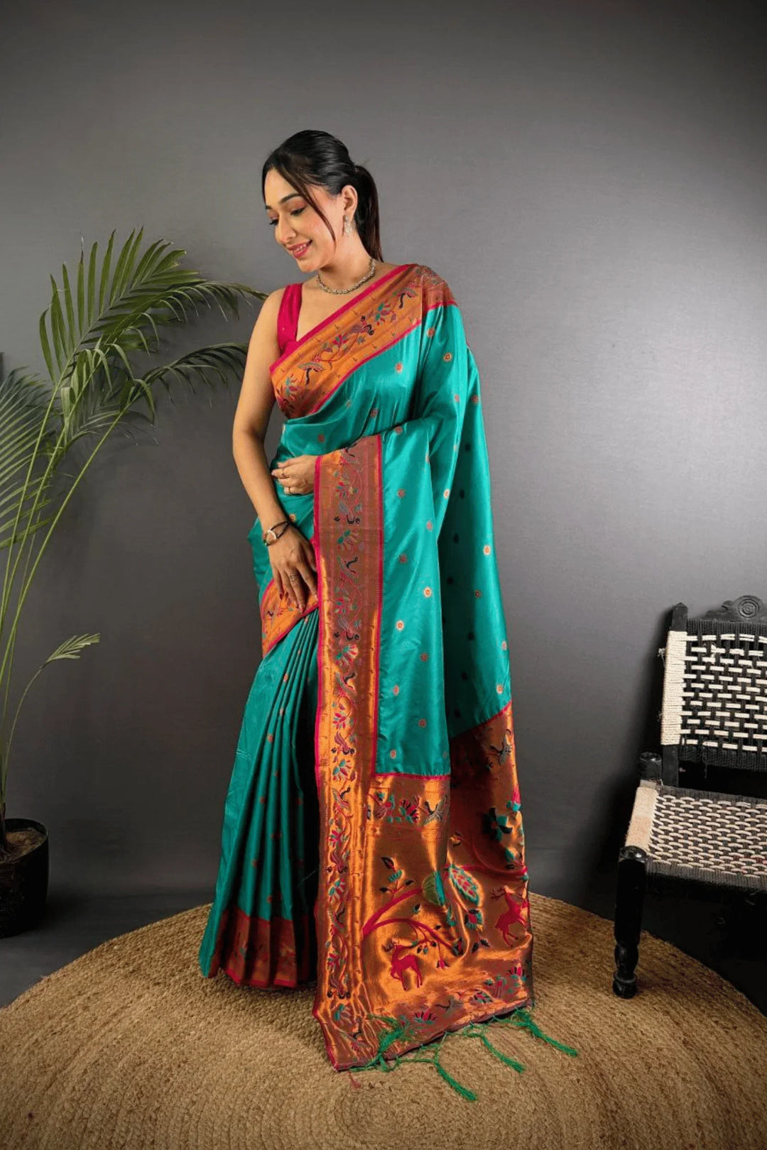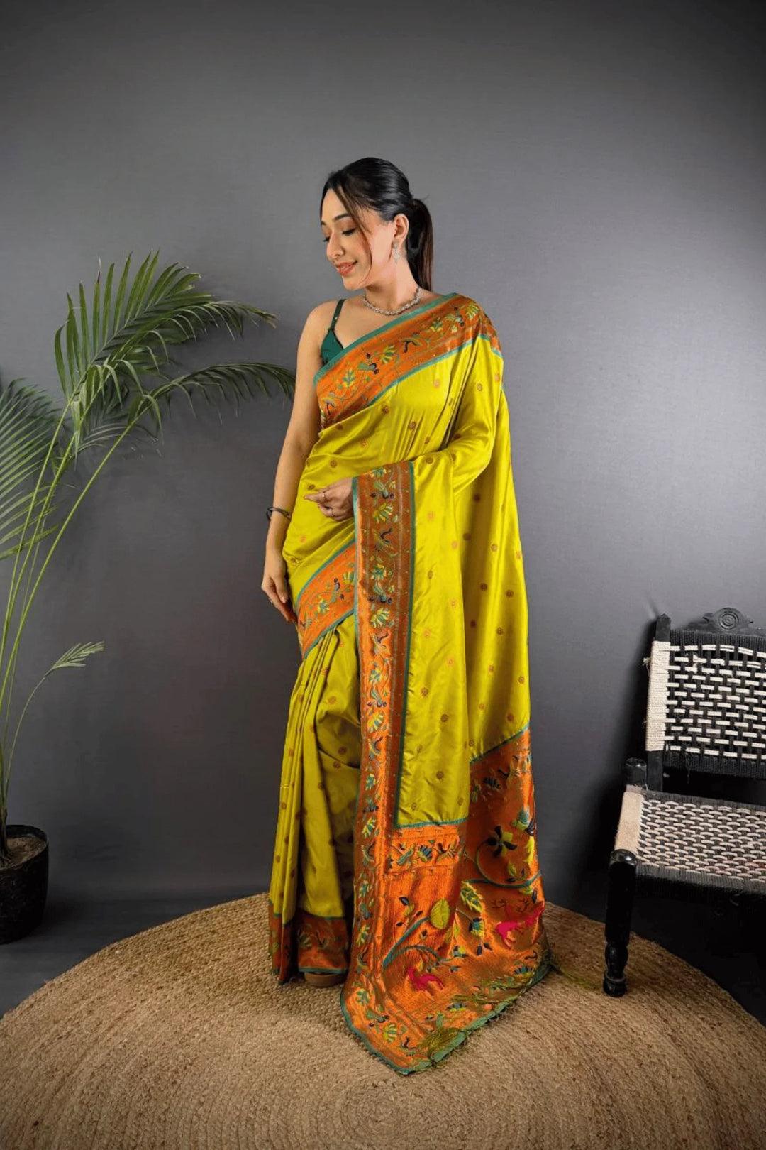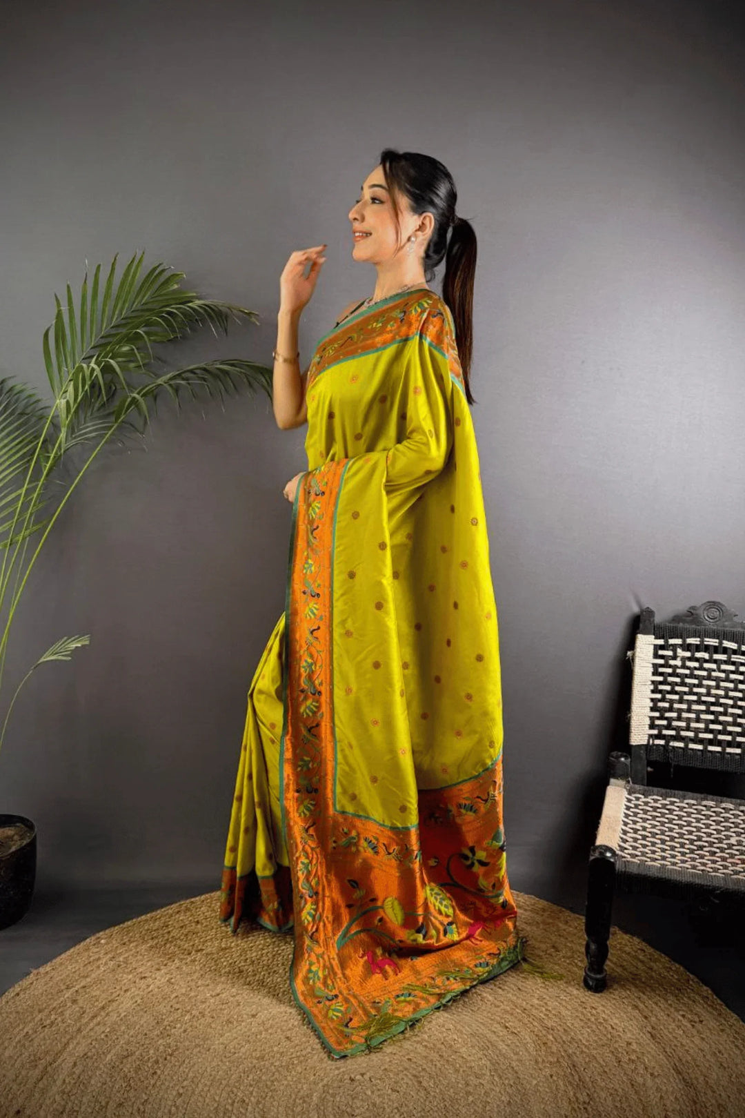 Drape yourself in the elegance of a Kashi Paithan— a pre-stitched paithani saree with Banarasi weaving. This saree is a perfect blend of traditional craftsmanship and modern ease, designed for the woman who owns every room she walks into.