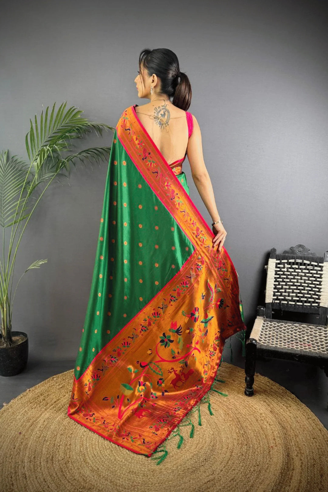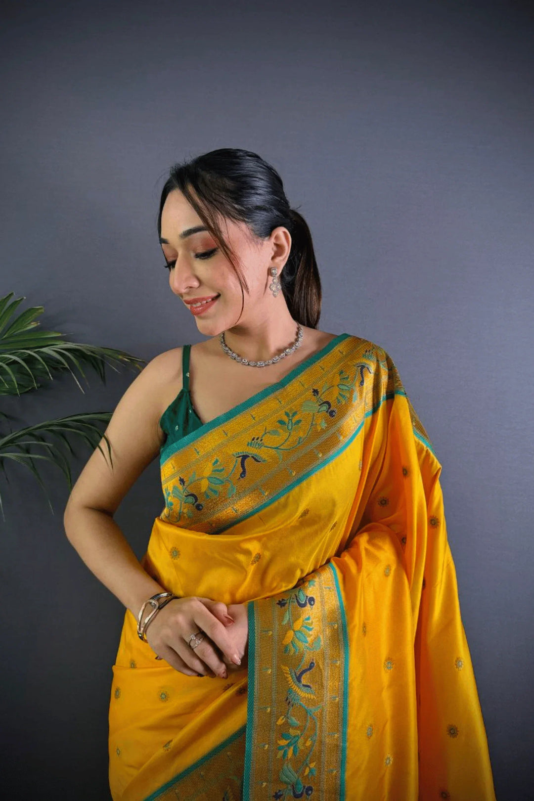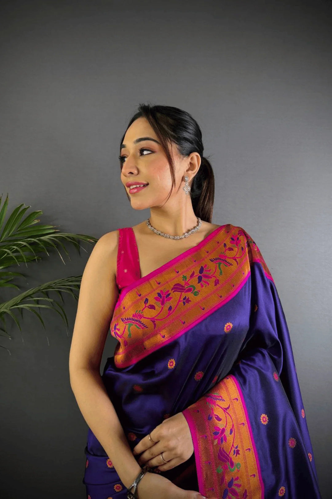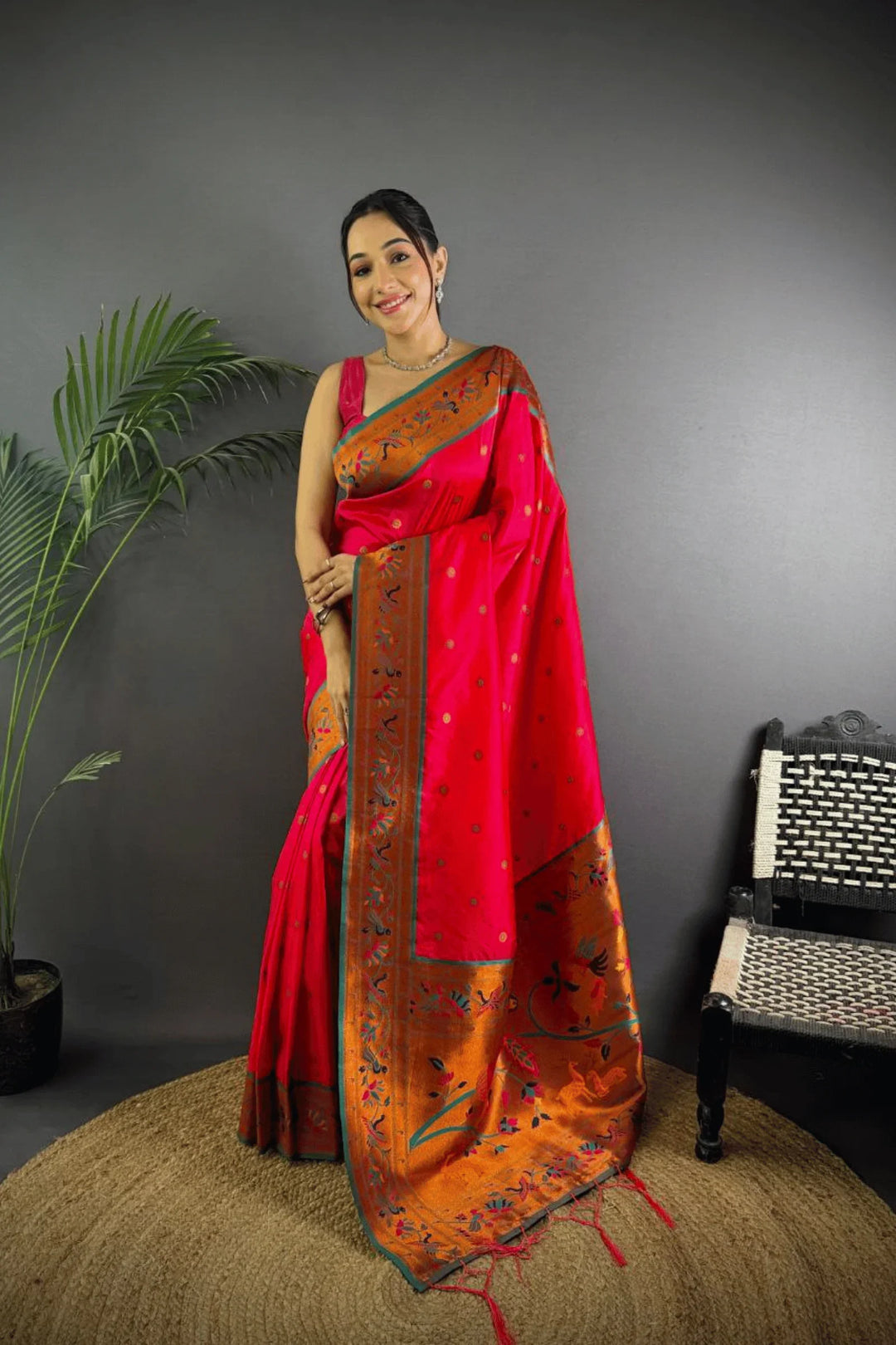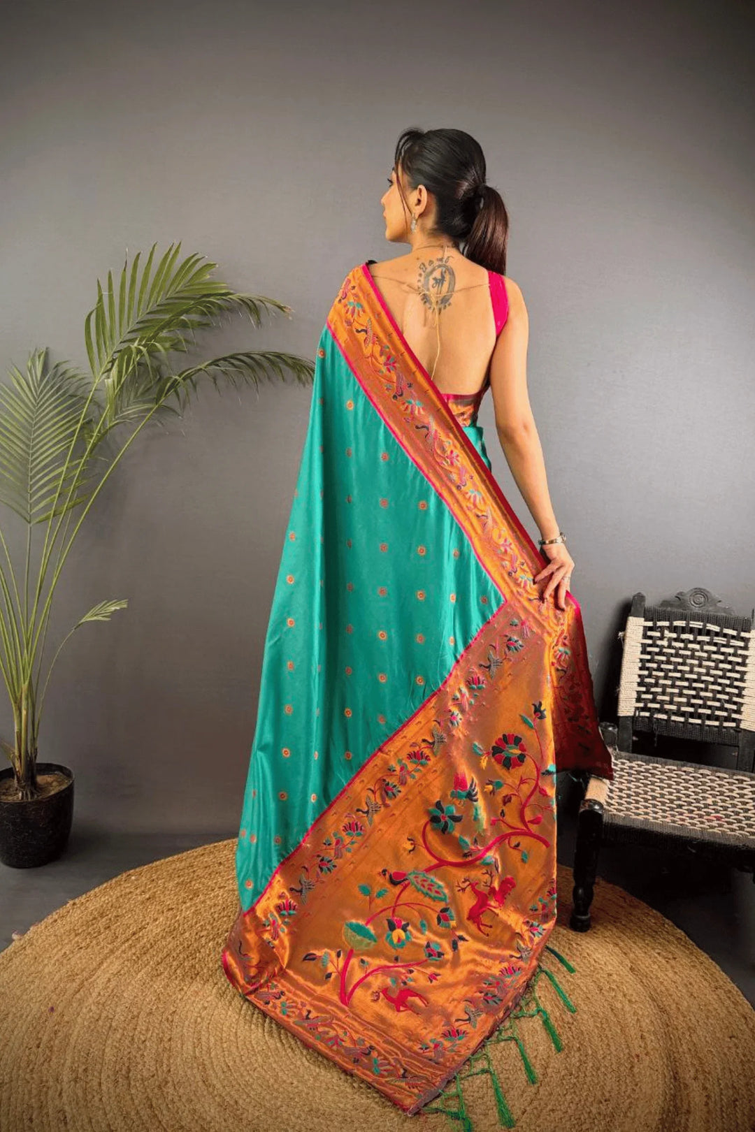 Drape yourself in the elegance of a Kashi Paithan— a pre-stitched paithani saree with Banarasi weaving. This saree is a perfect blend of traditional craftsmanship and modern ease, designed for the woman who owns every room she walks into.