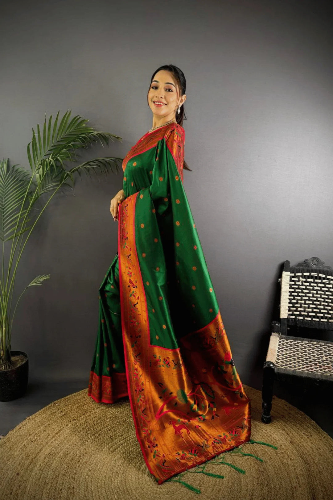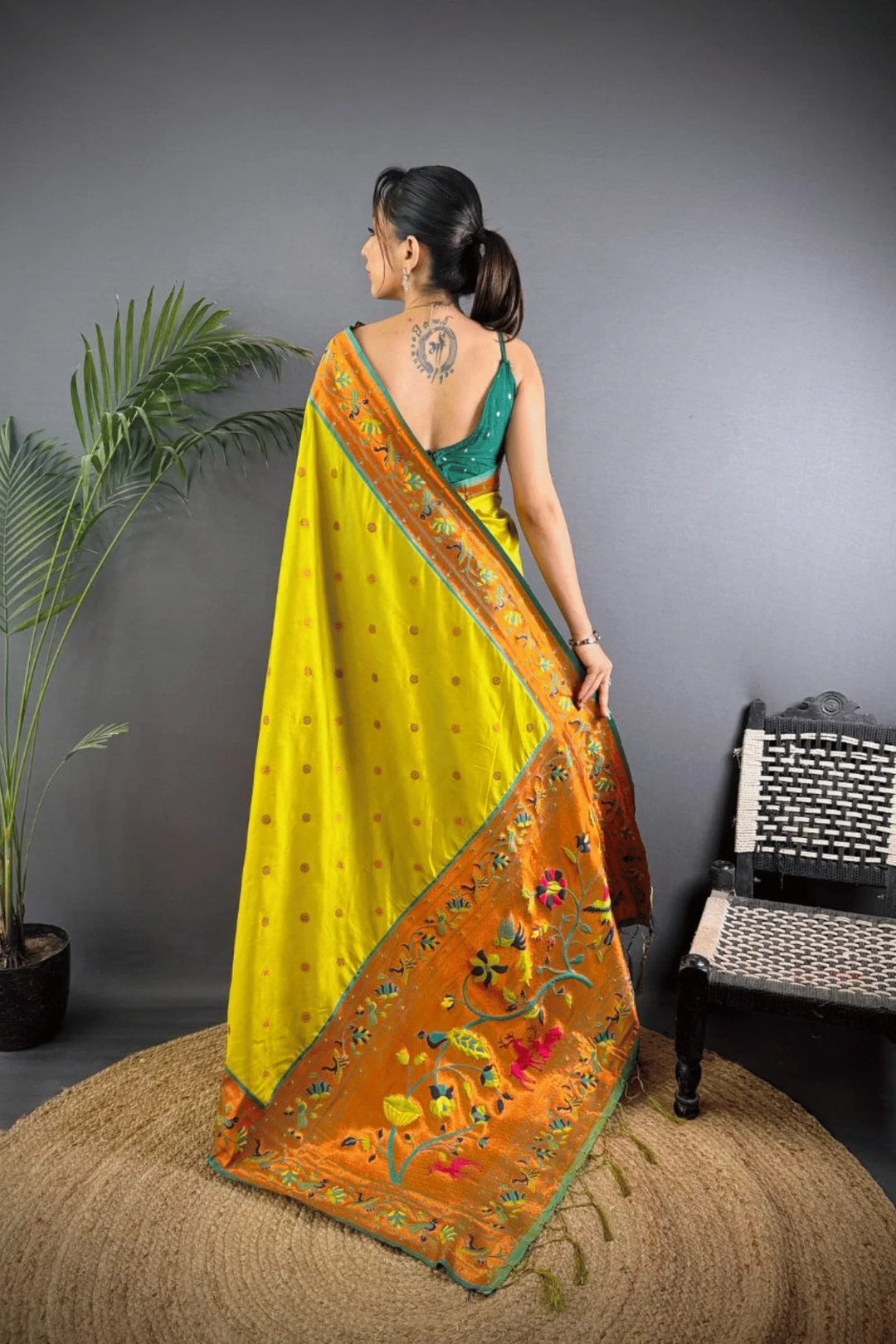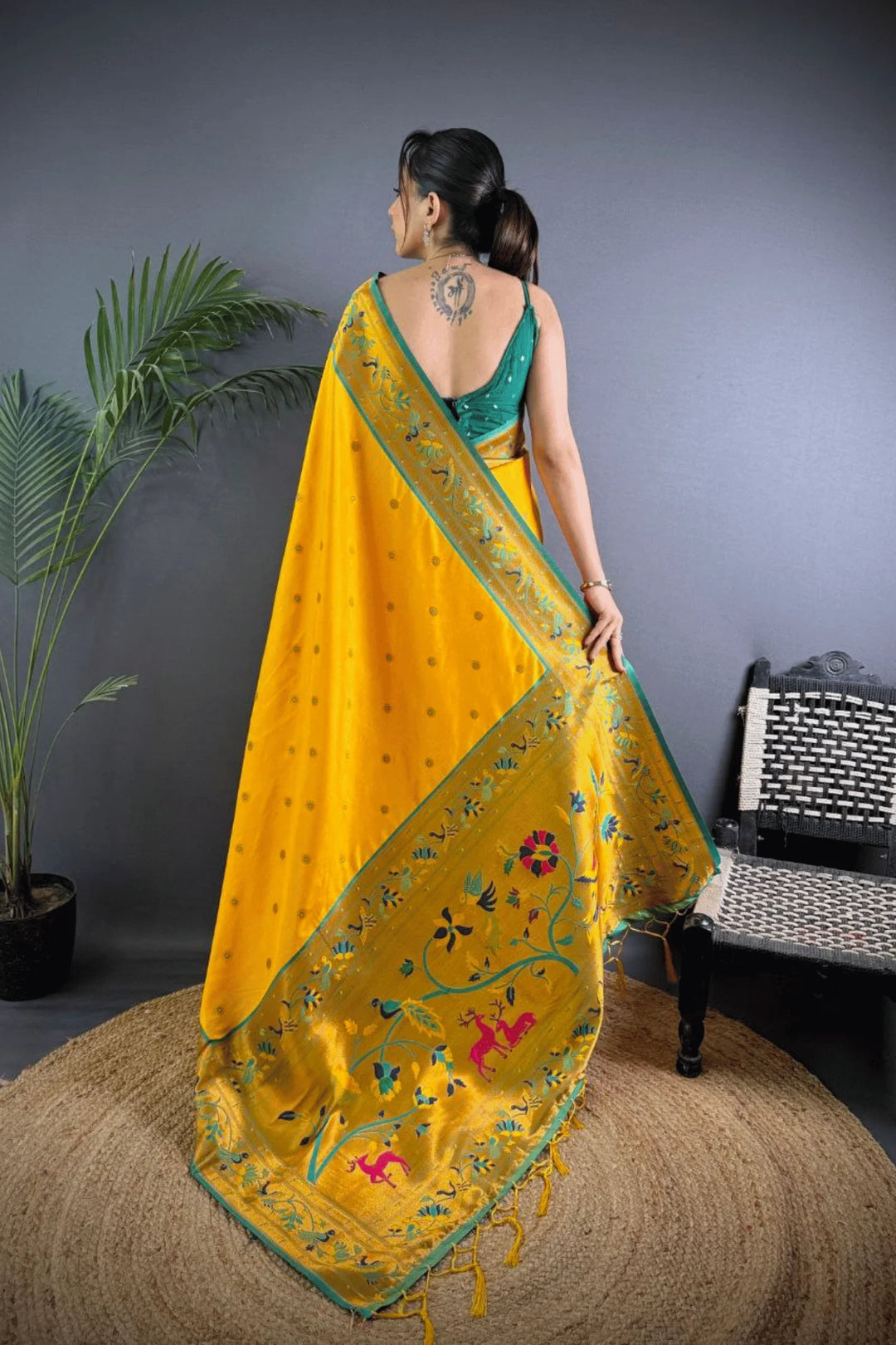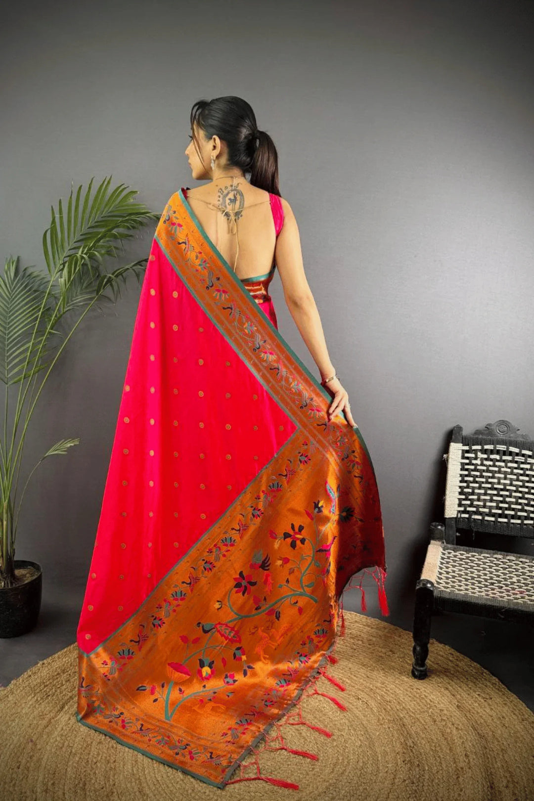 Drape yourself in the elegance of a Kashi Paithan— a pre-stitched paithani saree with Banarasi weaving. This saree is a perfect blend of traditional craftsmanship and modern ease, designed for the woman who owns every room she walks into.