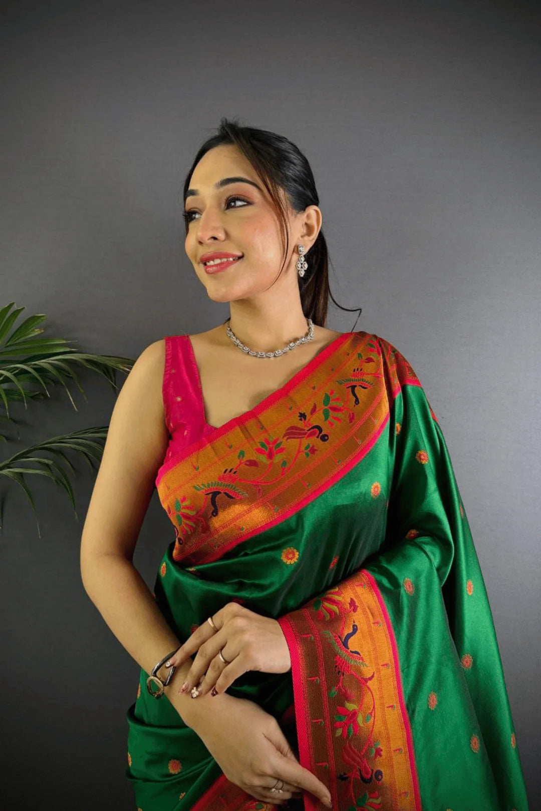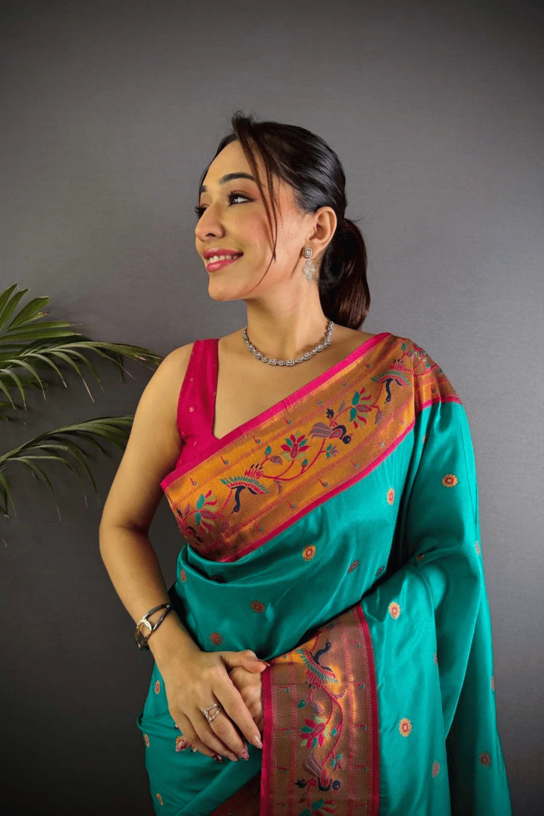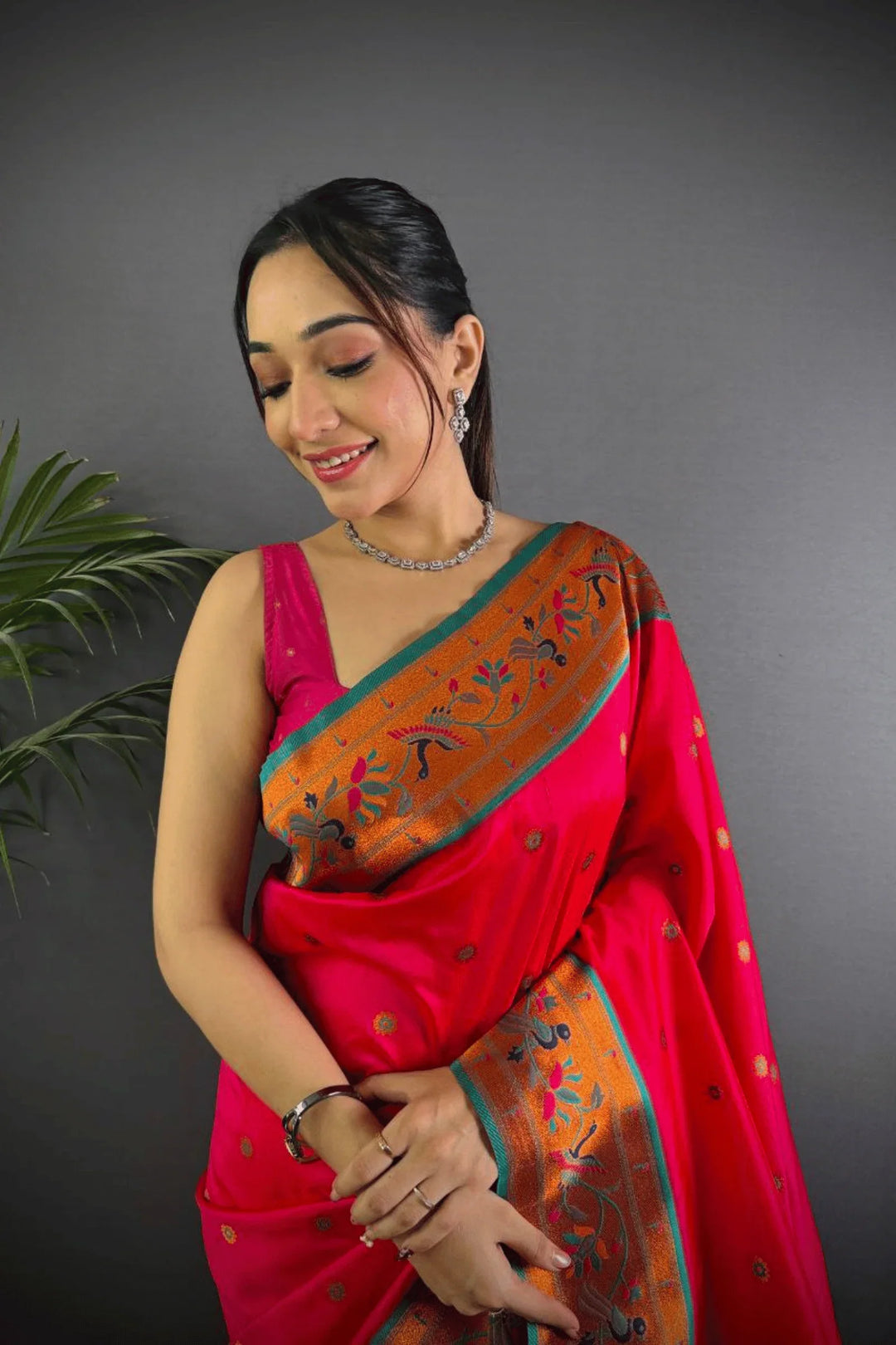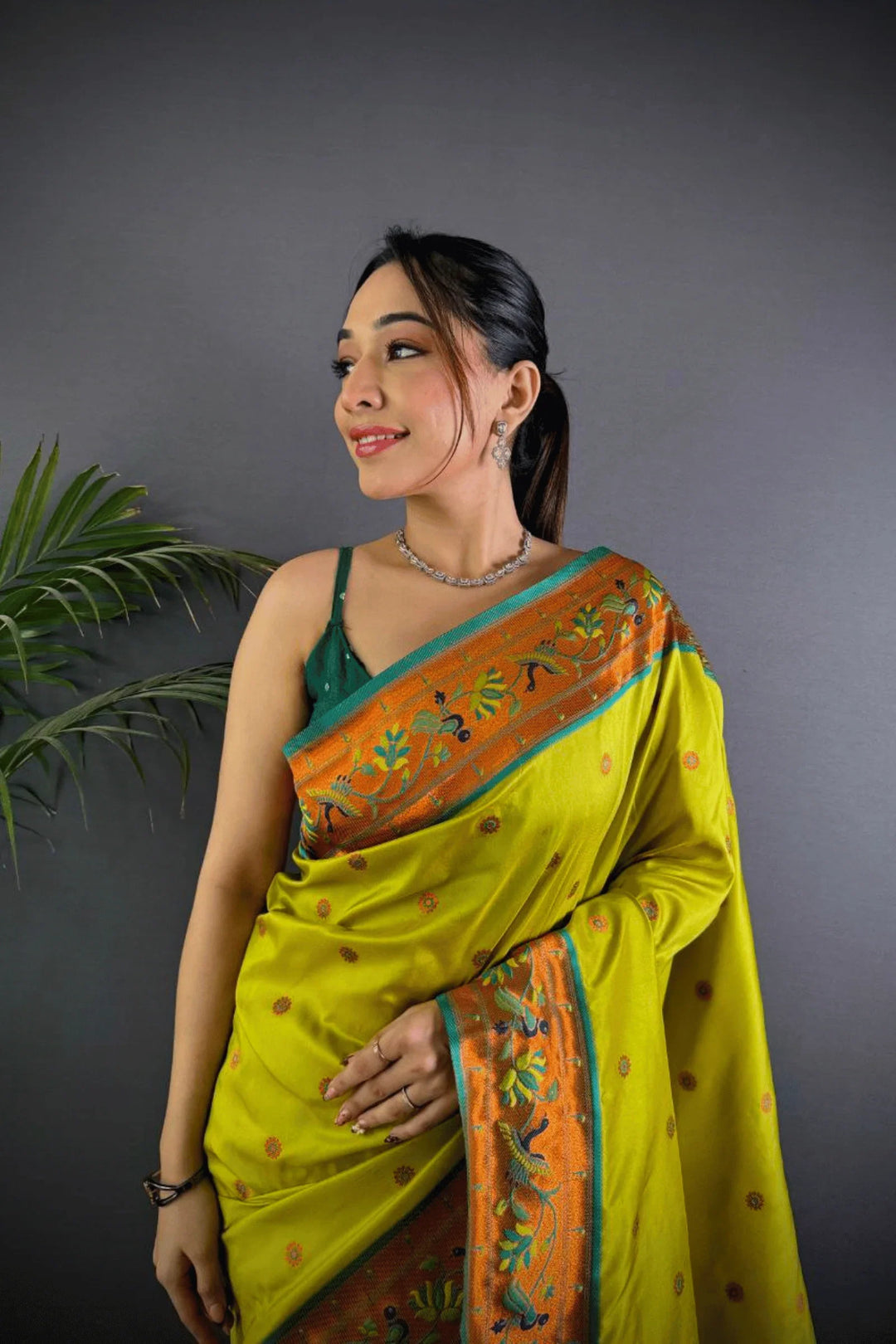 Drape yourself in the elegance of a Kashi Paithan— a pre-stitched paithani saree with Banarasi weaving. This saree is a perfect blend of traditional craftsmanship and modern ease, designed for the woman who owns every room she walks into.