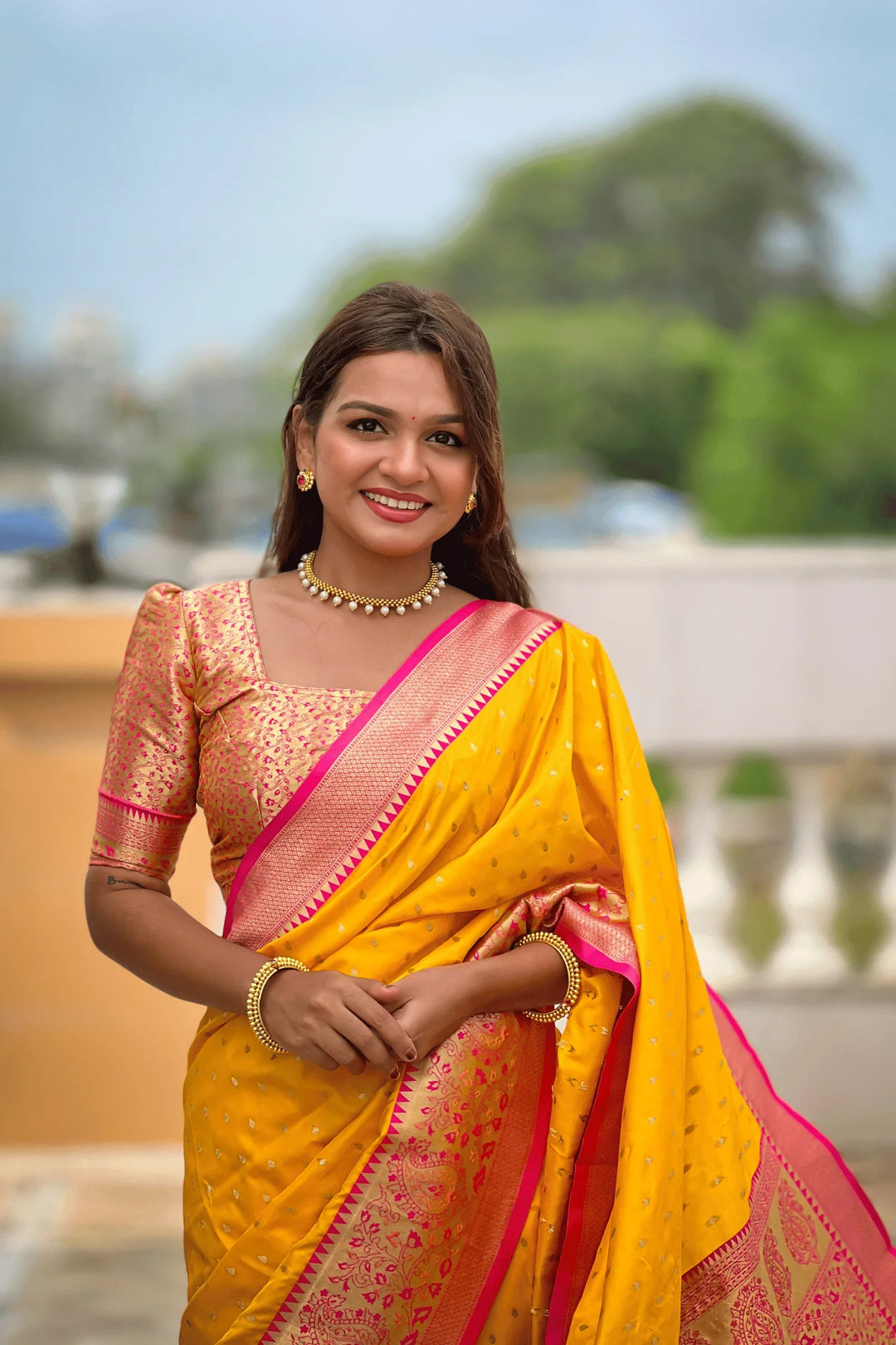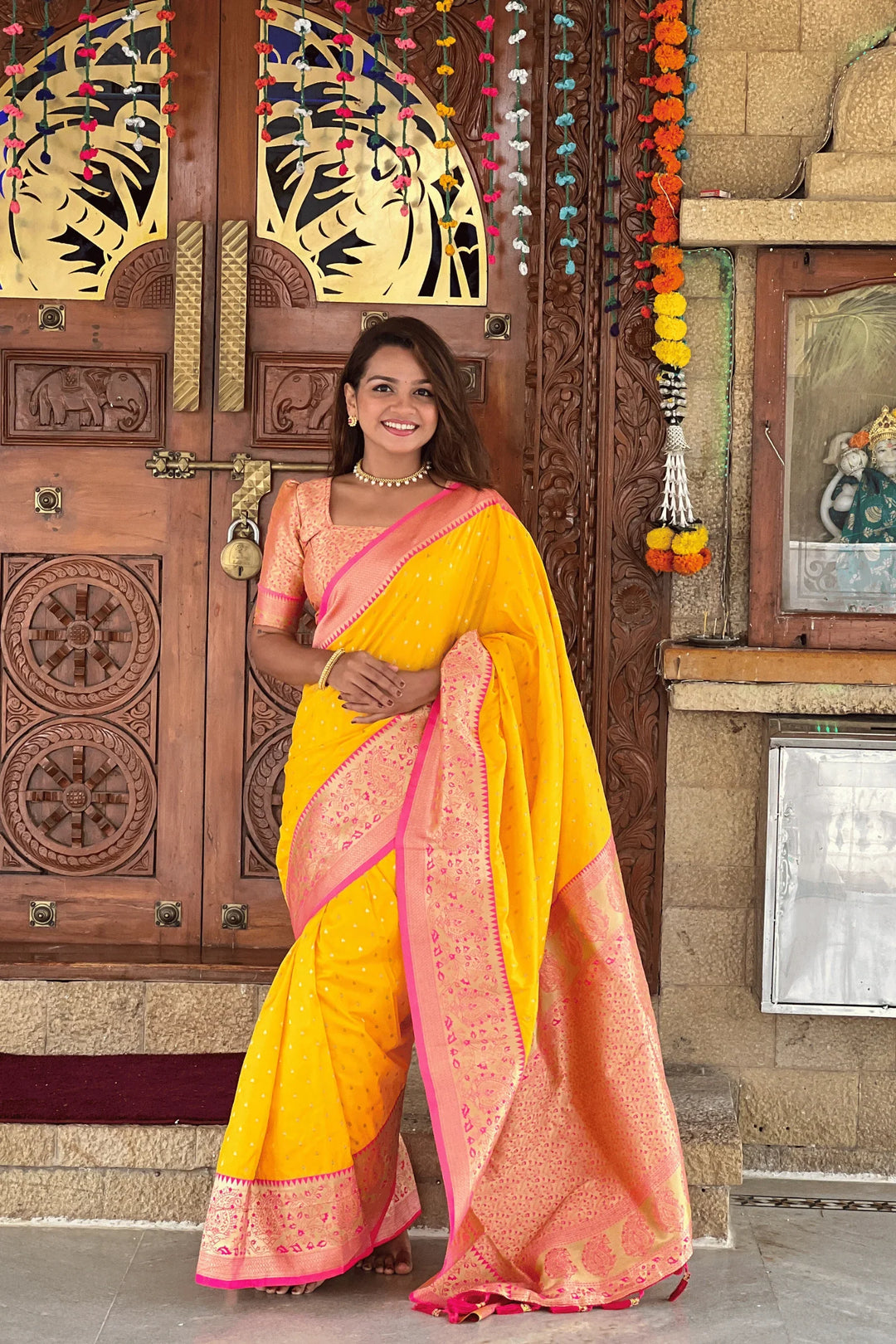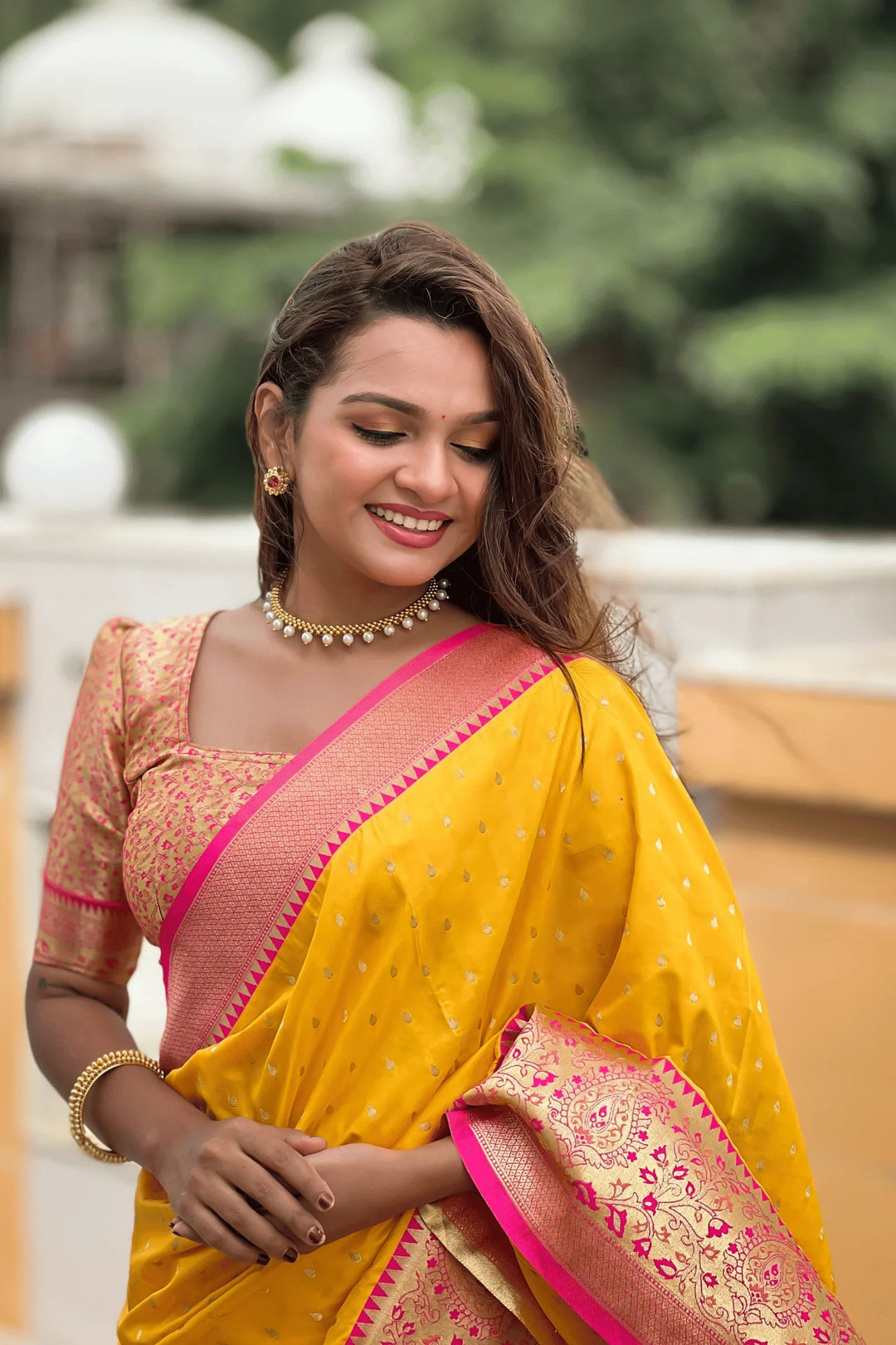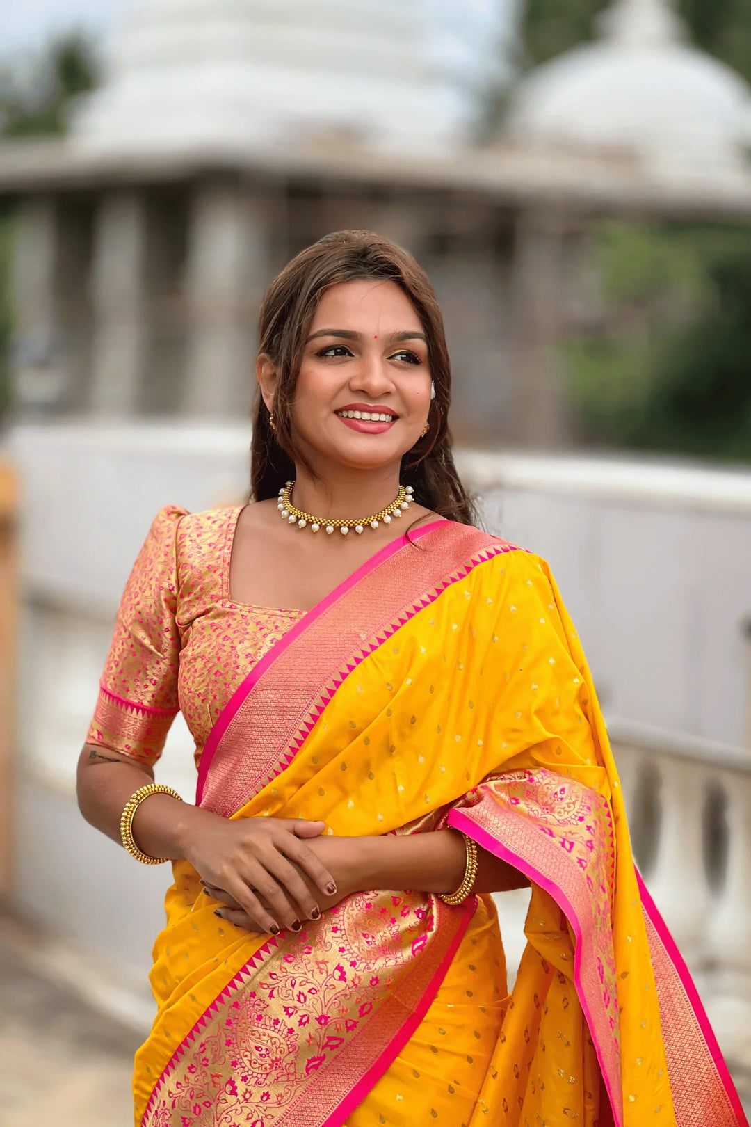 Introducing the Glamwiz Yellow Paithani Banarasi Silk Saree. The saree has vibrant geometrical border with sophisticated pattern, ideal for office wear and social gatherings.