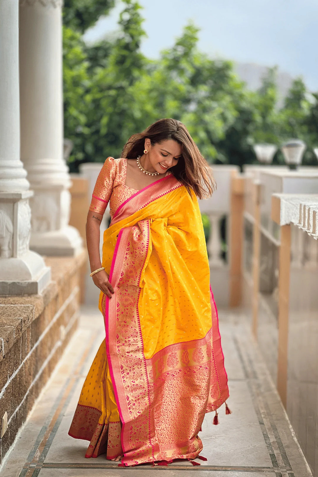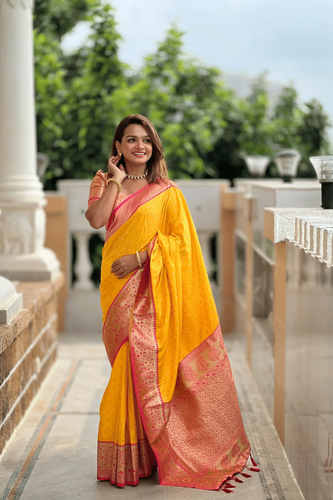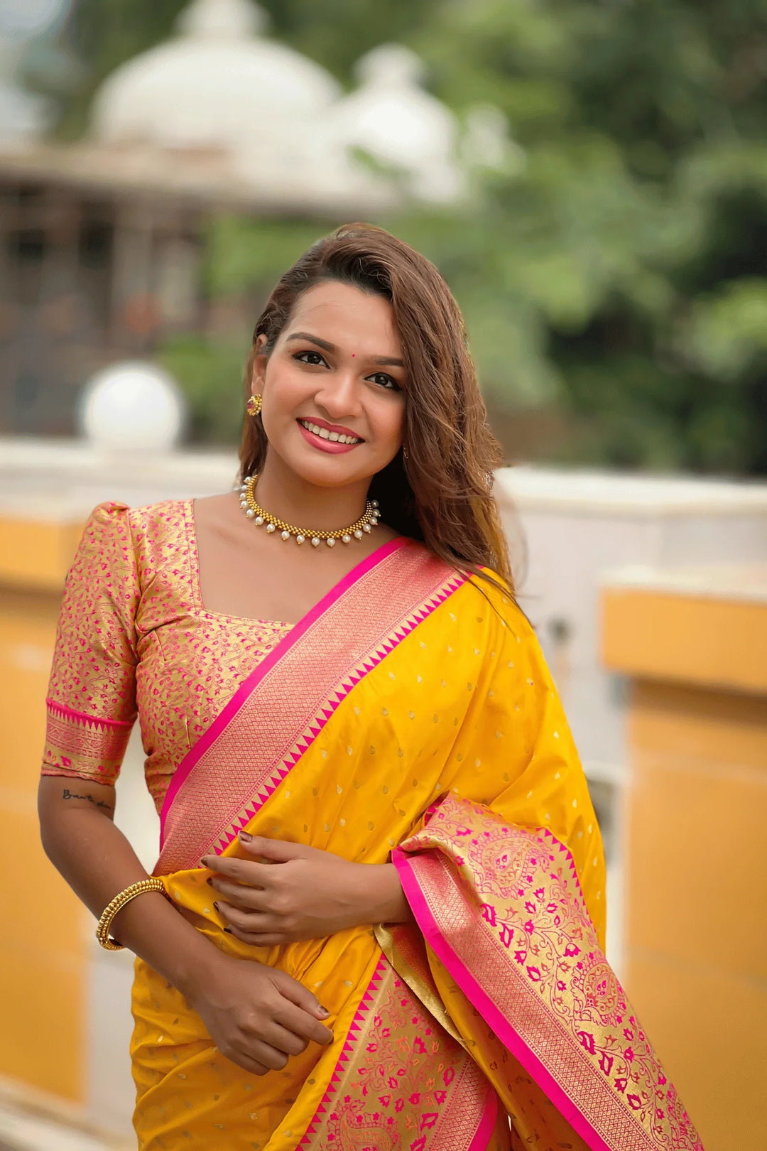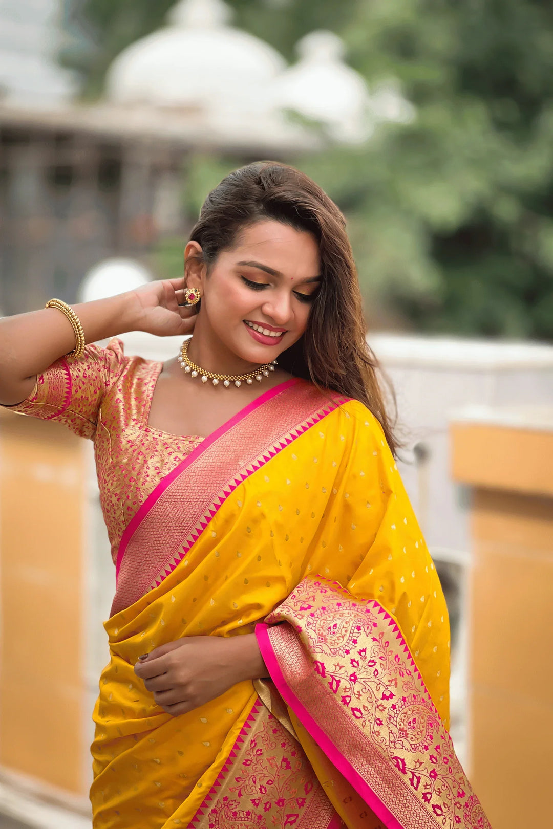 Introducing the Glamwiz Yellow Paithani Banarasi Silk Saree. The saree has vibrant geometrical border with sophisticated pattern, ideal for office wear and social gatherings.