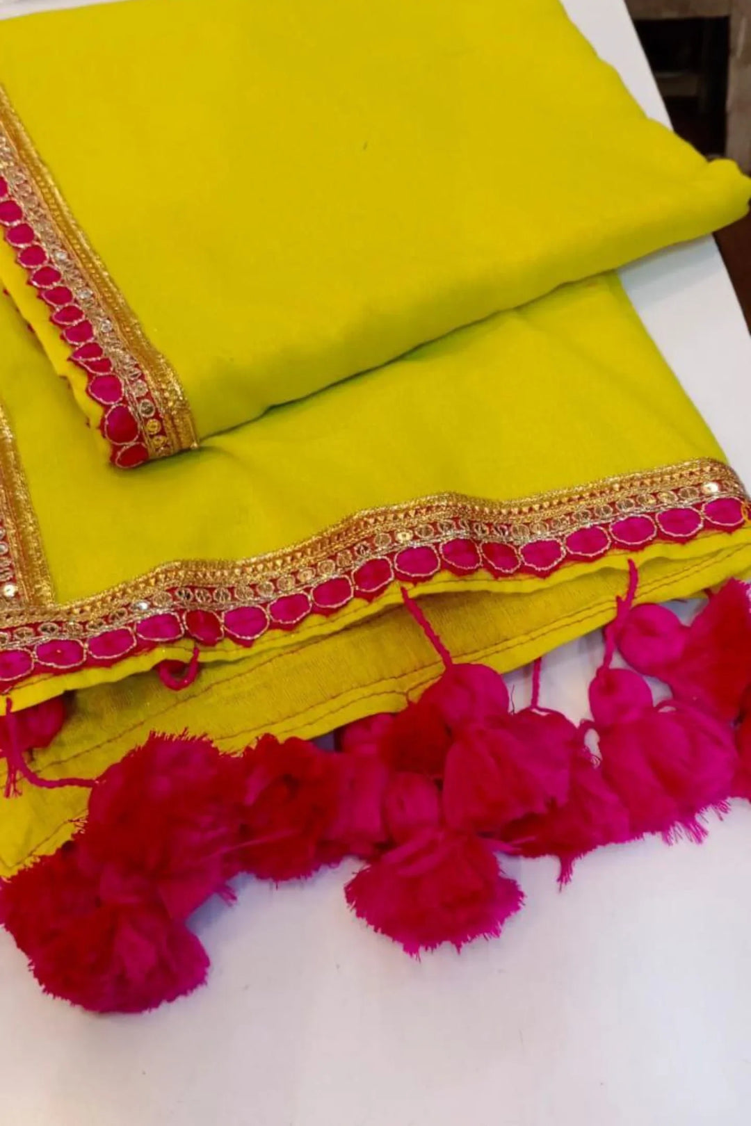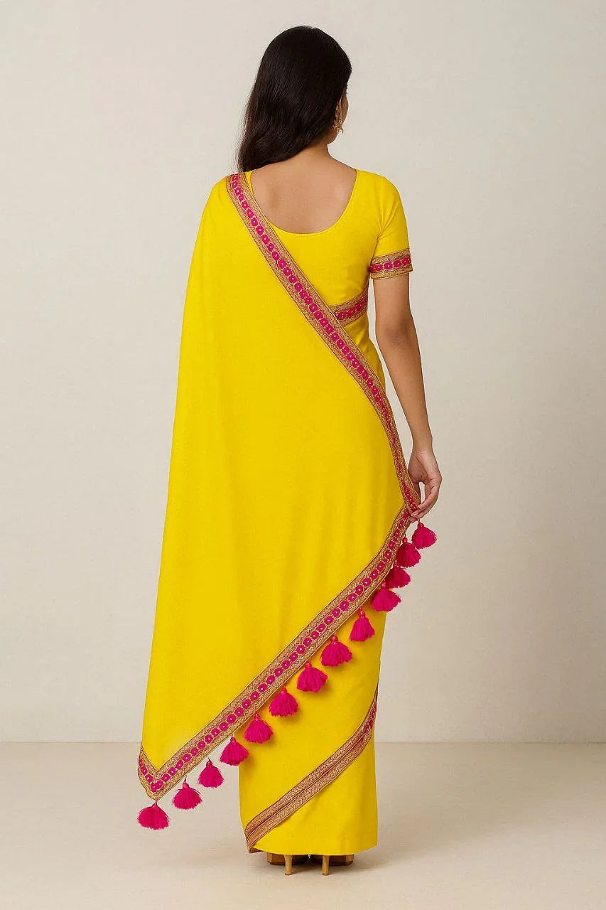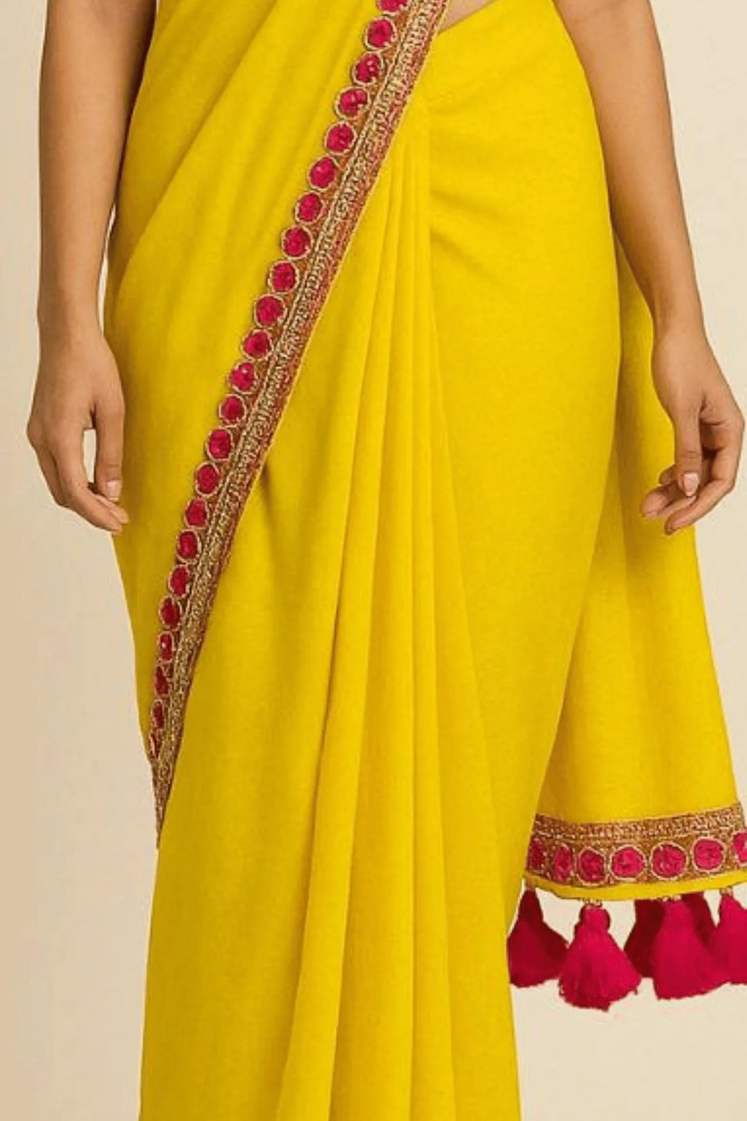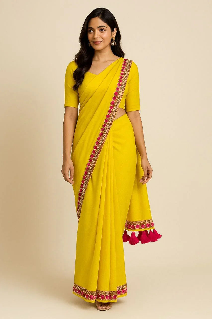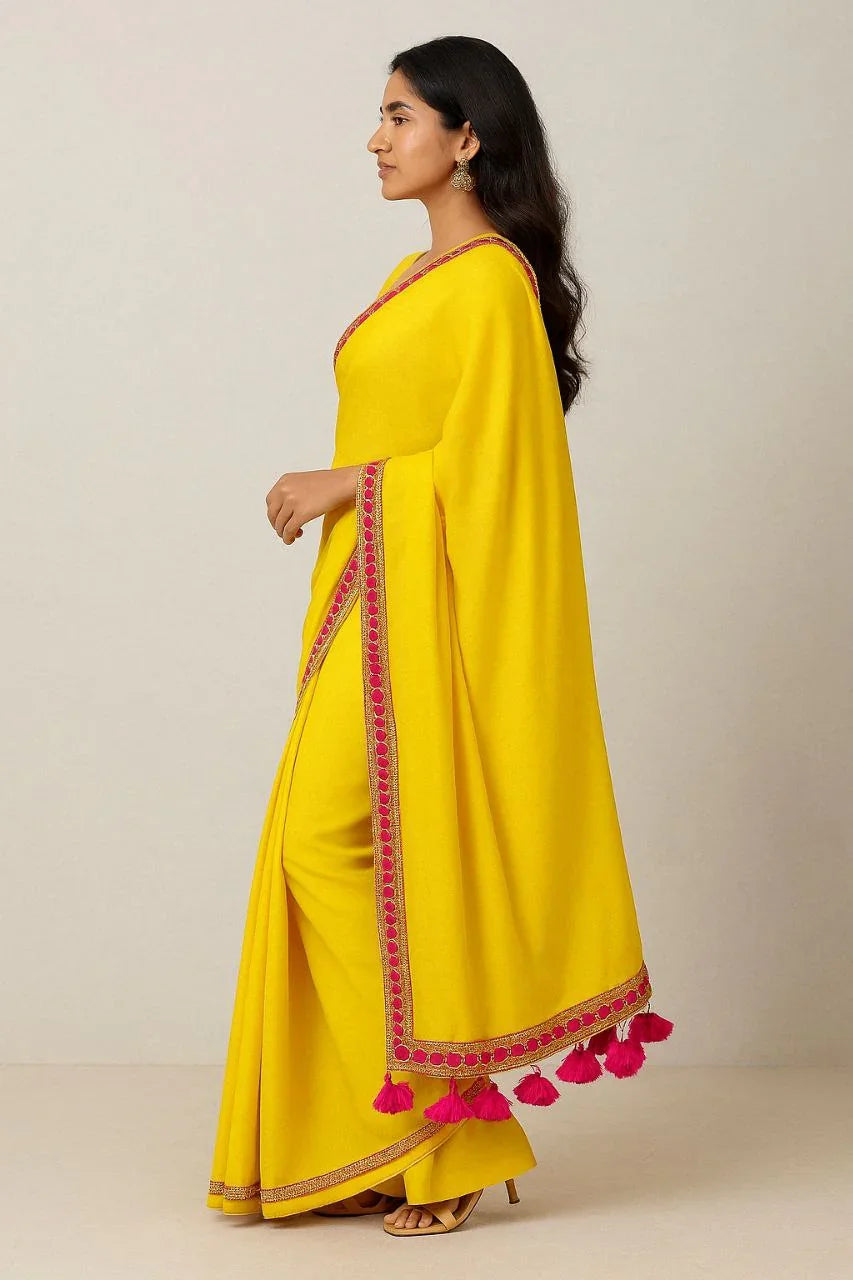 Radiate sunshine and confidence in this vibrant yellow mul cotton saree, enhanced with playful pinktassels and border for that extra pop of personality. Crafted in soft, breathable mul cotton, this saree is designed to keep you cool and stylish all day long.