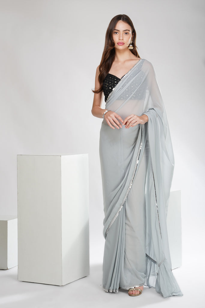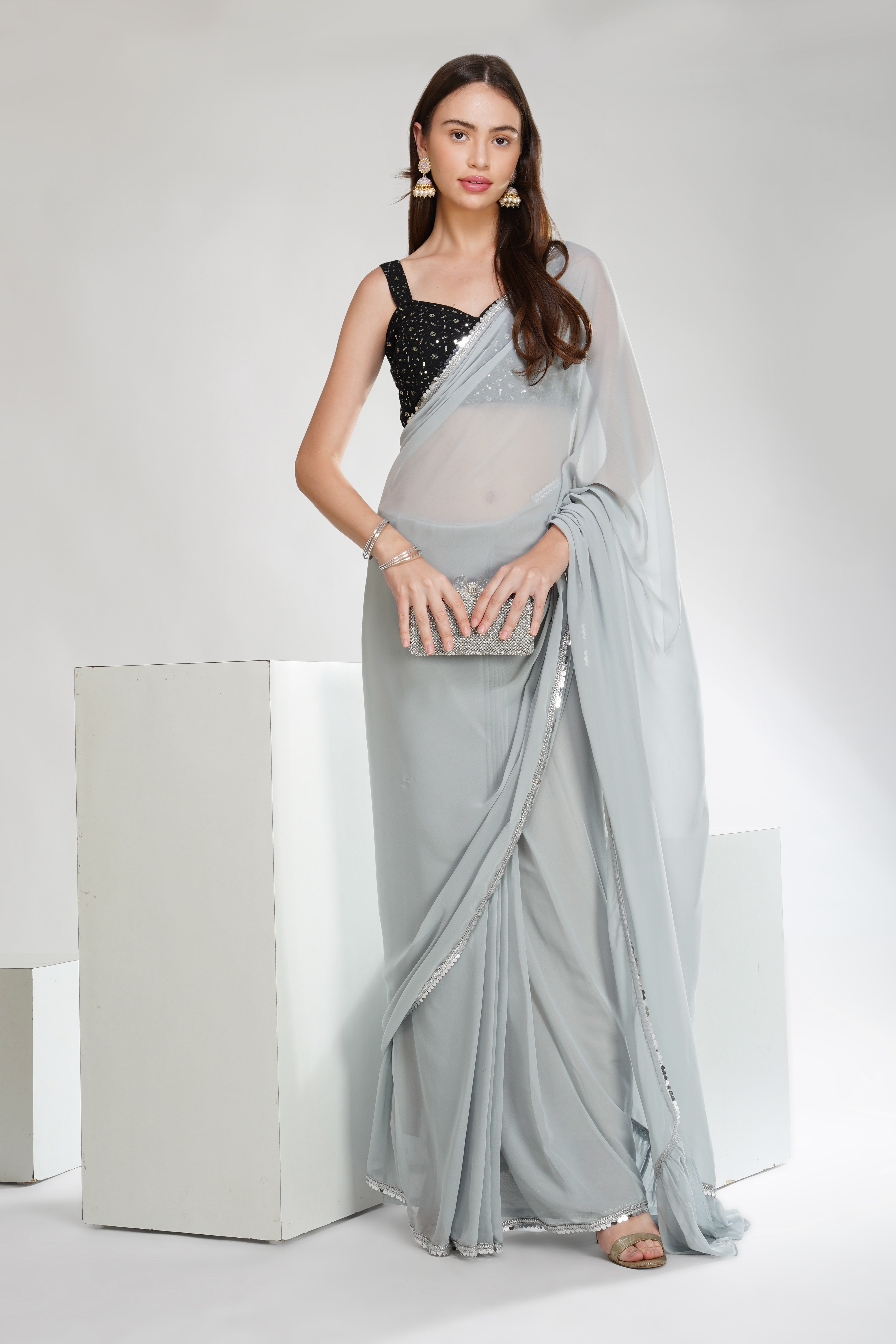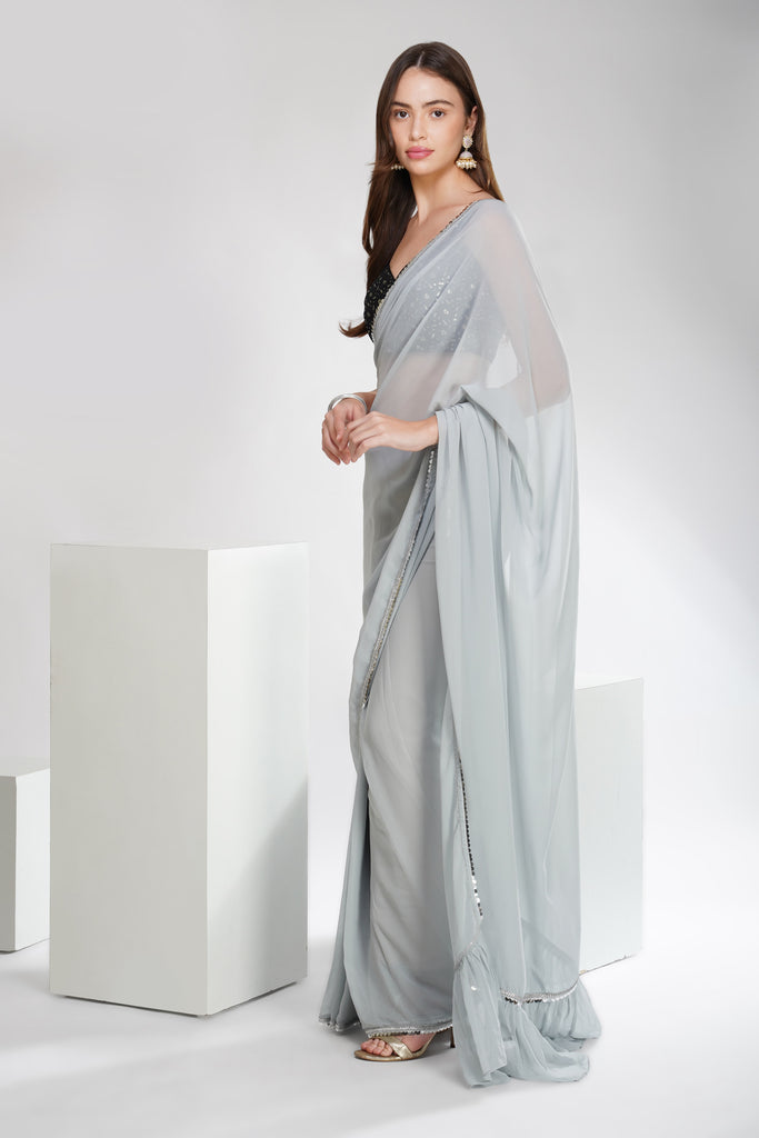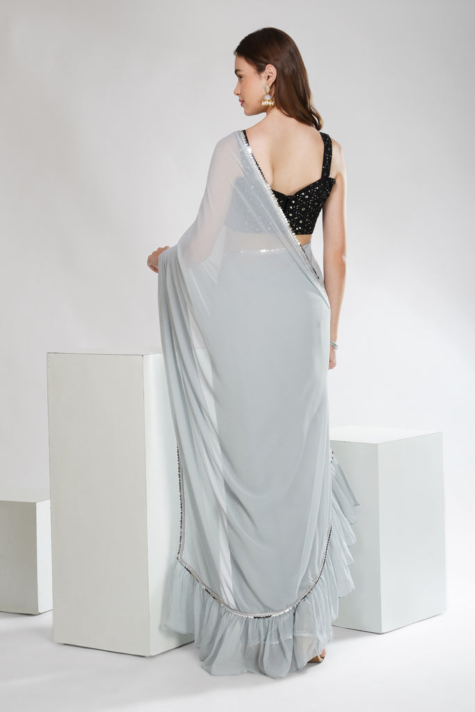 - One "Misty Grey" 1-Minute Ruffle Georgette Saree.