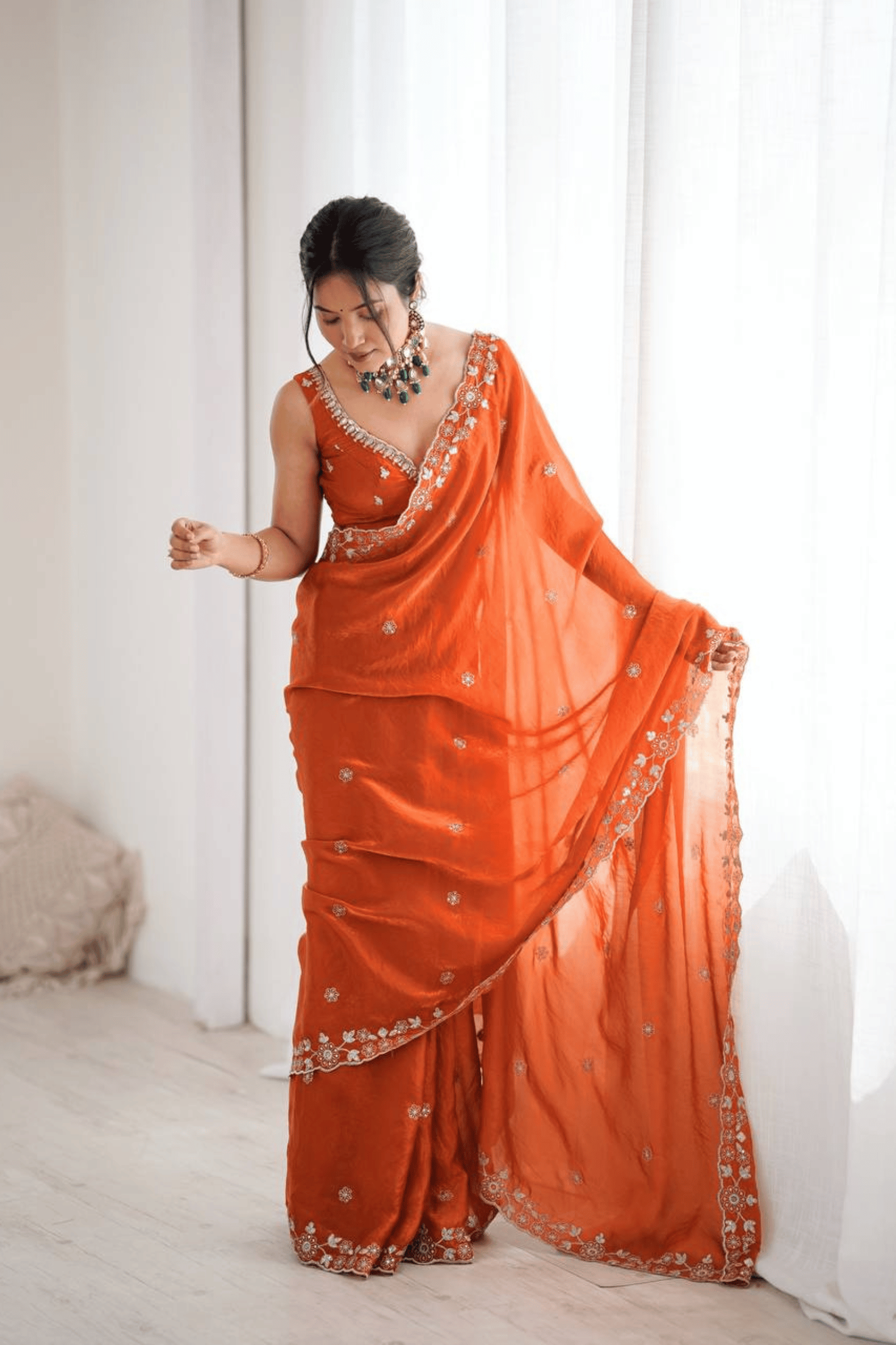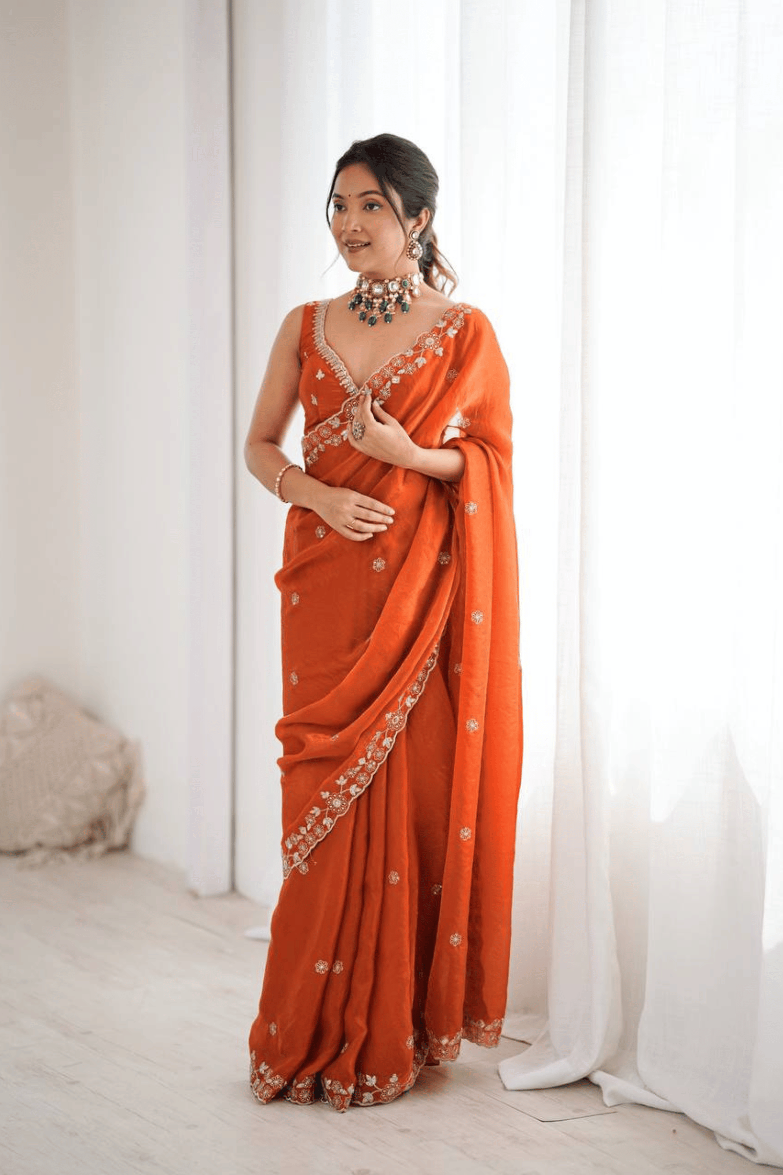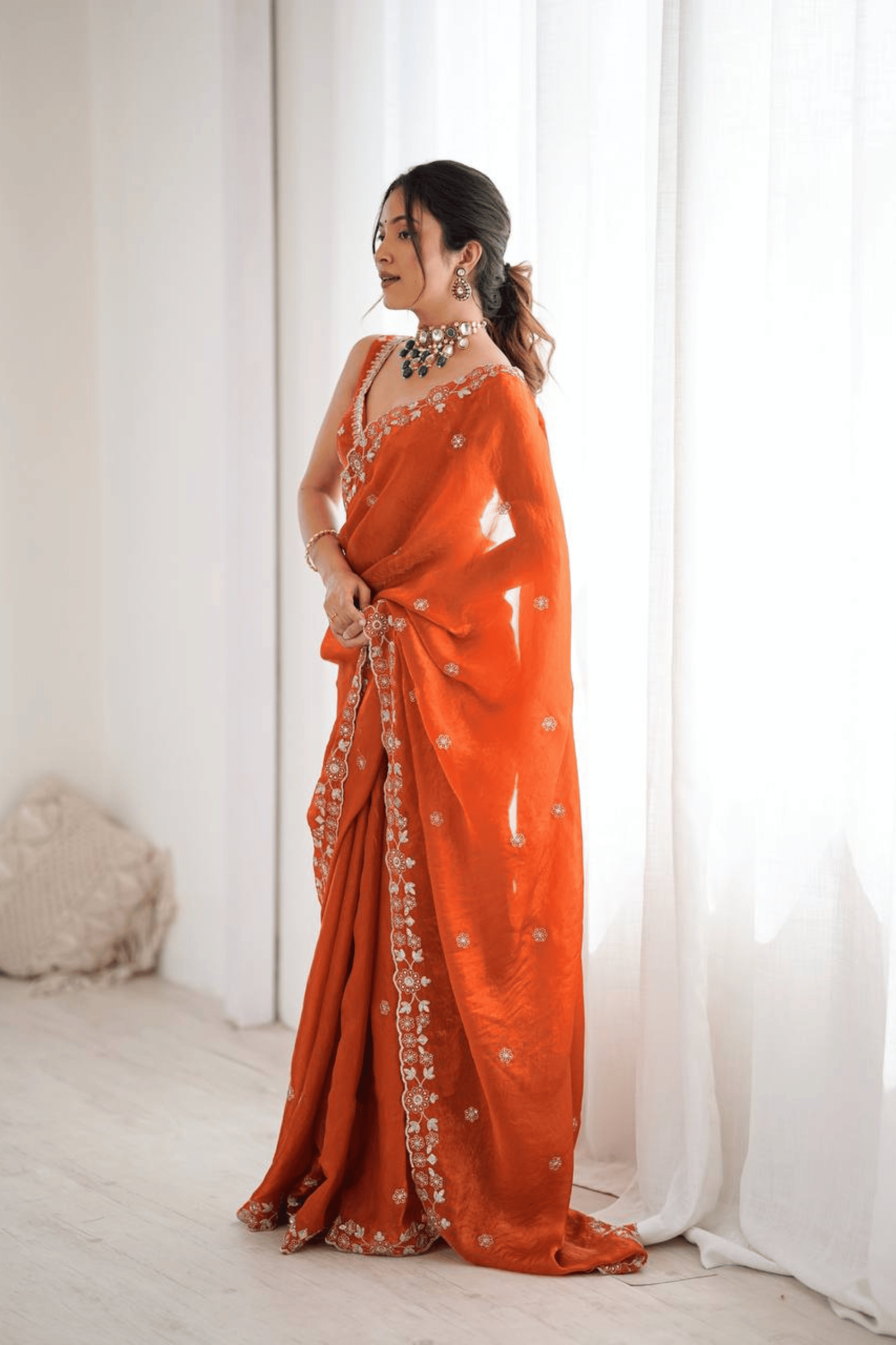 This ready-to-wear orange organza Glamwiz saree is a celebration of lightness, grace, and effortless charm. Delicately adorned with thread and sequins embroidery, its sheer, breezy fabric makes it perfect for daytime festivities, ceremonies, or garden weddings.